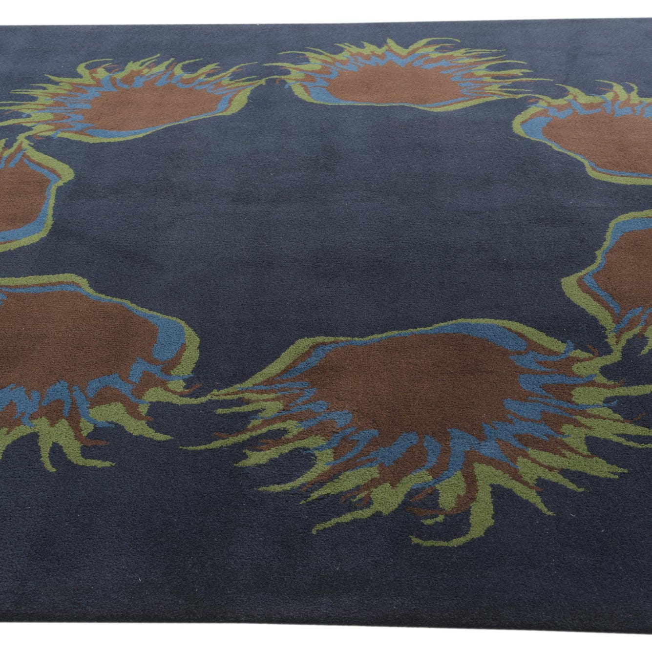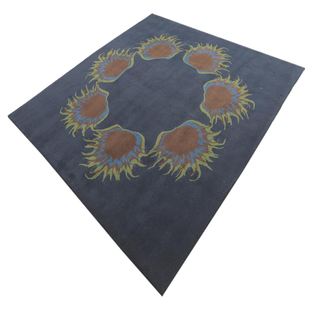 A square navy blue wool and cotton rug with a circular floral pattern featuring brown, green, and blue accents.