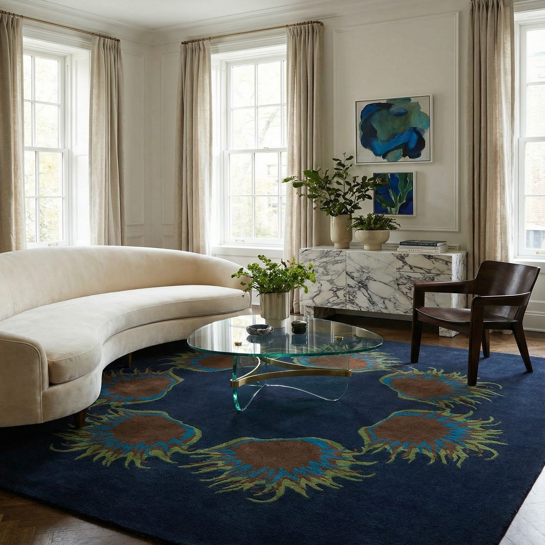 This square Luna collection rug, measuring 8 feet on each side, offers a bold and artistic statement with its hand-tufted construction of wool and cotton. The rug features a rich navy blue background that provides a deep canvas for the stylized floral pattern. The design showcases a series of distinct brown motifs with blue and green accents that radiate a lively yet sophisticated aesthetic.