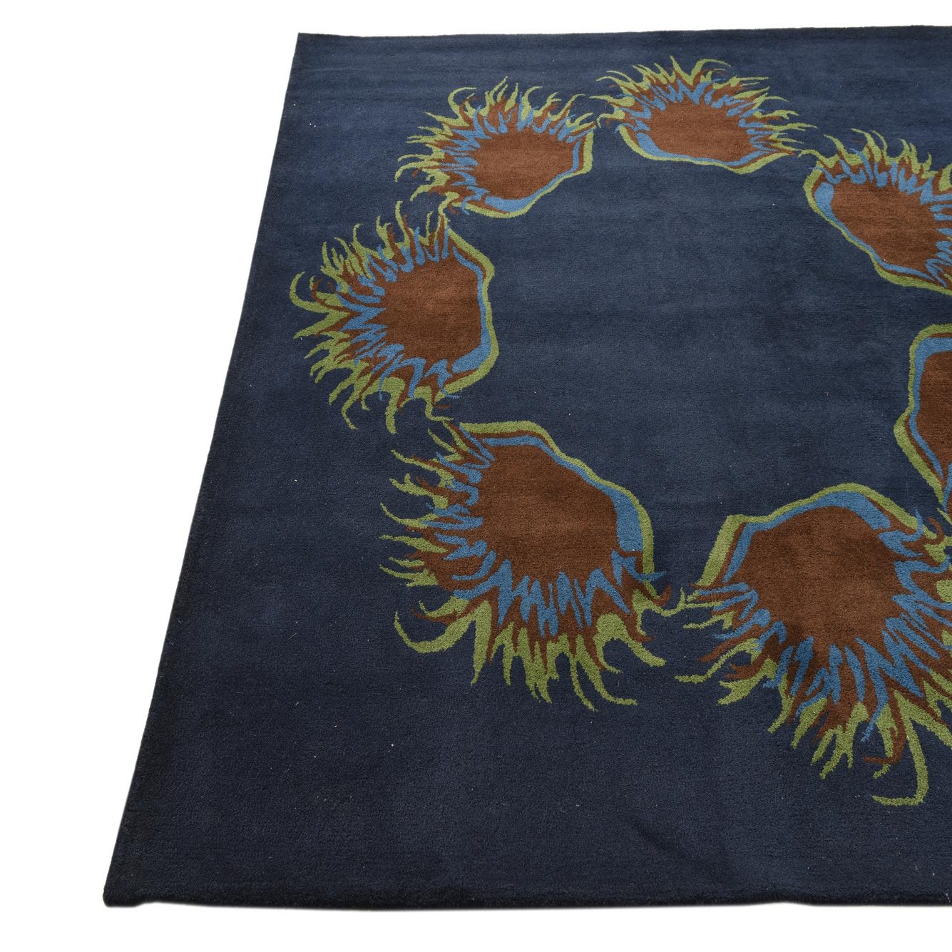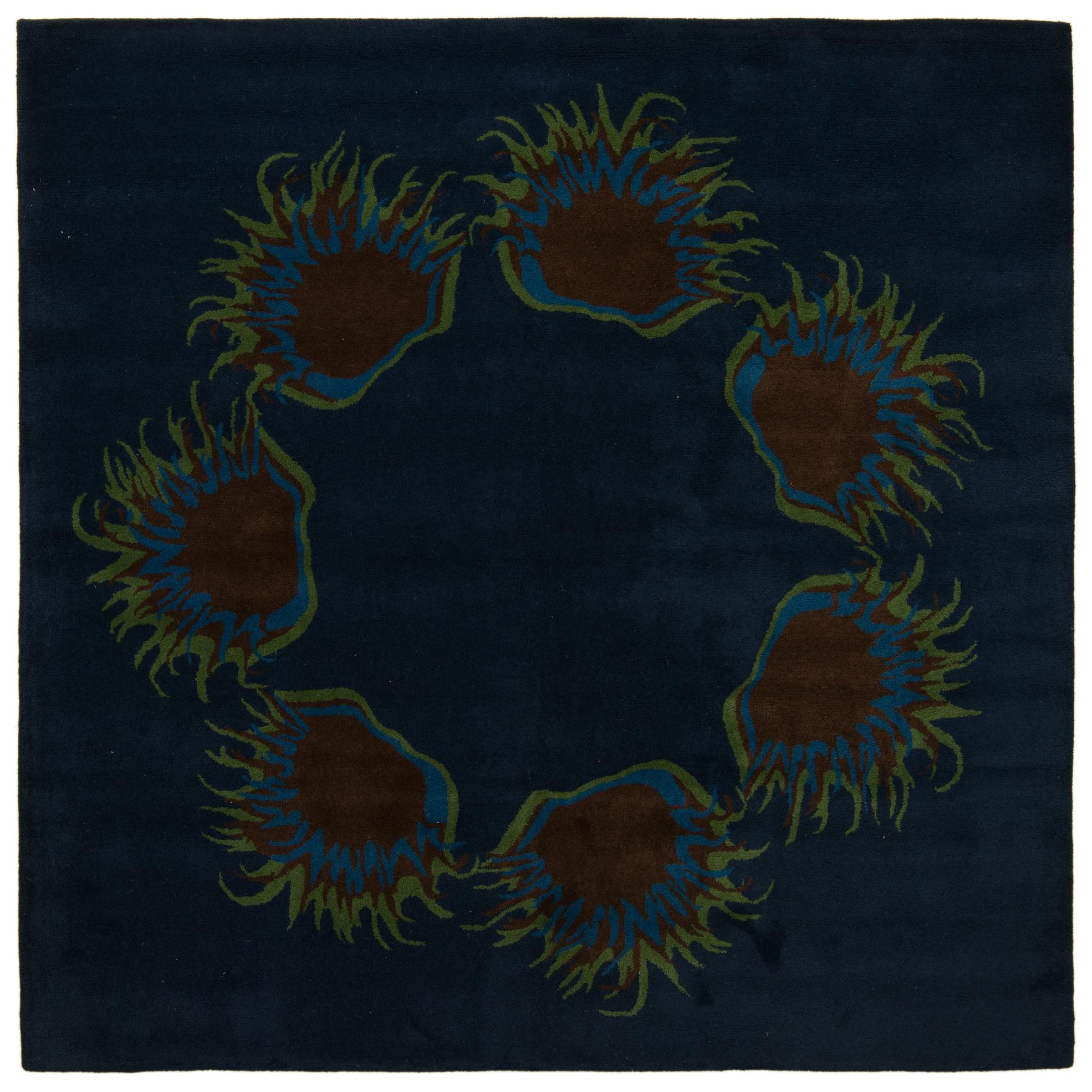 A square navy blue rug with a modern floral pattern featuring brown, blue, and green abstract shapes arranged in a circle.