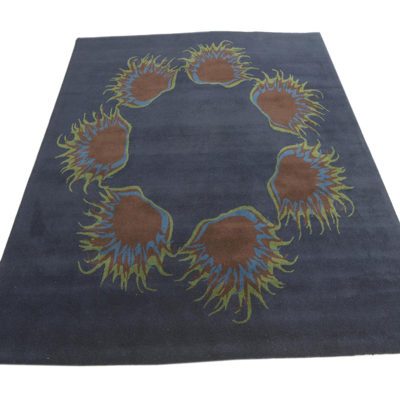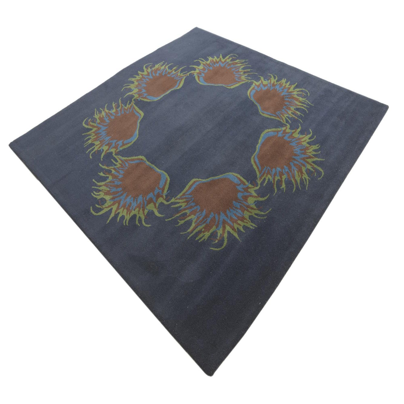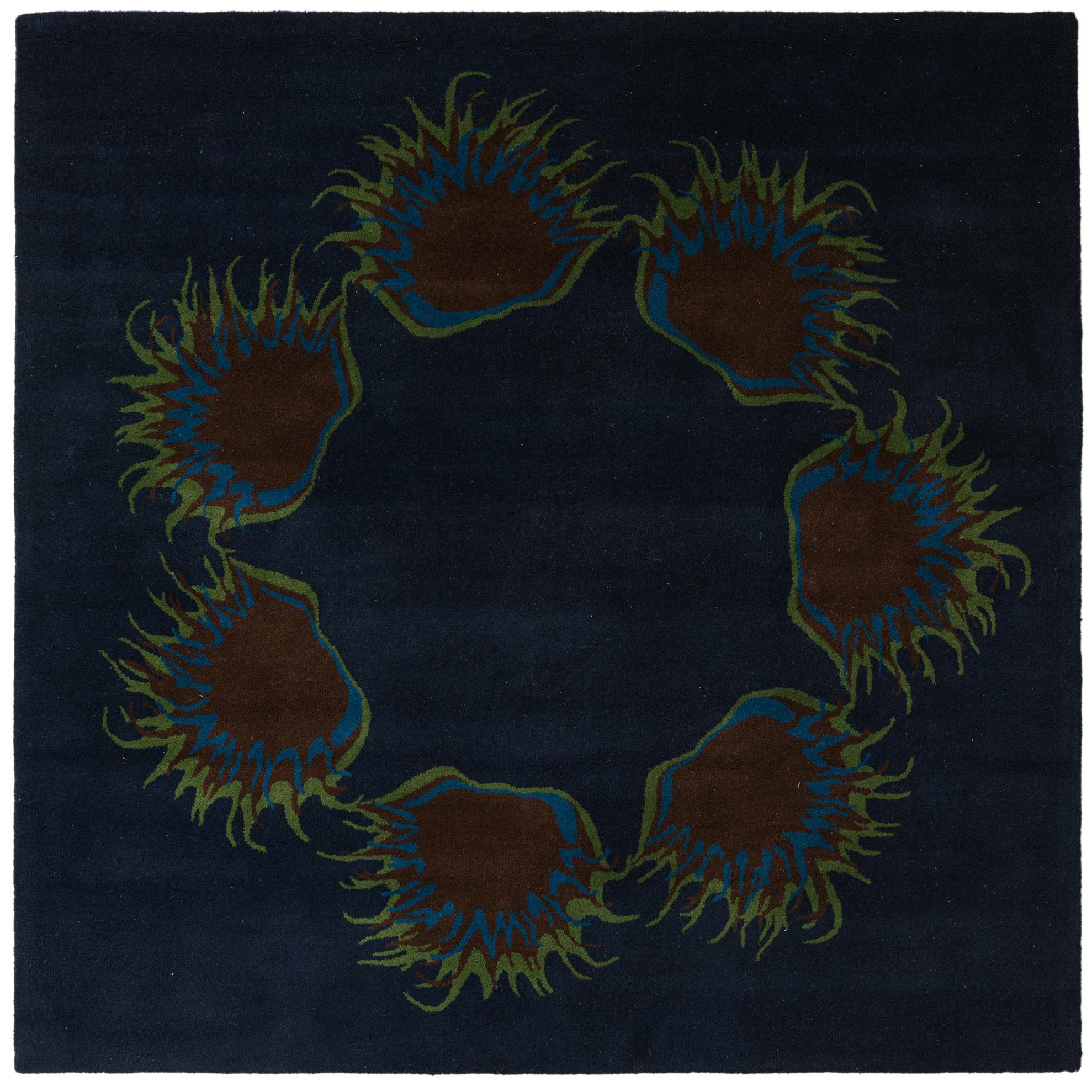 A square navy blue wool rug featuring a circular pattern of abstract brown, blue, and green shapes, resembling sea anemones.