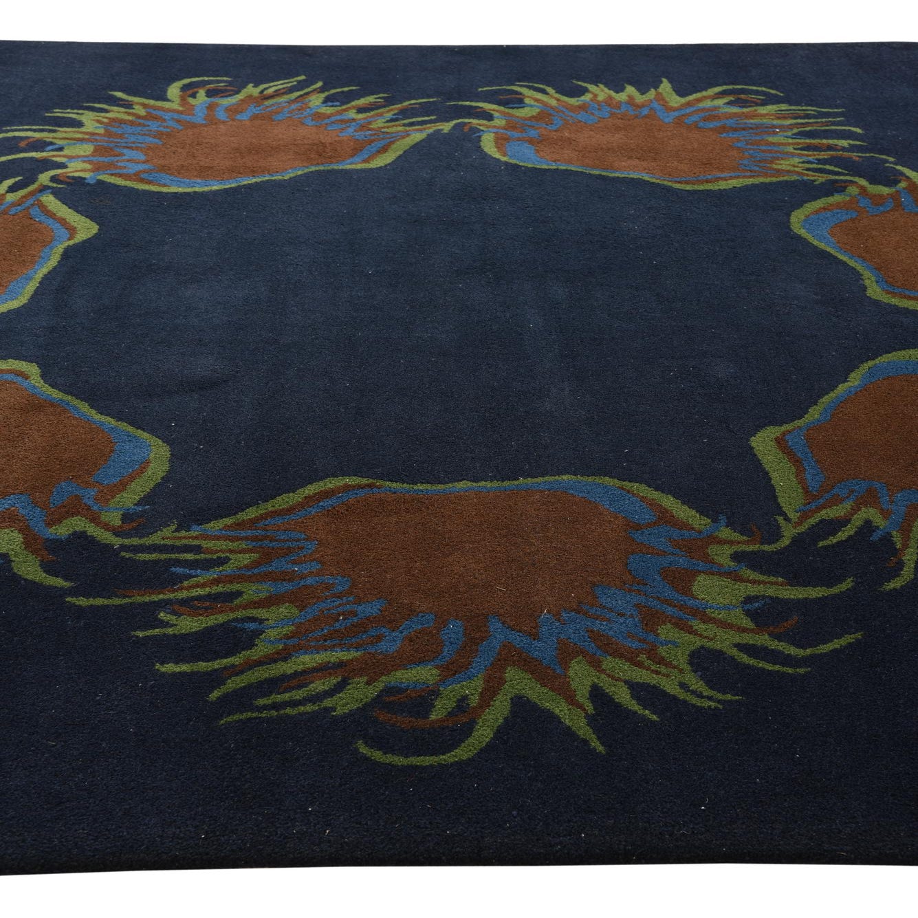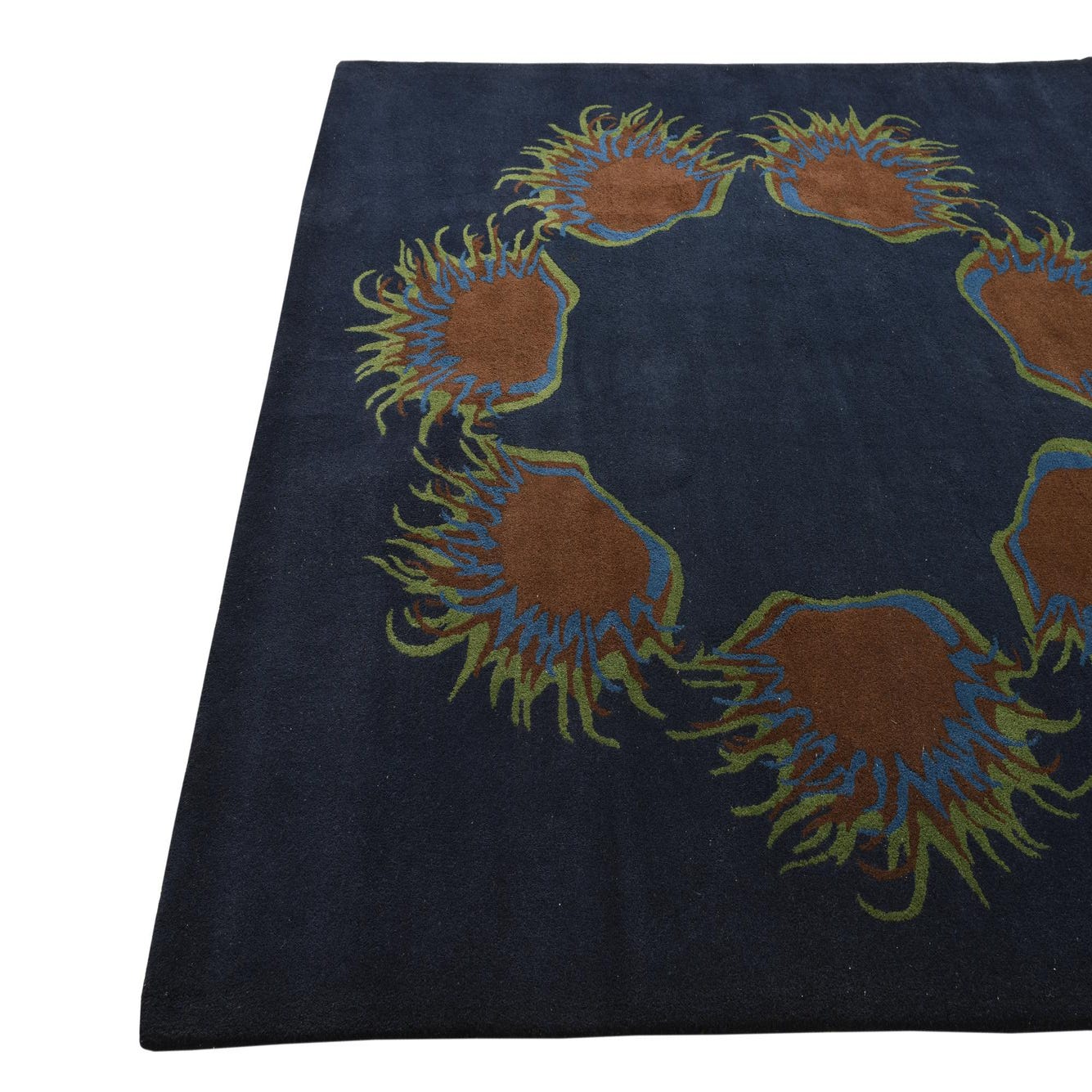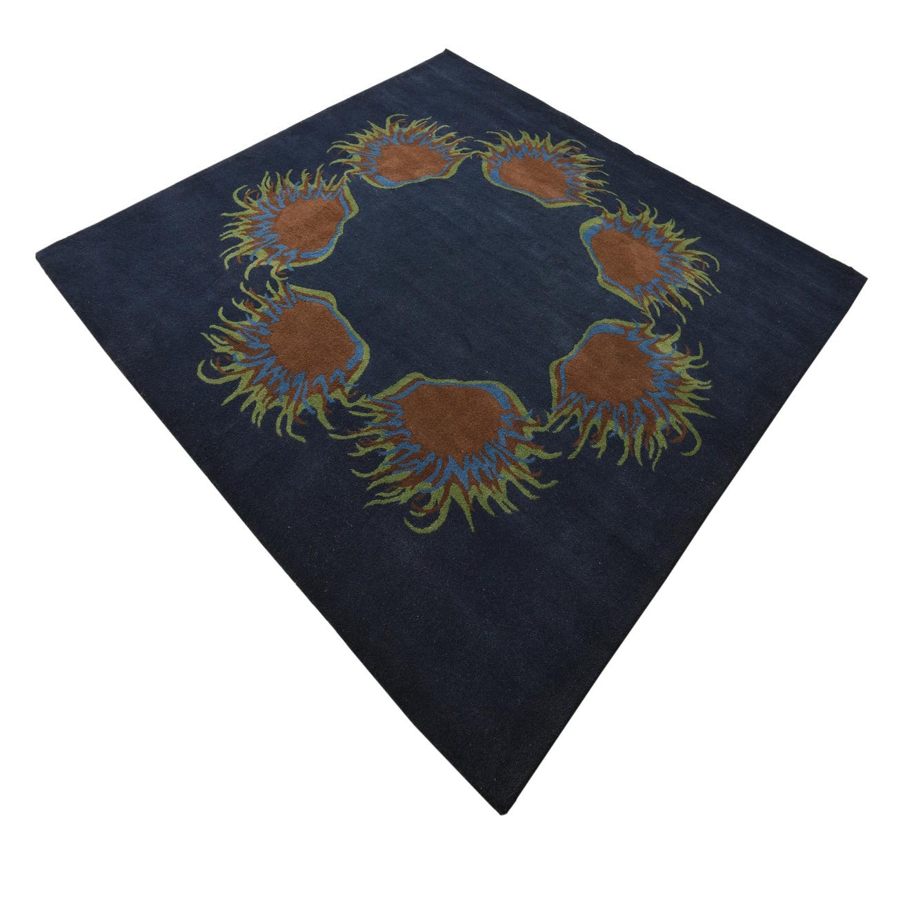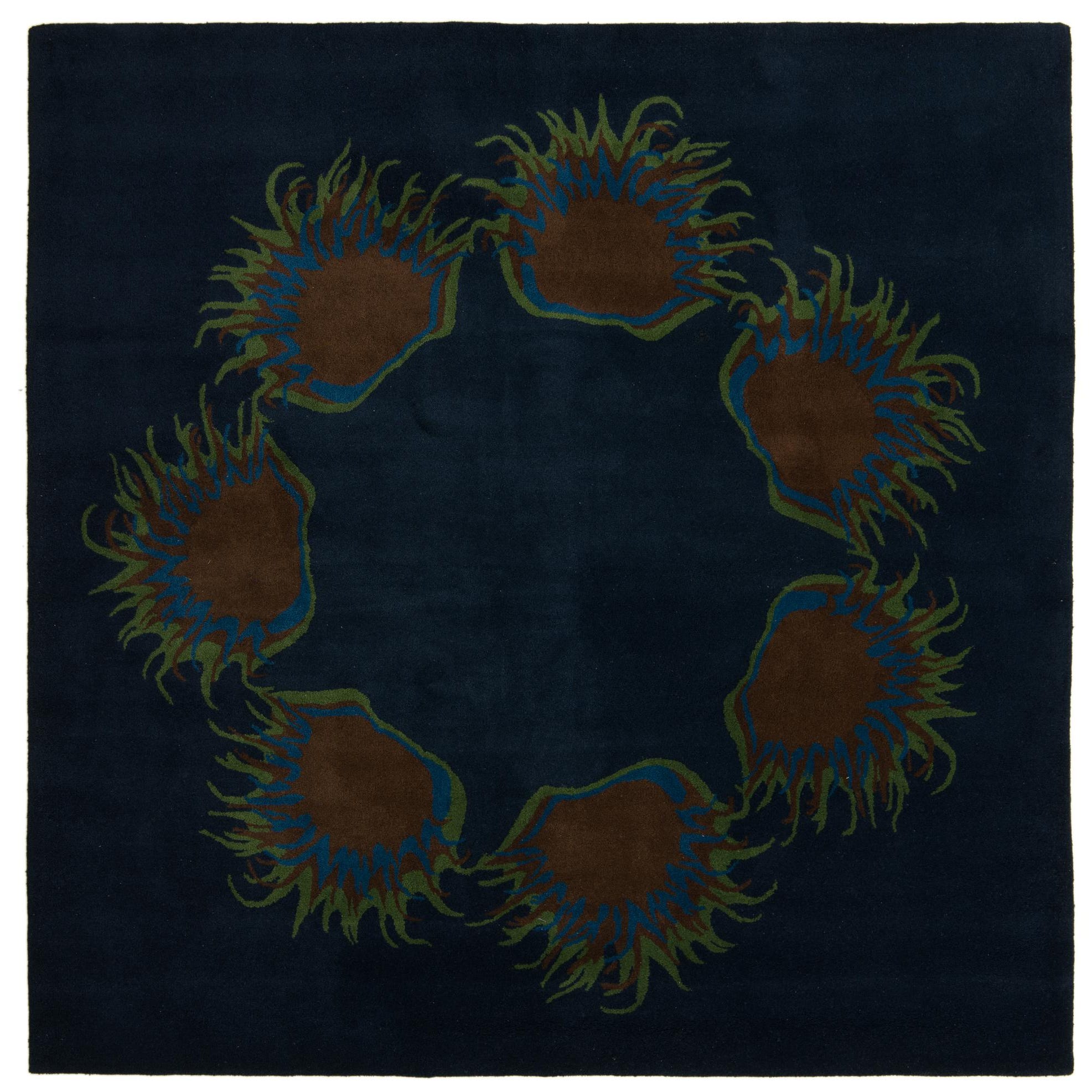 A square navy blue rug featuring a circular modern floral pattern with brown, blue, and green accents.