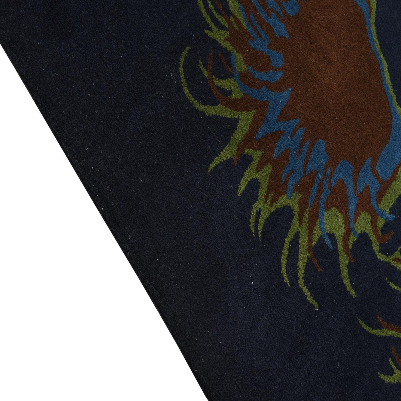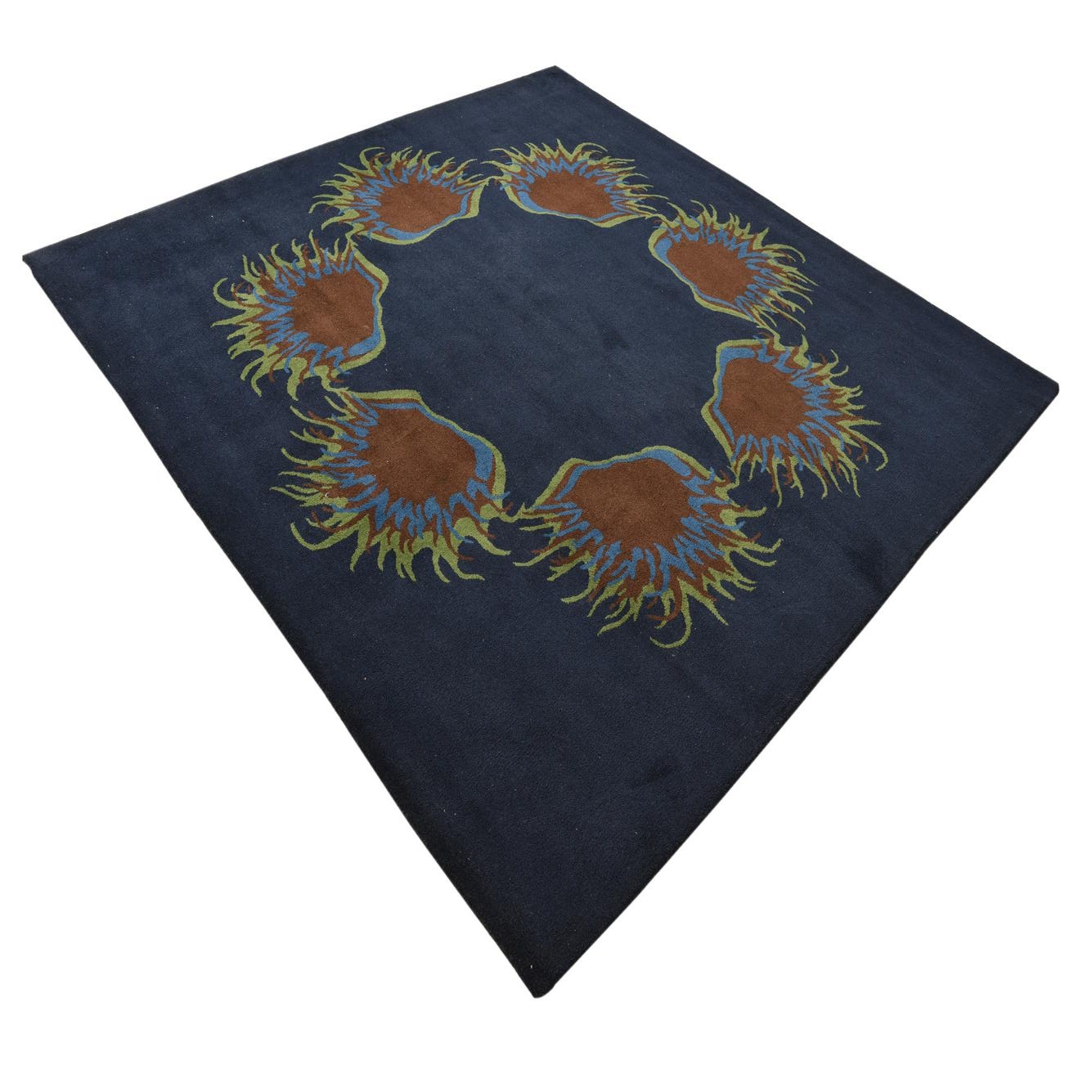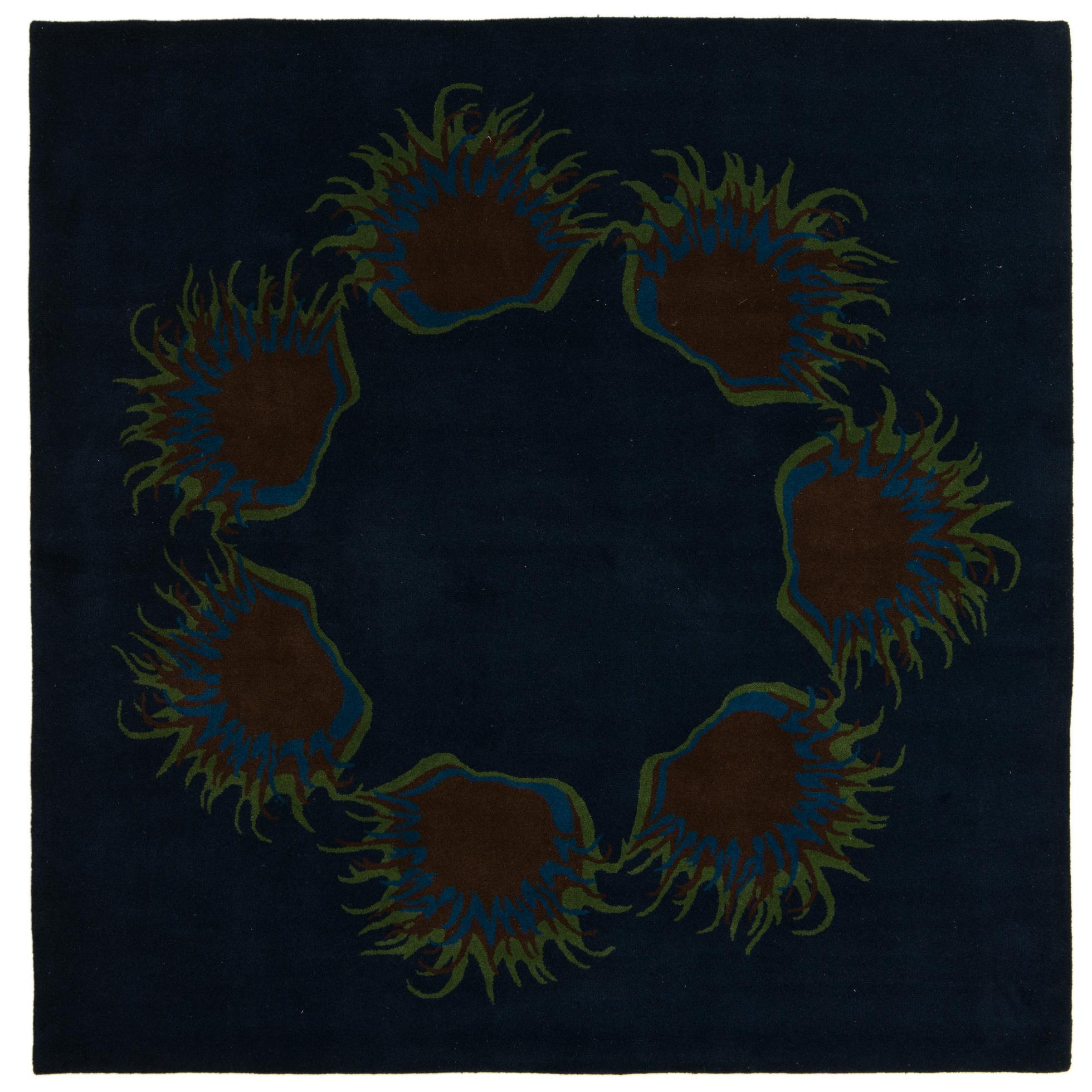 A square navy blue rug with a circular modern pattern of abstract brown, green, and blue shapes resembling sea anemones.