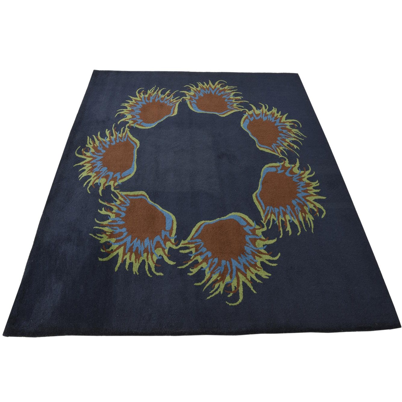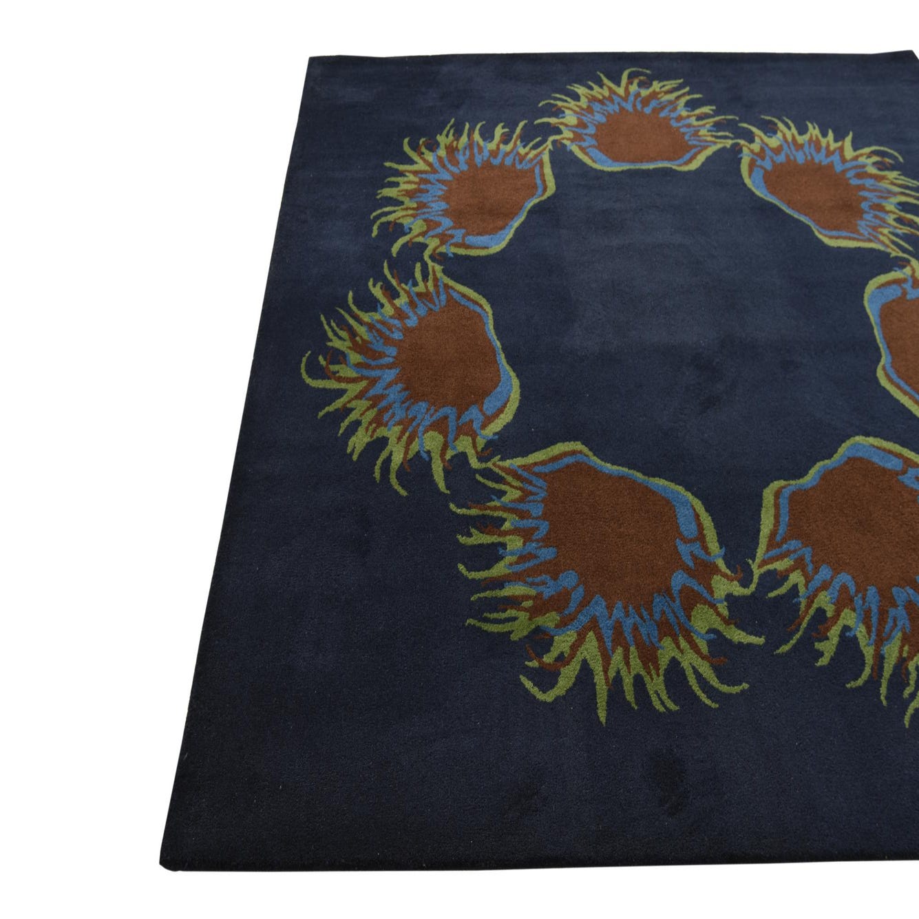 A 7' 6 x 7' 6 square navy blue modern wool rug with a circular pattern of abstract brown, blue, and green floral shapes.