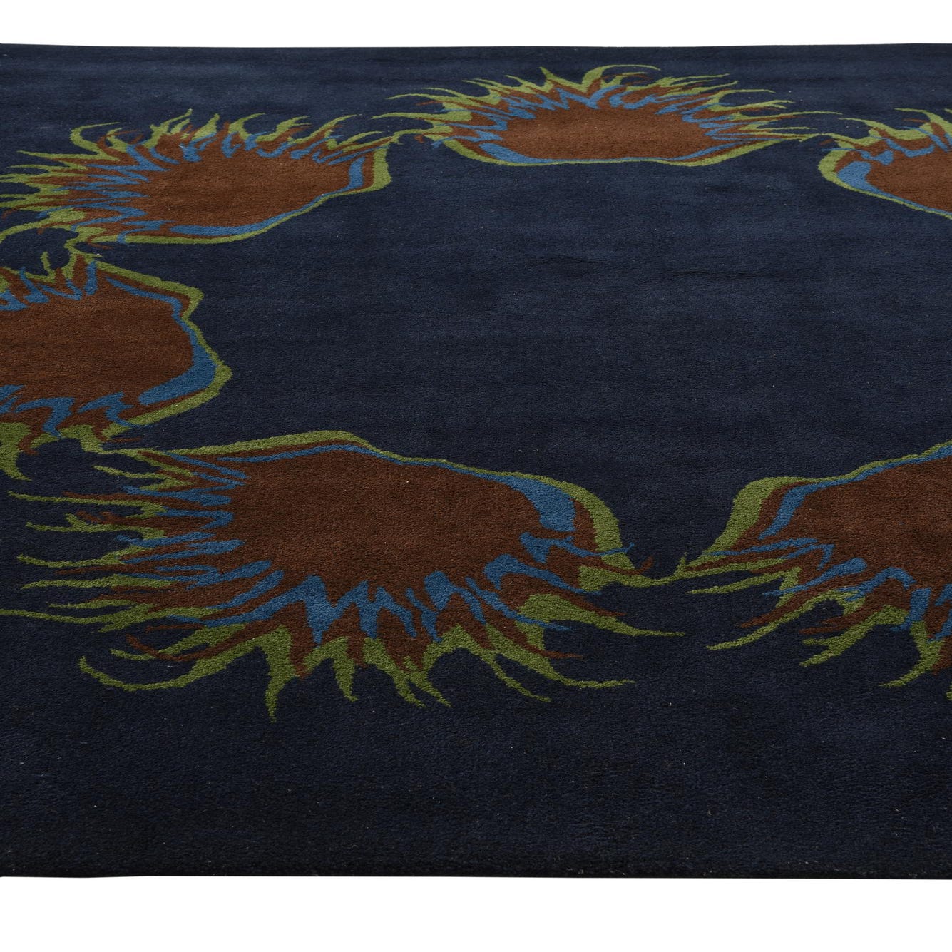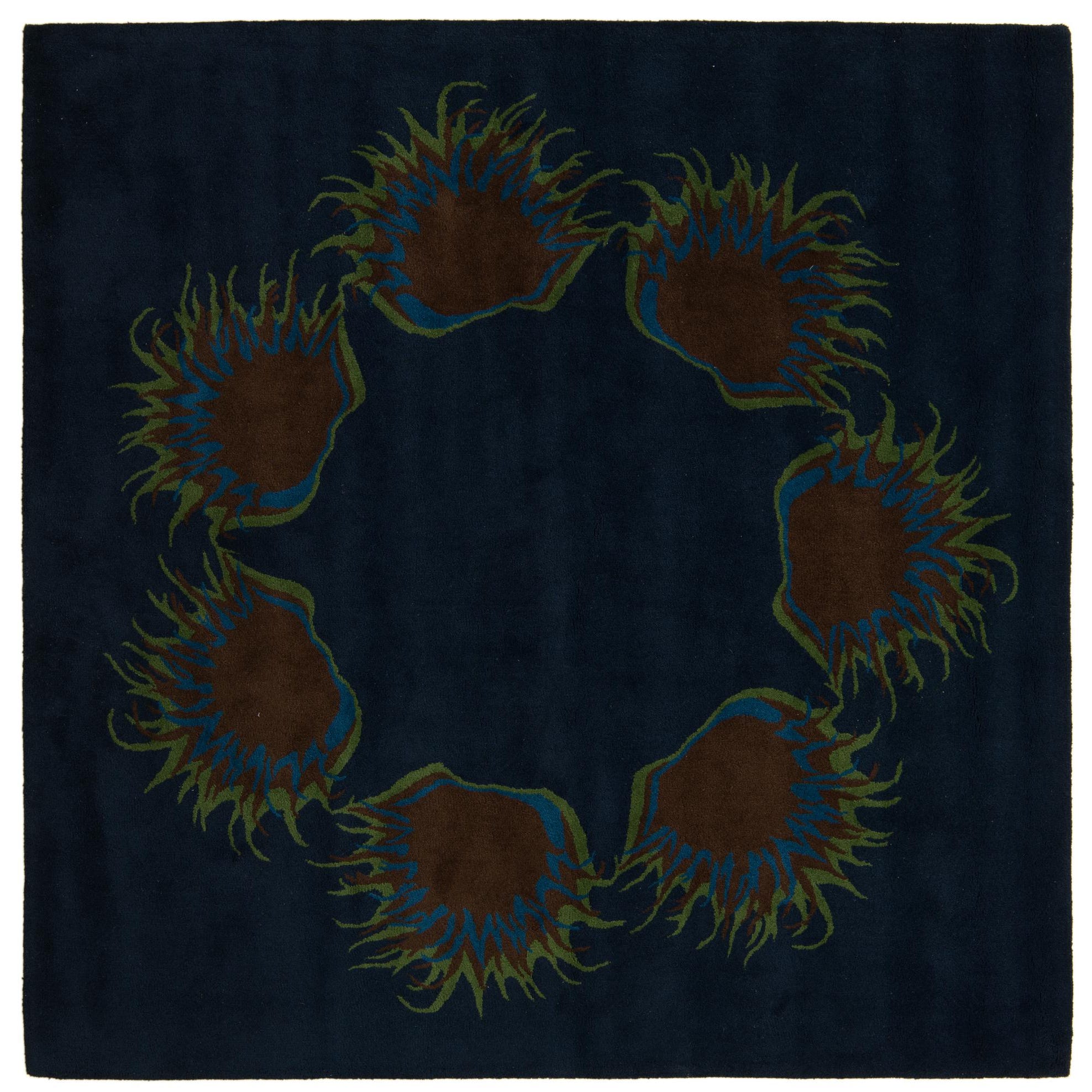 A square navy blue rug with a modern circular pattern of abstract brown, green, and blue shapes.