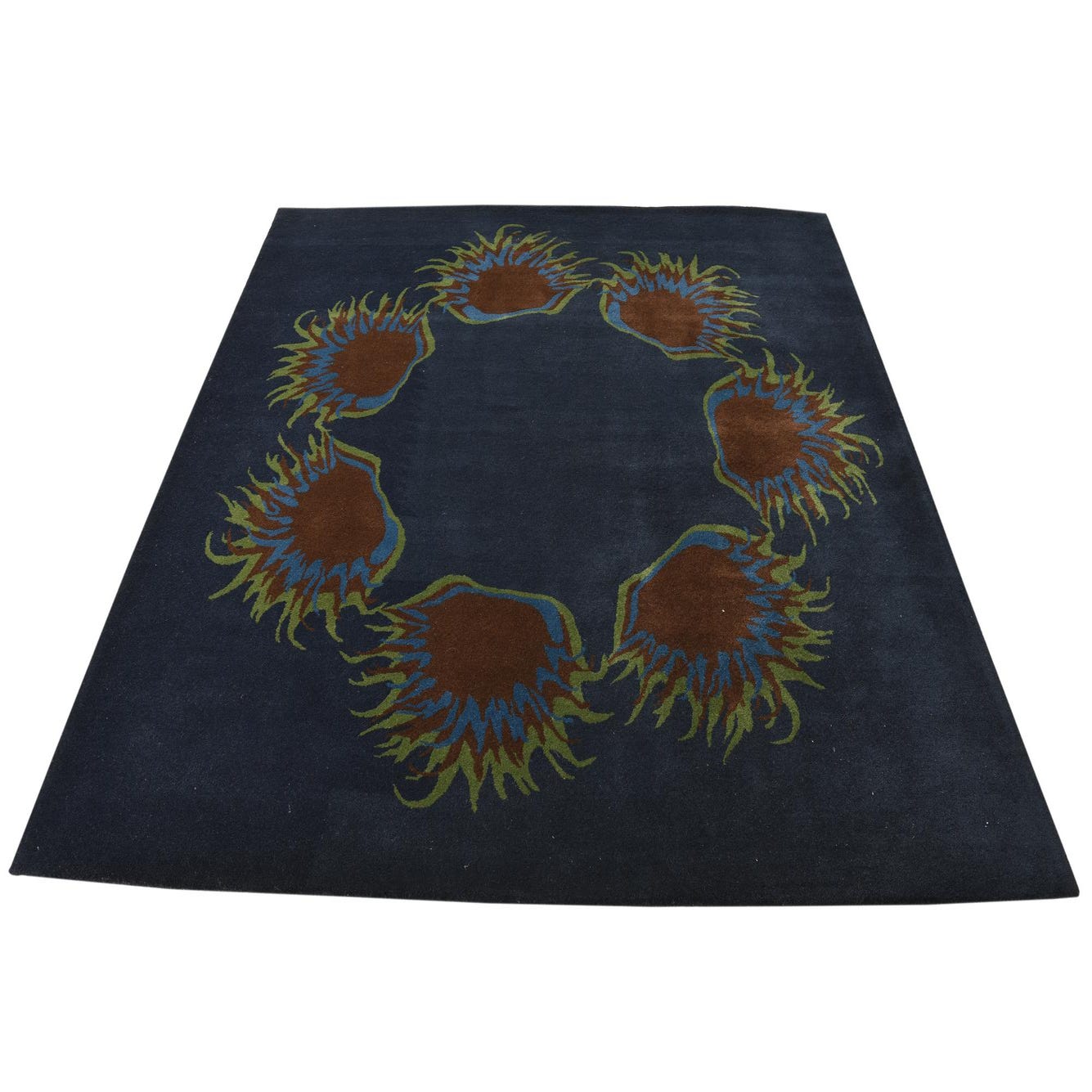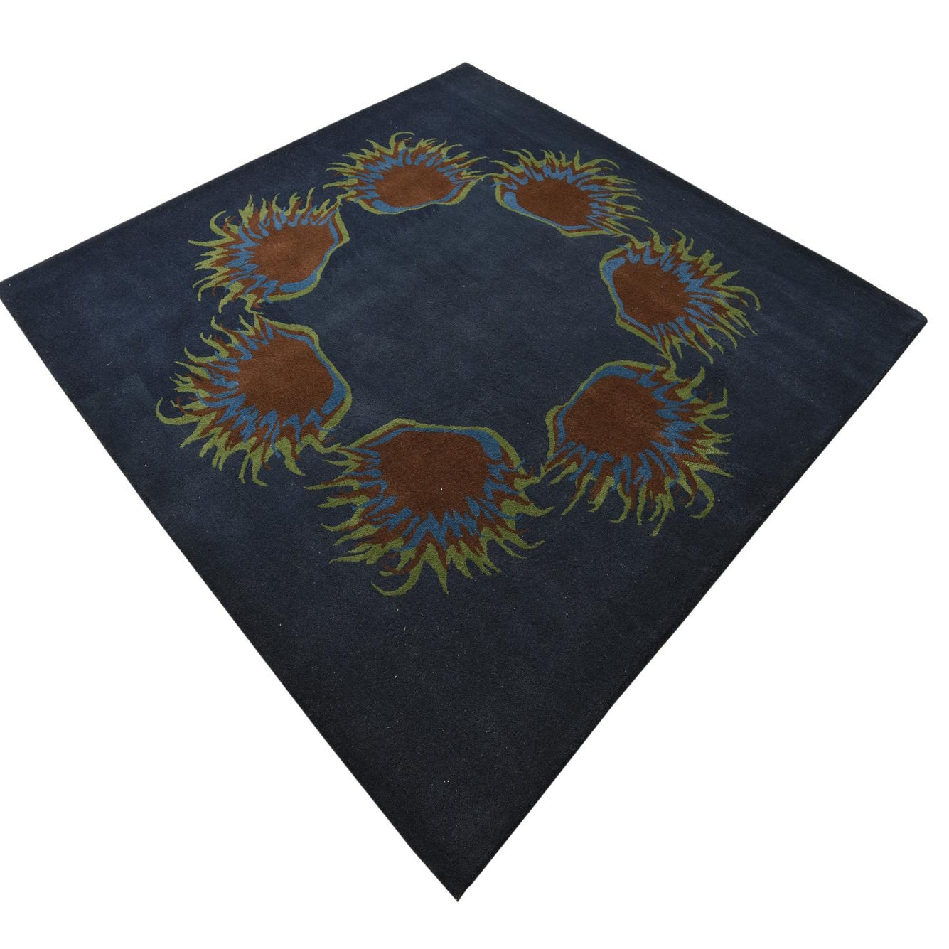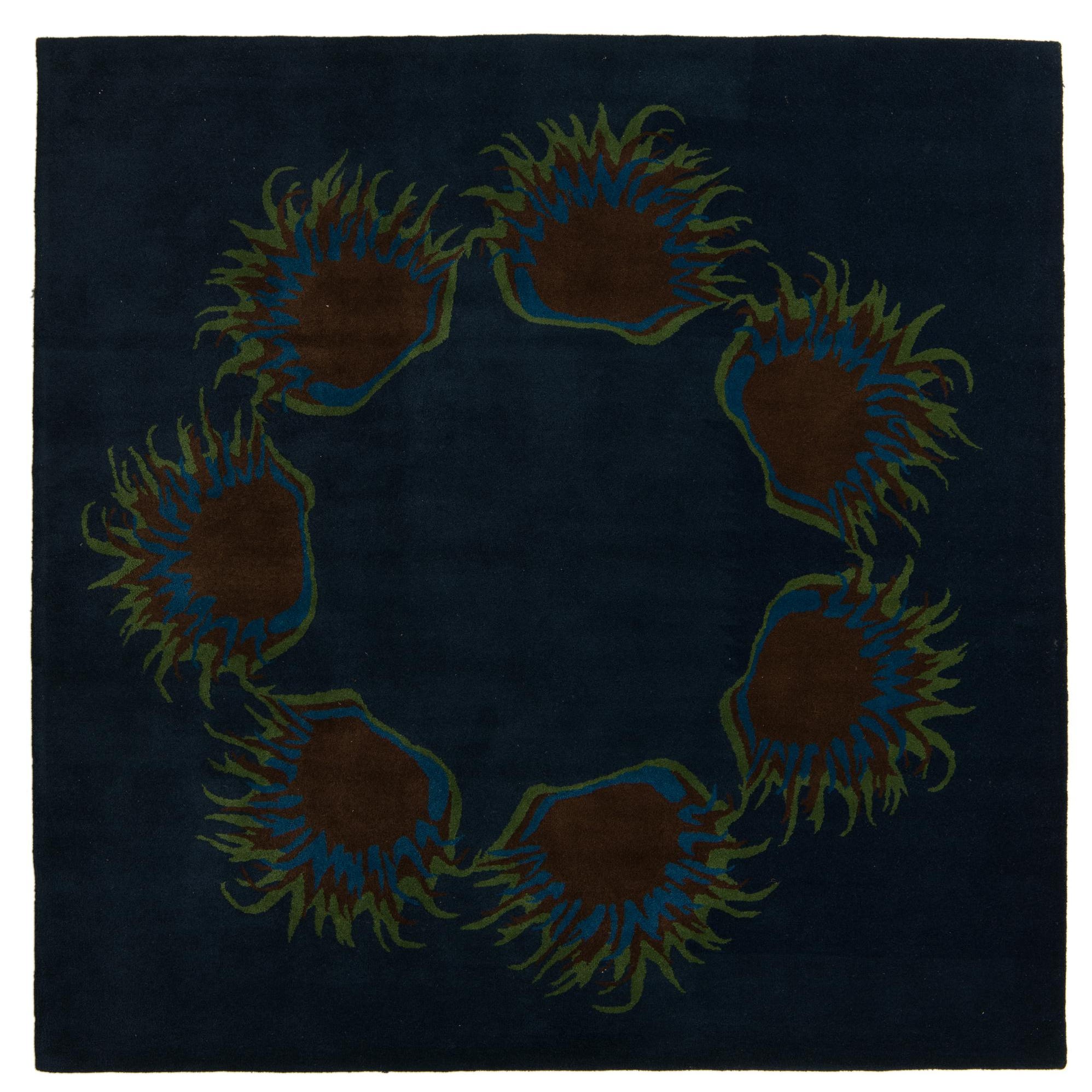 A 7' 6 x 7' 6 square navy blue modern wool rug with a circular pattern of brown, blue, and green abstract floral shapes.