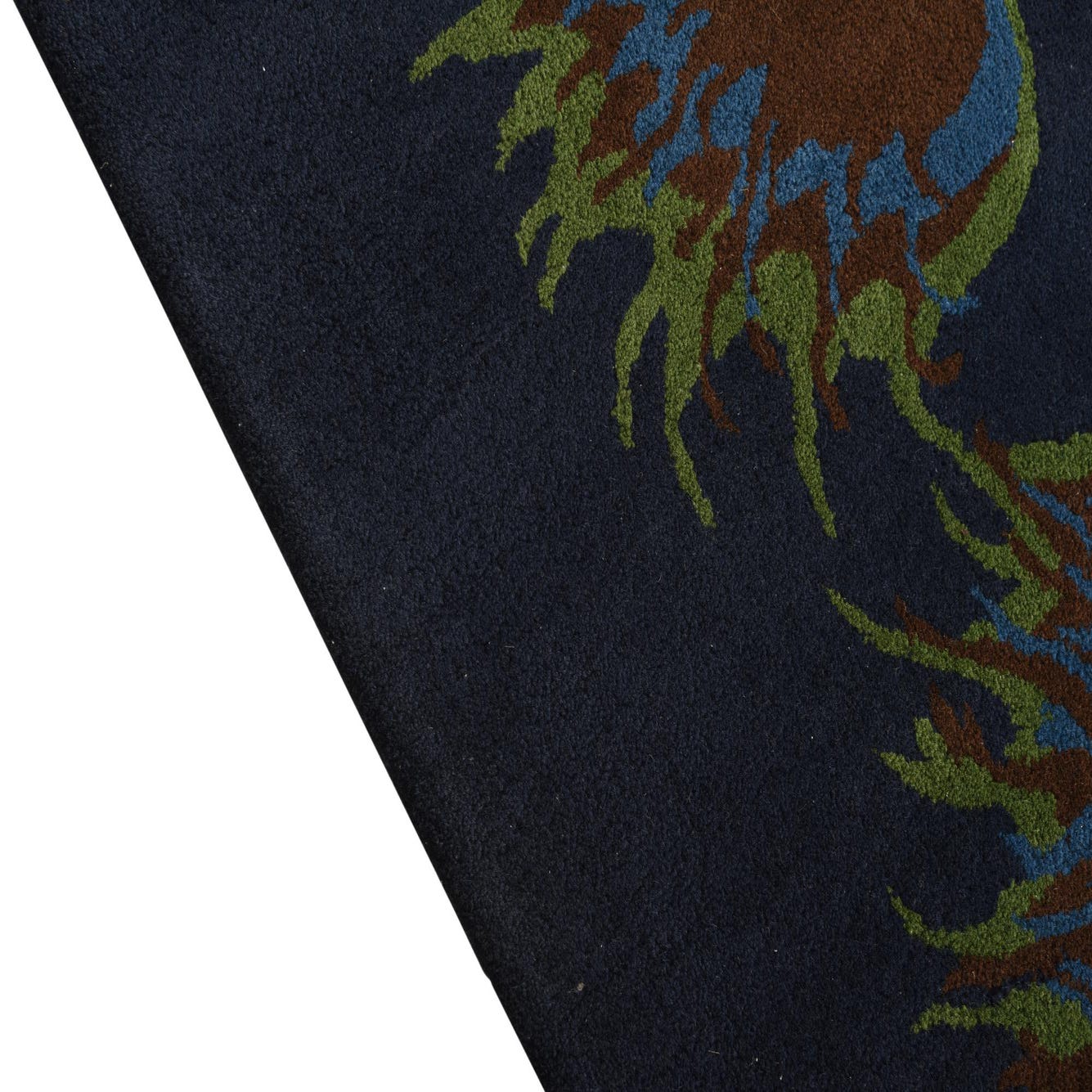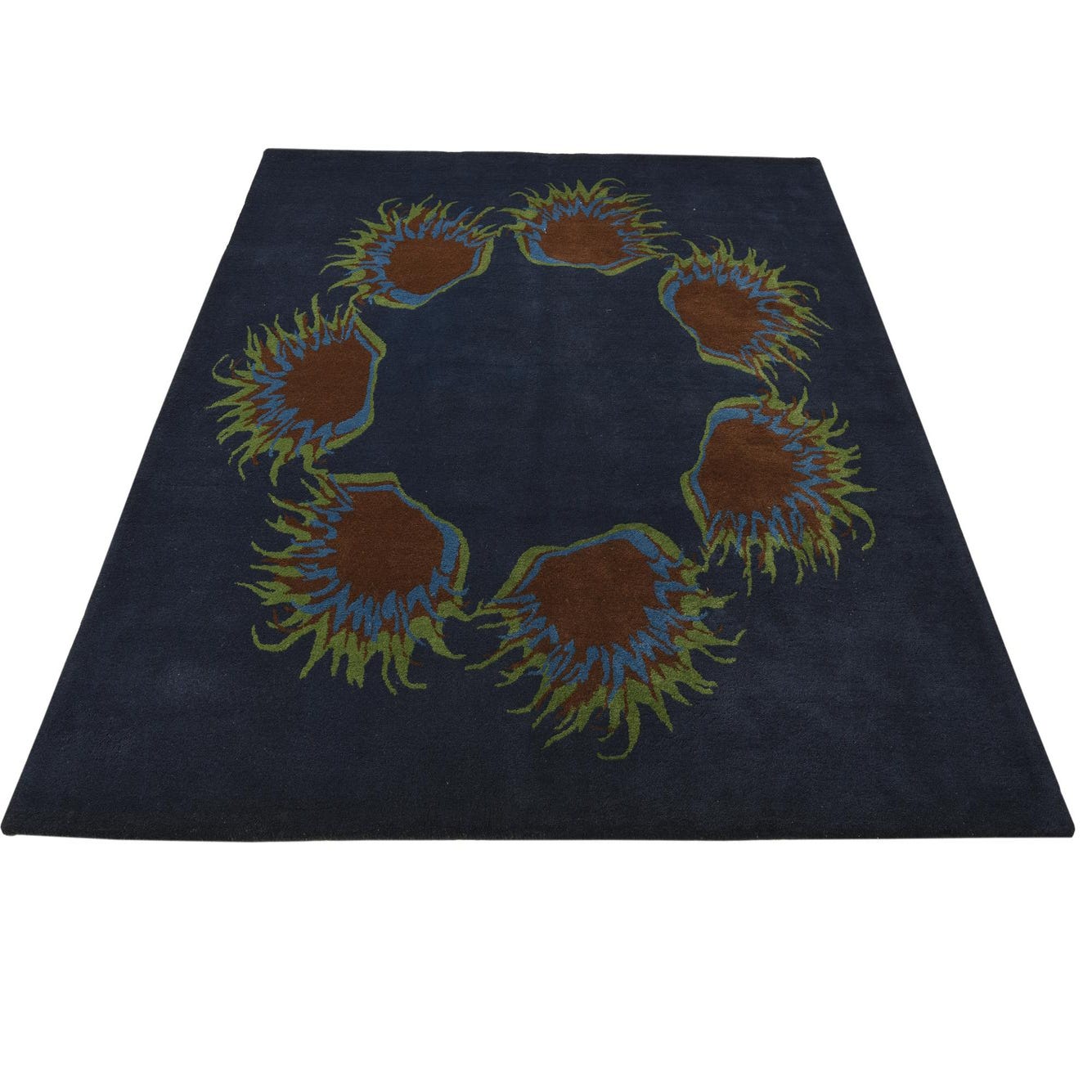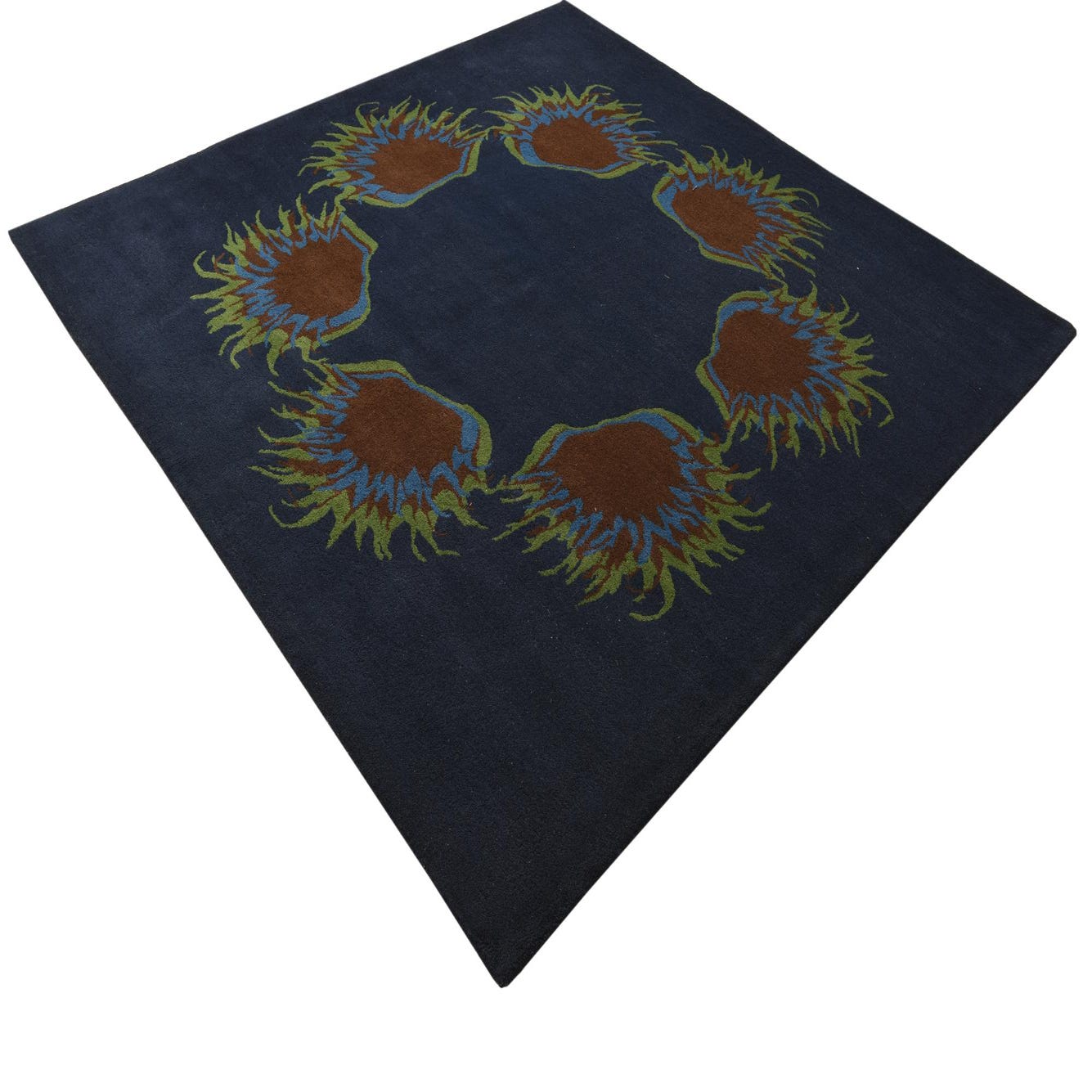 A square navy blue rug with a circular pattern of abstract brown, blue, and green floral shapes.