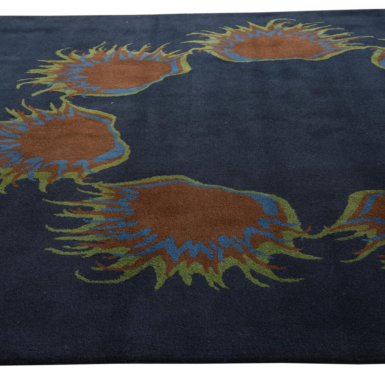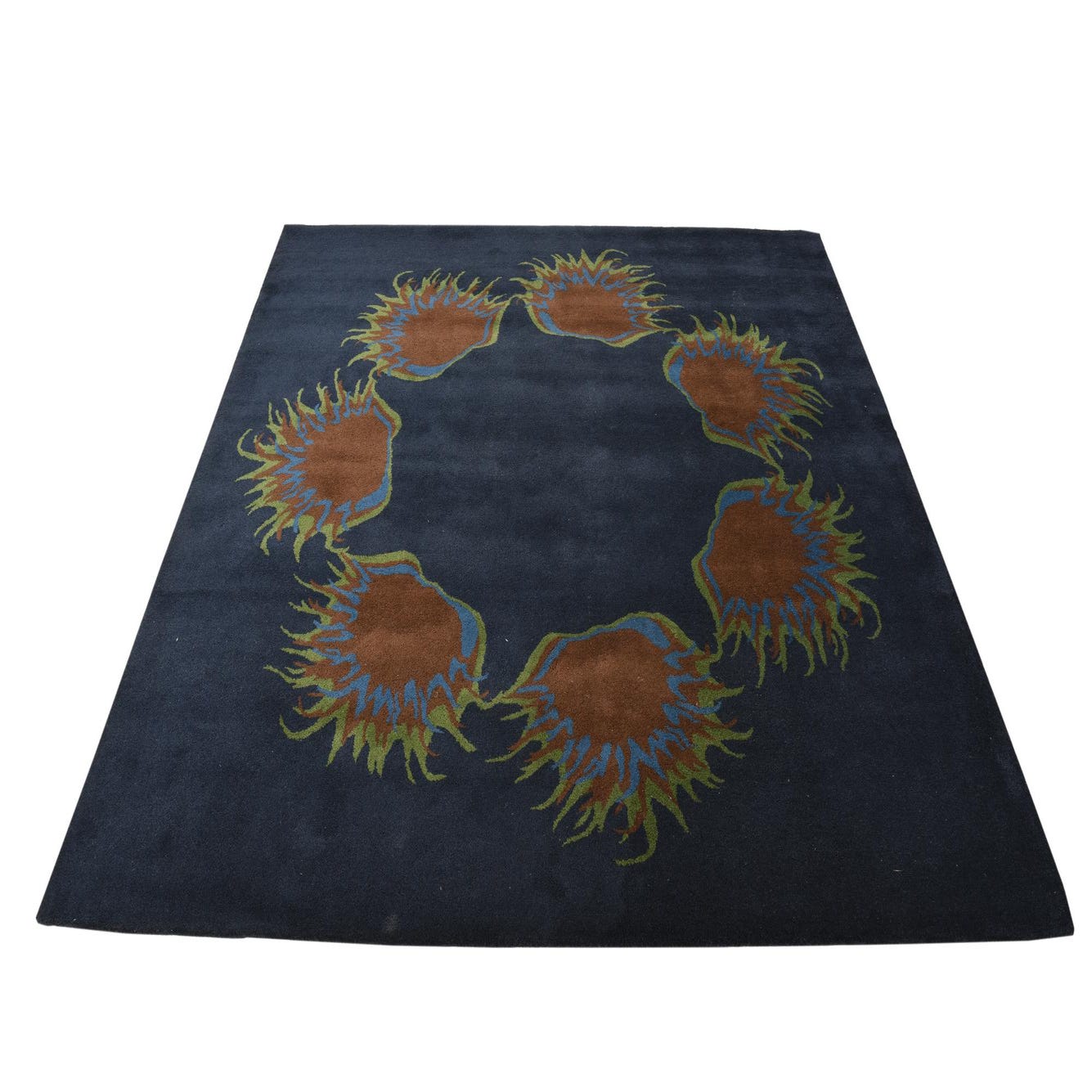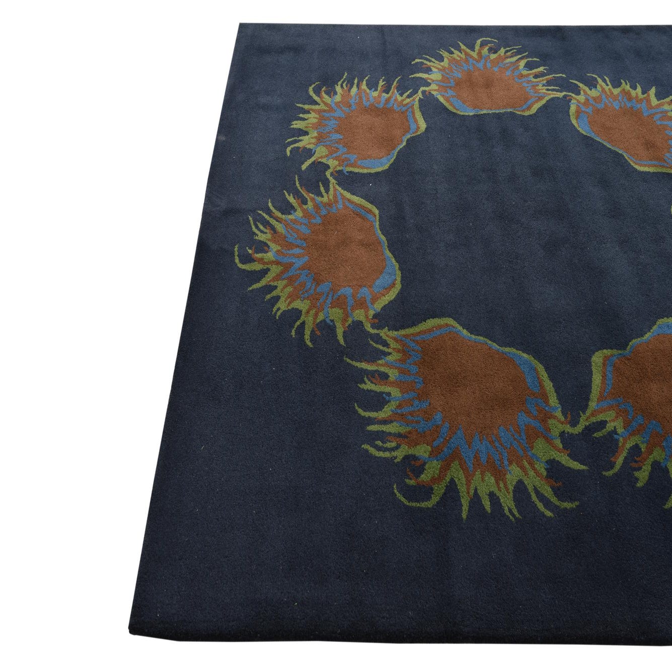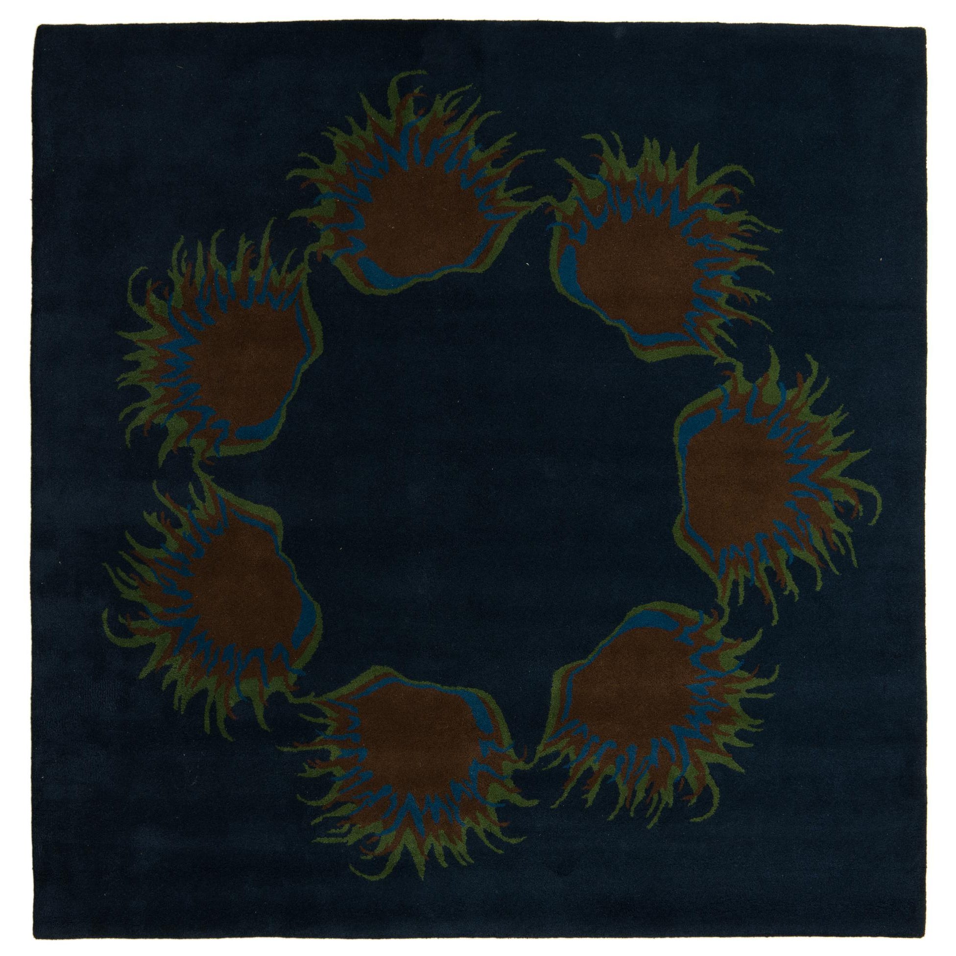 A square navy blue rug with a modern design featuring a circular arrangement of six brown, blue, and green spiky abstract shapes.