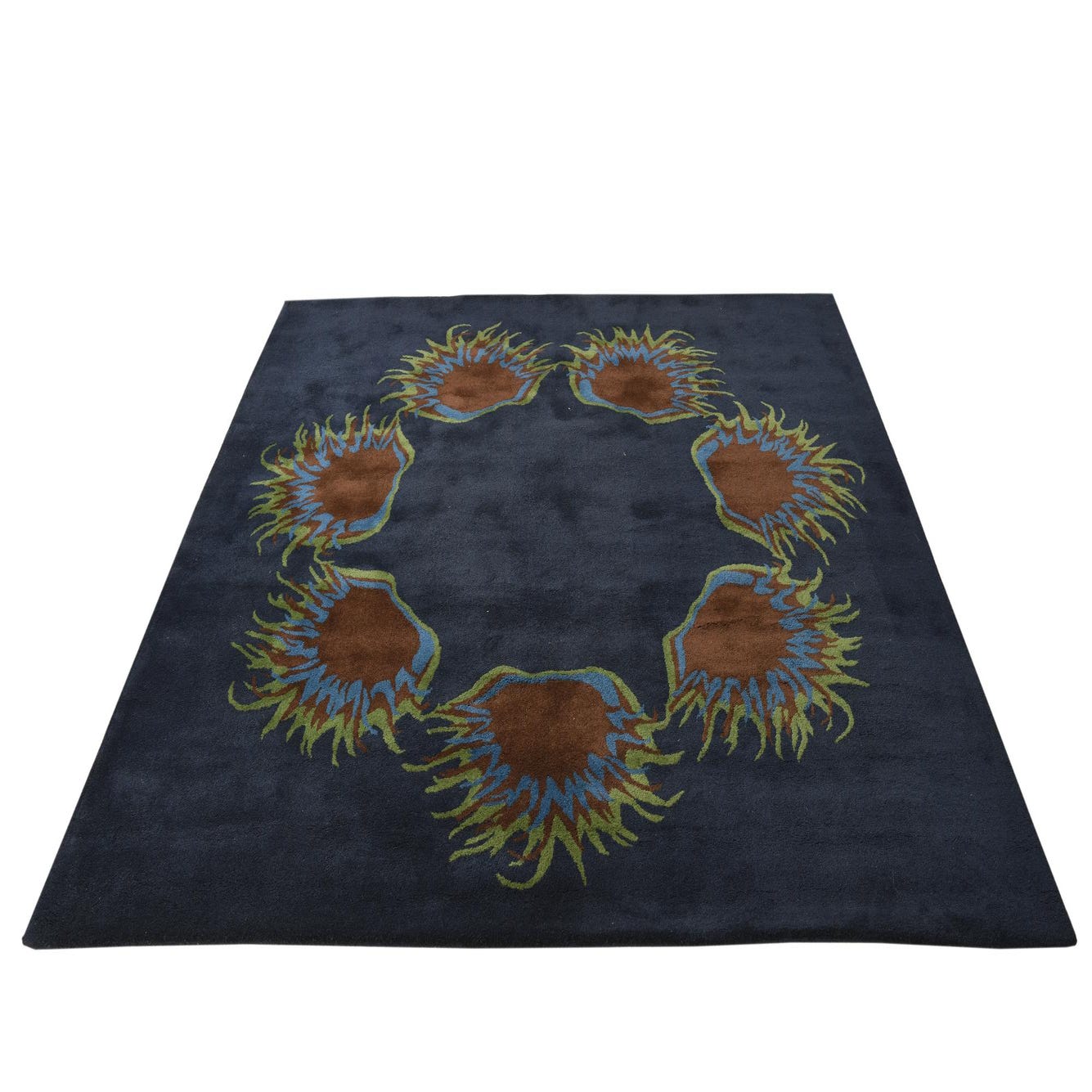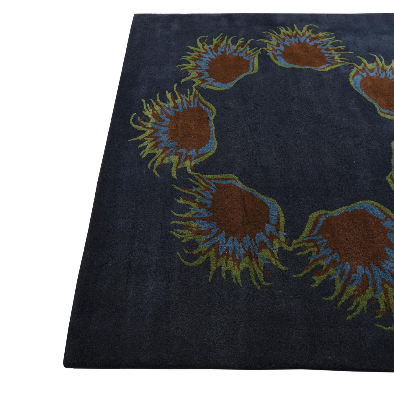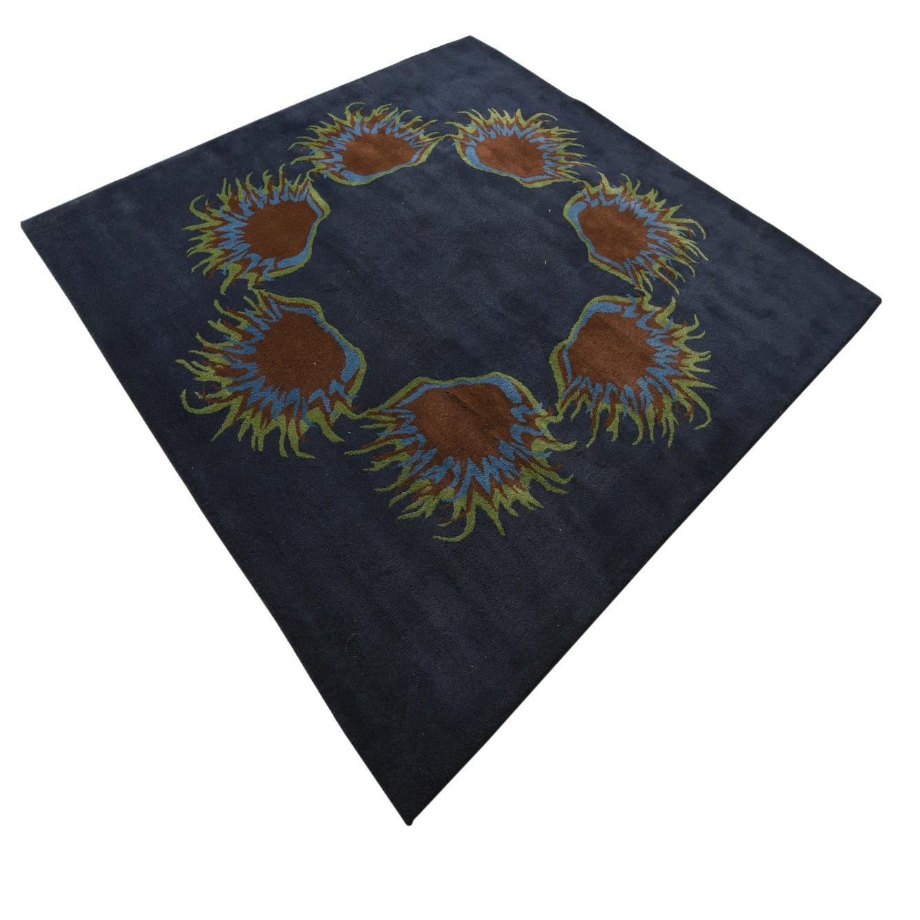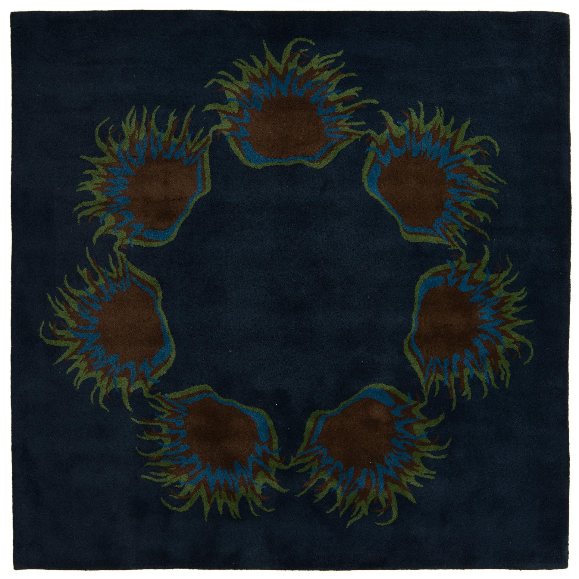 A square navy blue rug with a circular modern floral pattern featuring brown, blue, and green accents.