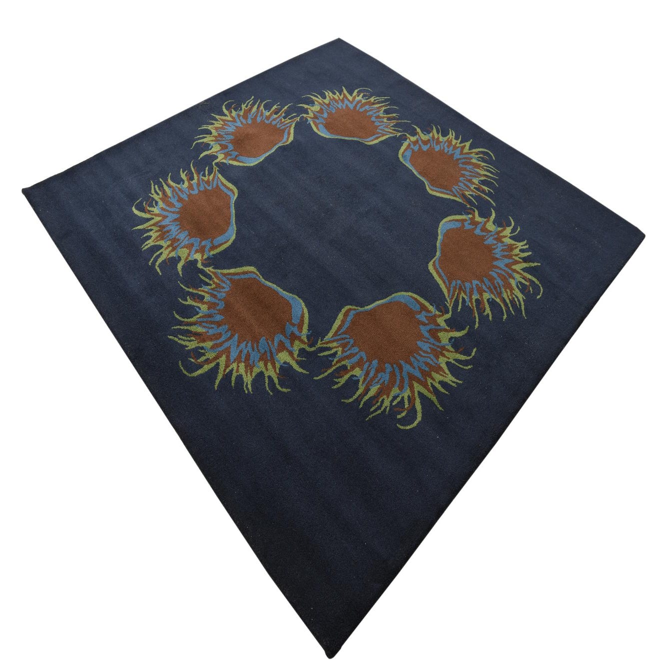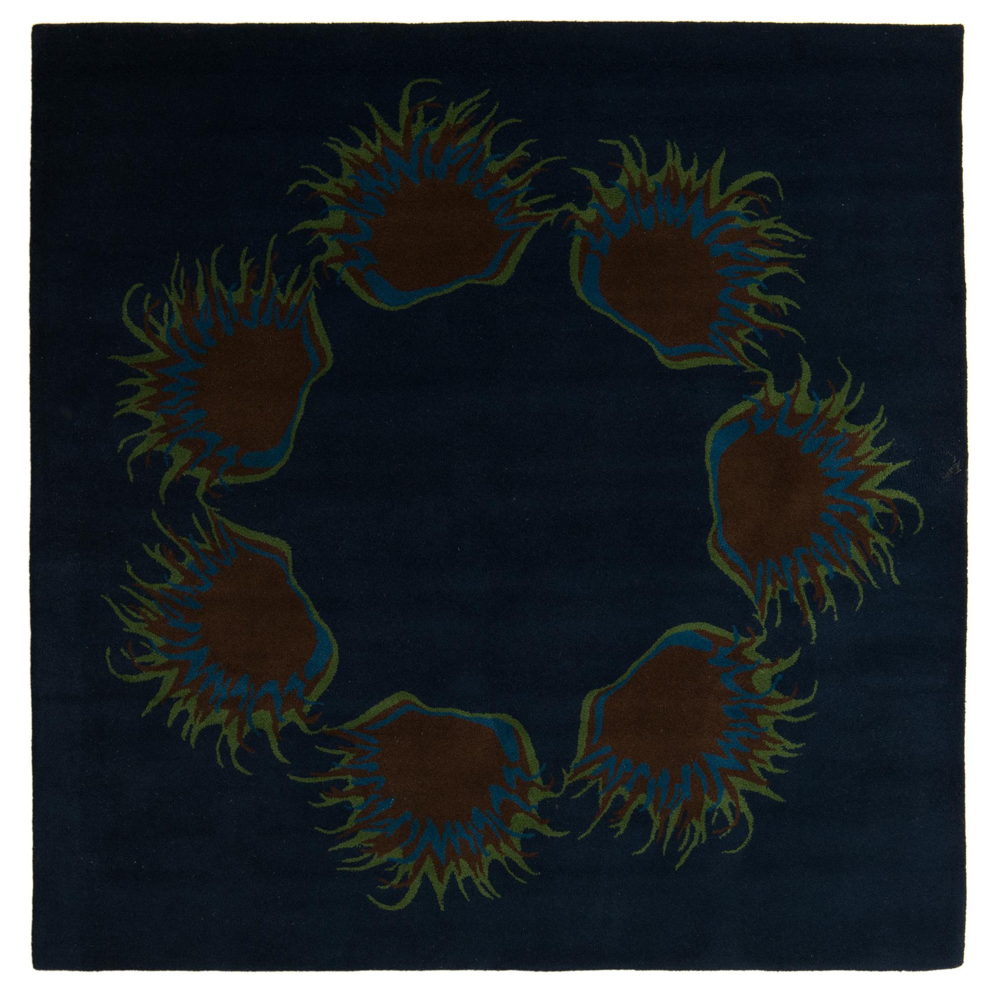 A square navy blue rug featuring a modern circular pattern of abstract brown, blue, and green shapes with spiky edges.