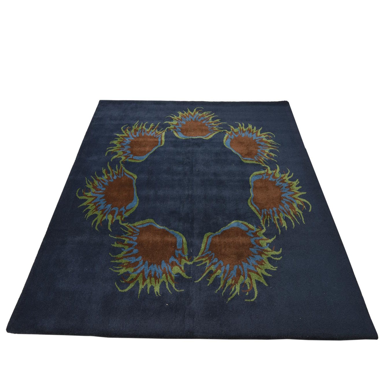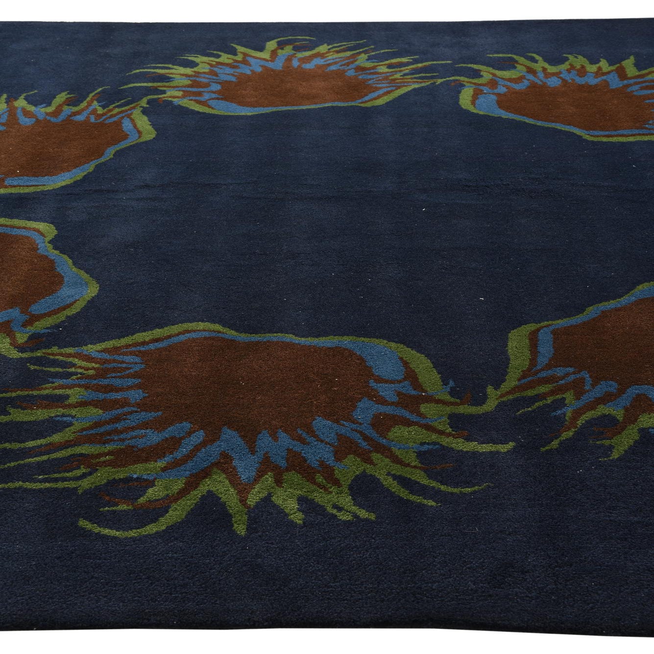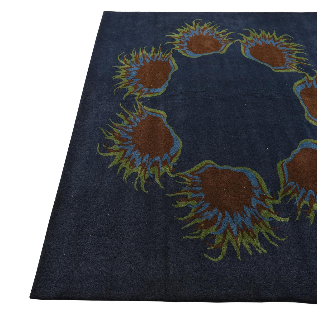 A 7' 6 x 7' 6 square navy blue modern rug with a circular pattern of brown, blue, and green abstract floral shapes.