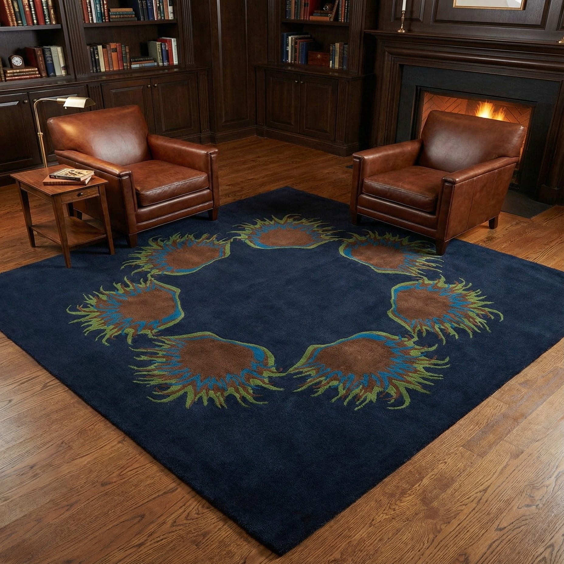 Primary color is Navy Blue. Colors in this rug include: Navy Blue, Blue, Brown, Green.
