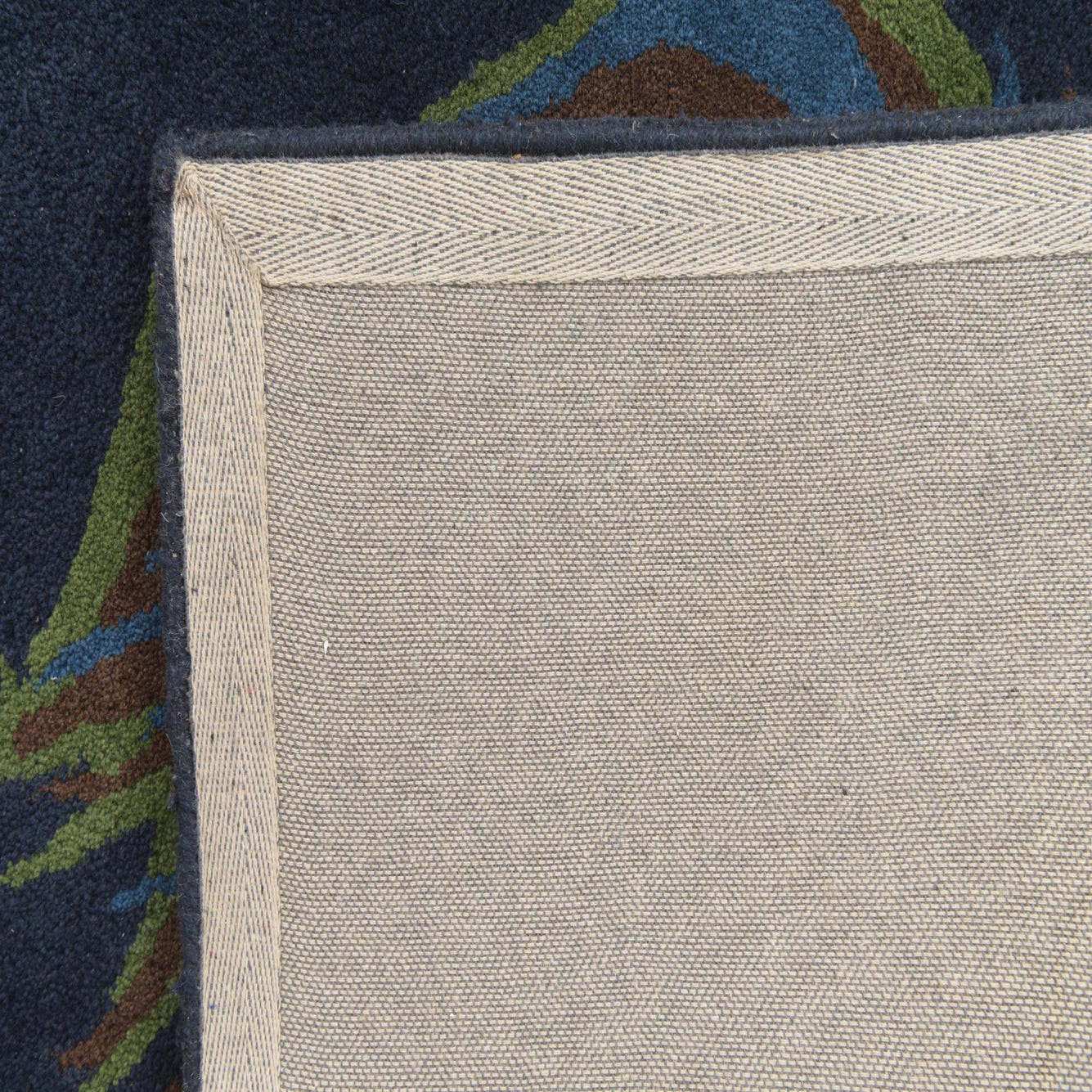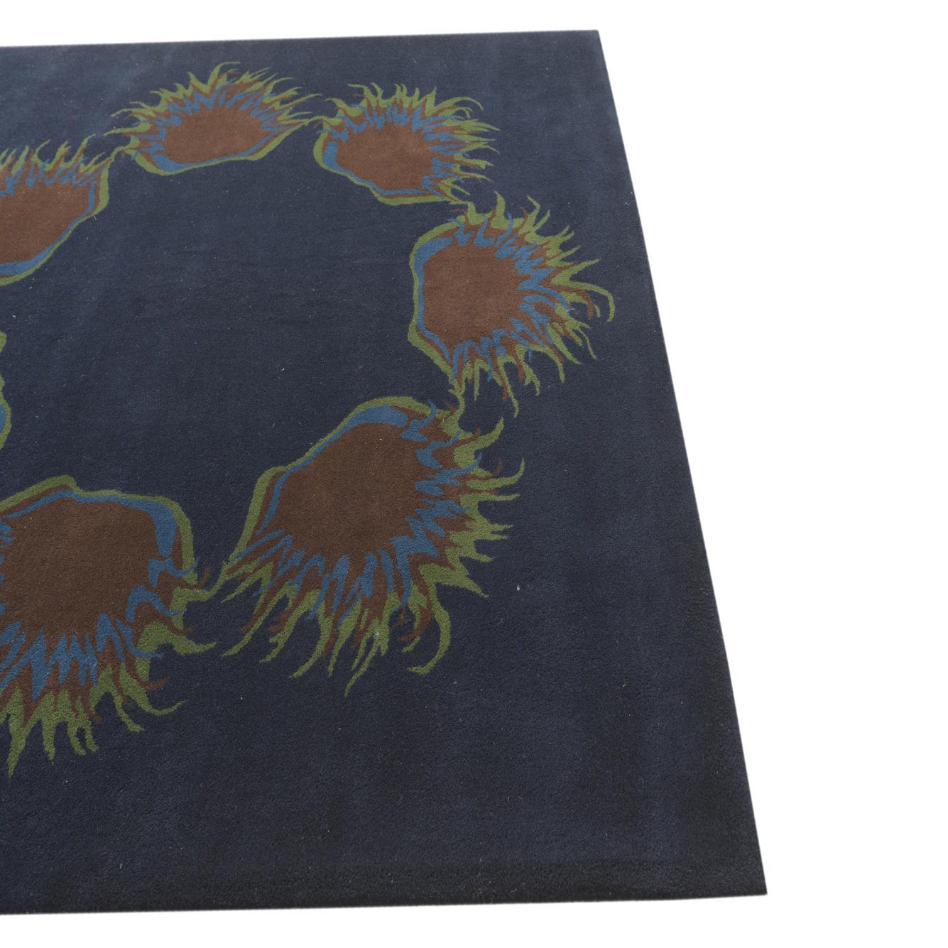 A square navy blue wool rug featuring a circular abstract pattern of six brown, blue, and green spiky shapes.