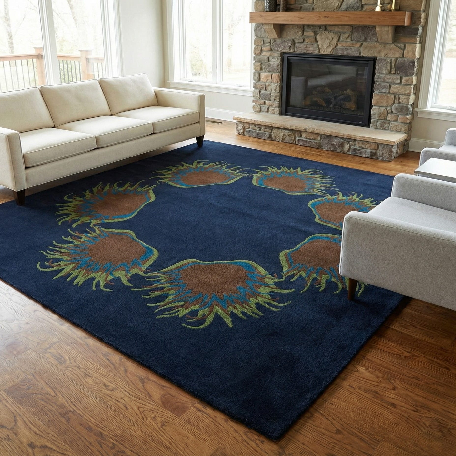The Luna Collection presents a sophisticated 8 Ft square rug, meticulously hand-tufted of 100% wool, offering a sturdy pile that promises durability and comfort underfoot. This piece features a rich navy blue background, a color that brings depth and a sense of tranquility to any space. Adorning this dark canvas is a contemporary pattern with sprays of foliage in shades of blue, brown, and green, creating a vibrant contrast that captures the eye.