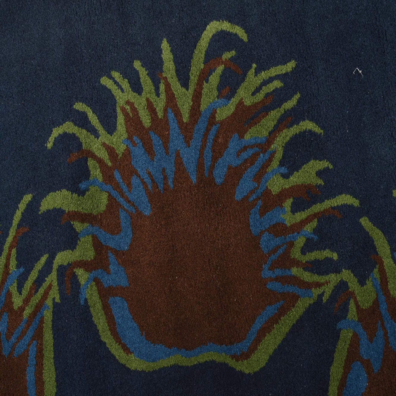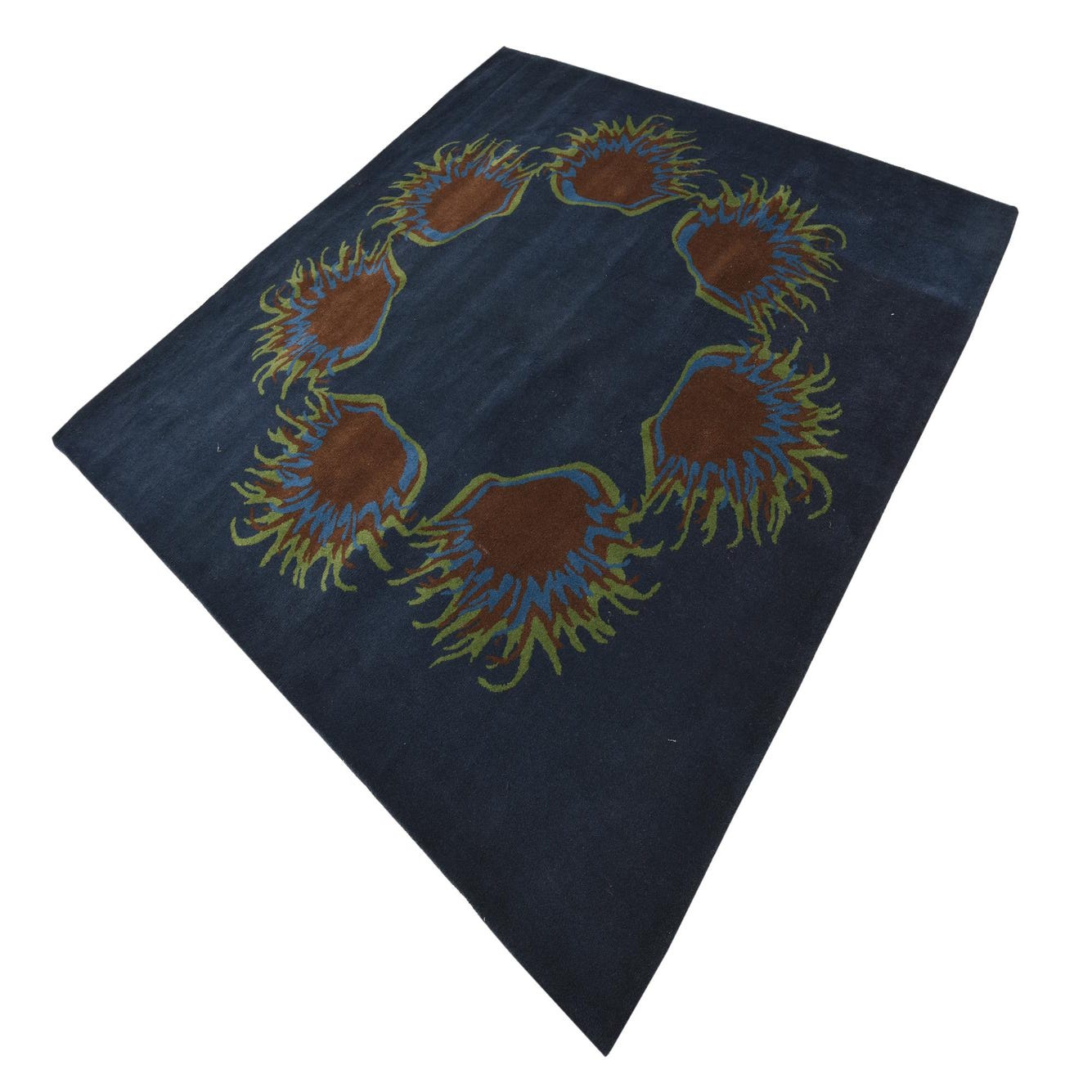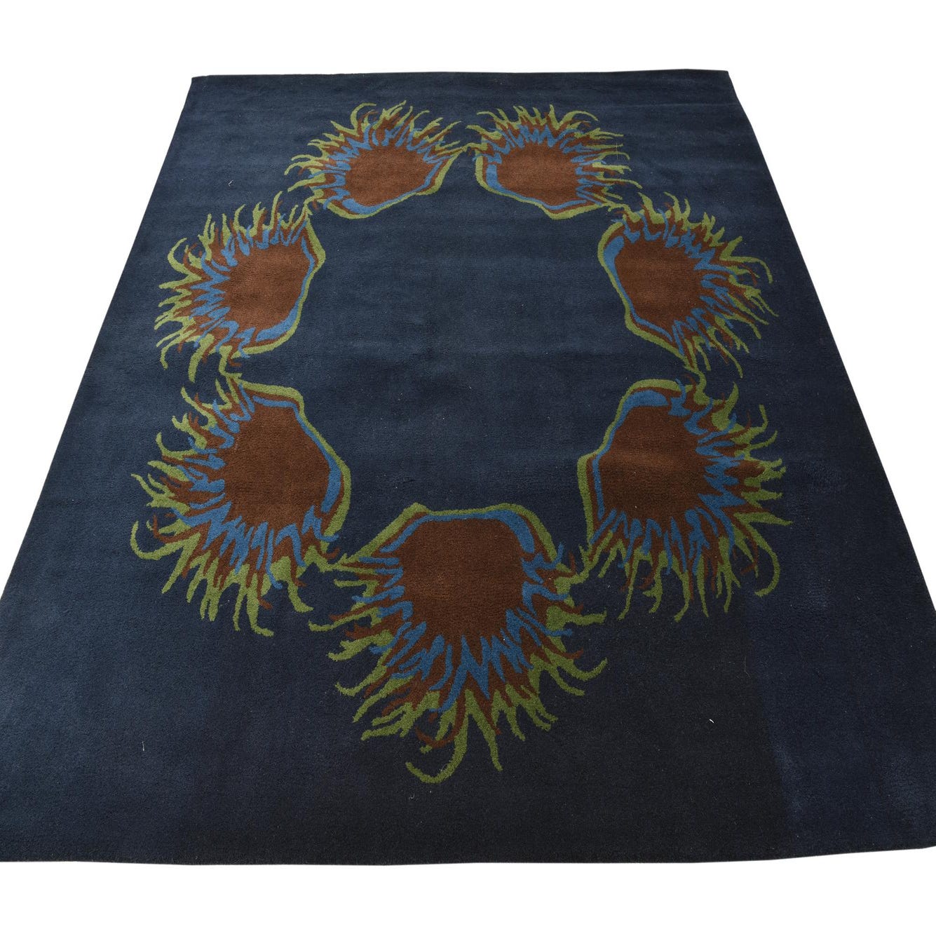 A square navy blue area rug with a modern circular pattern of abstract brown, blue, and green shapes.