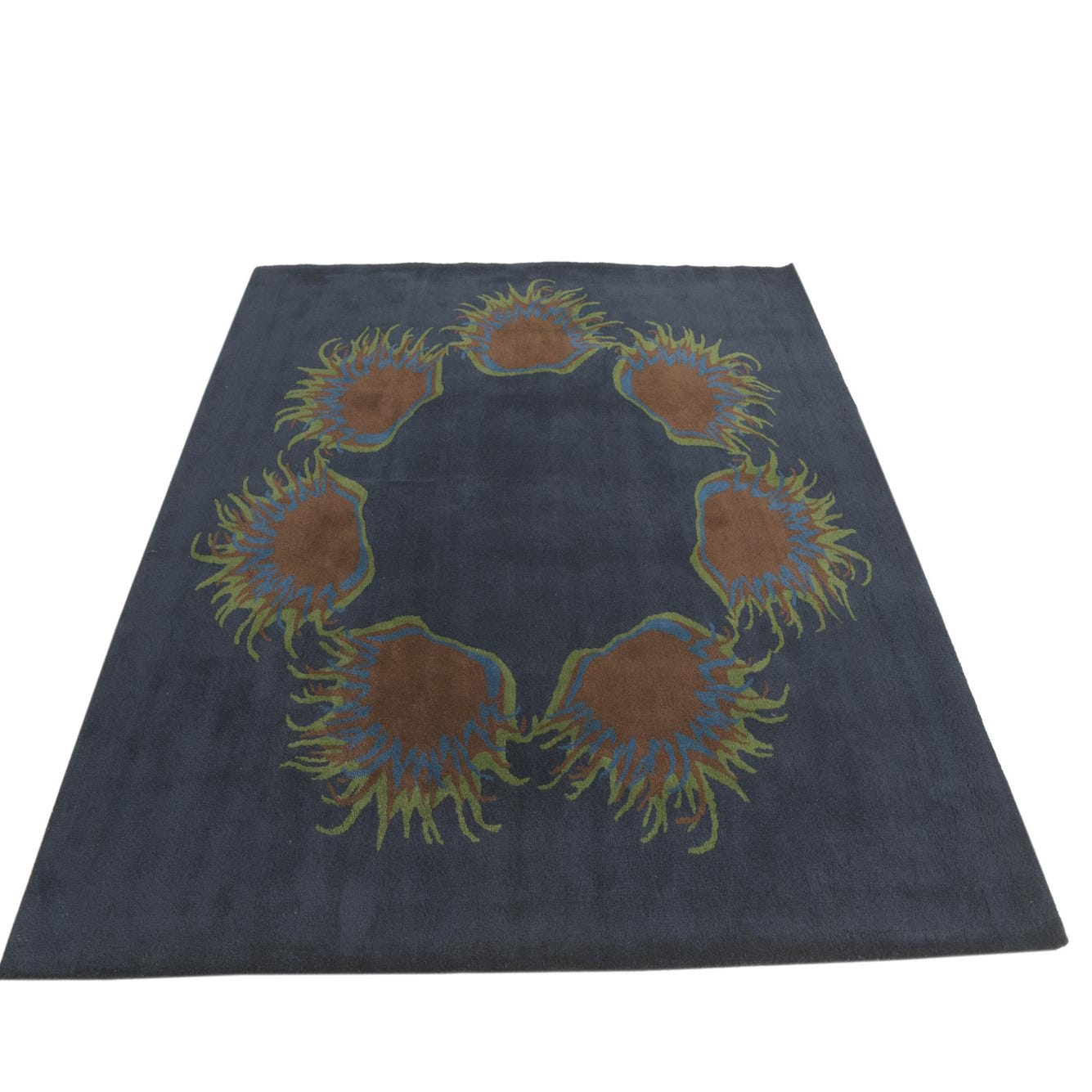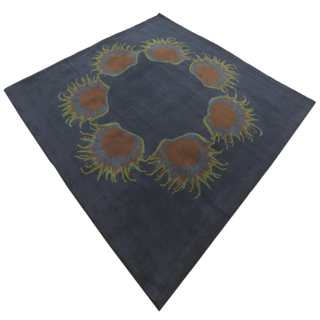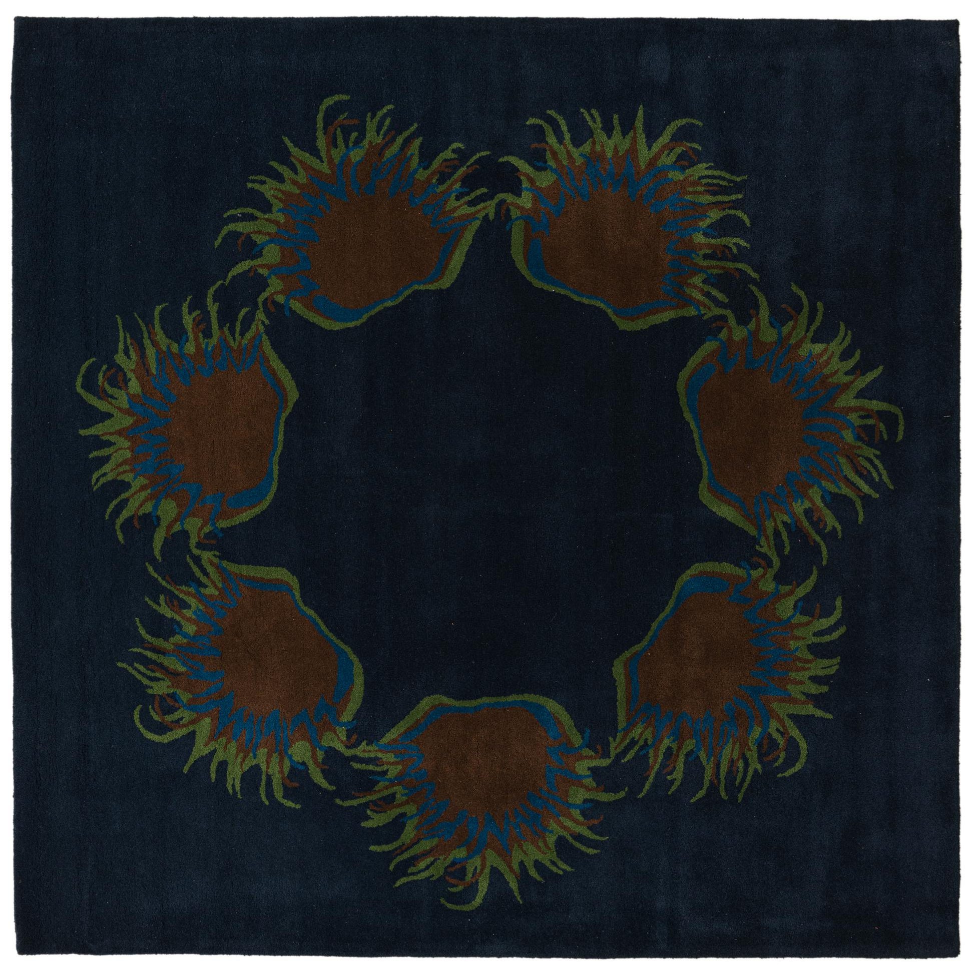A square navy blue wool rug featuring a circular arrangement of six abstract brown, blue, and green floral motifs.
