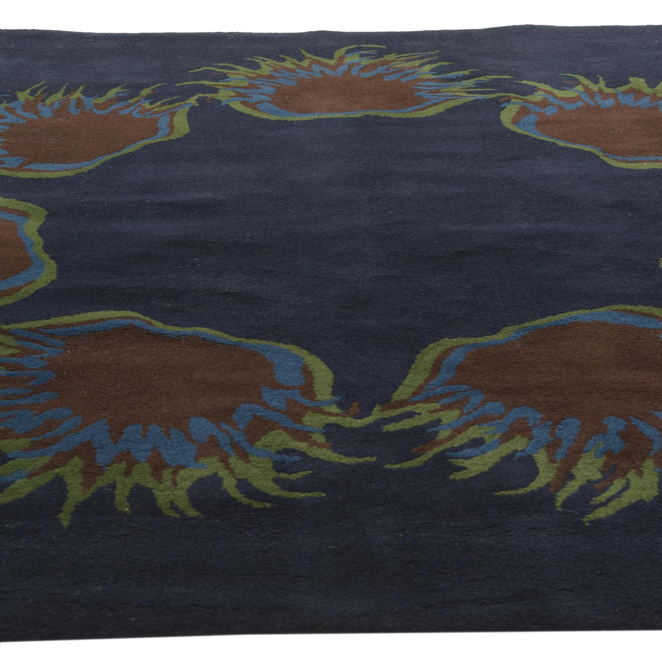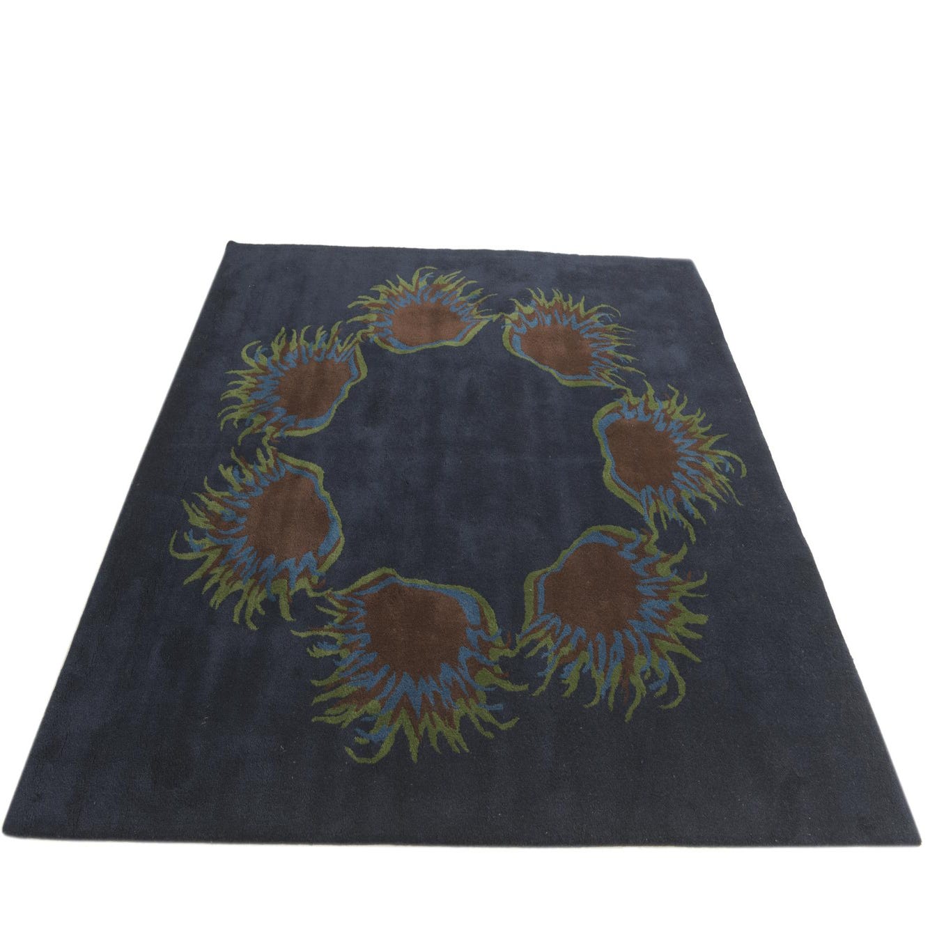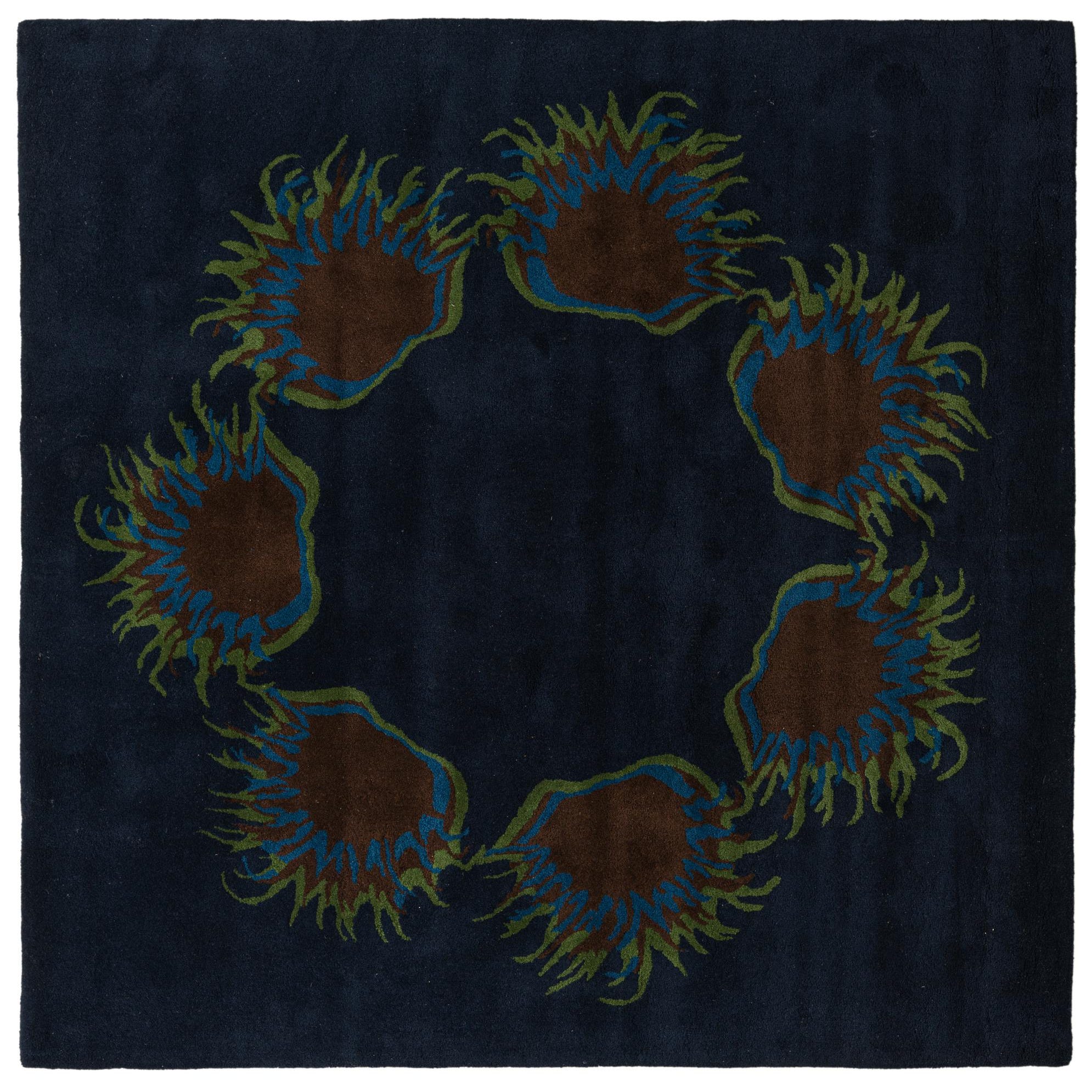 A 7' 7 x 7' 7 square navy blue wool rug with a circular floral pattern featuring brown, blue, and green botanical elements.