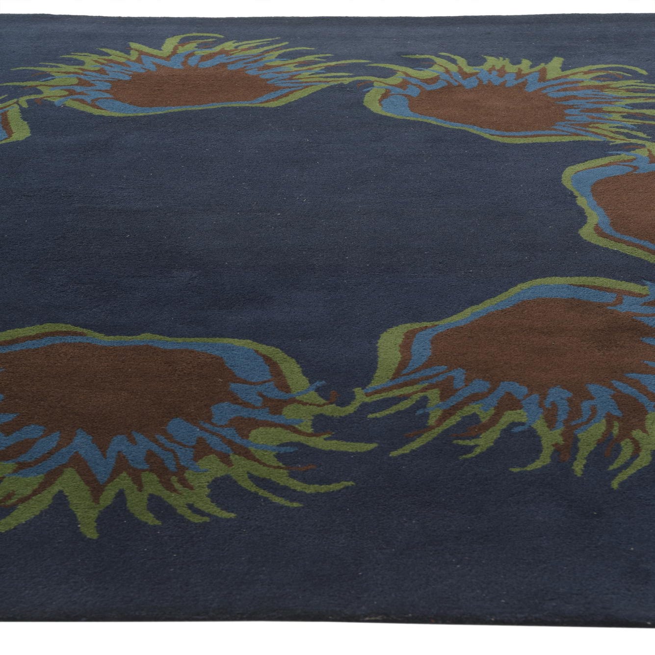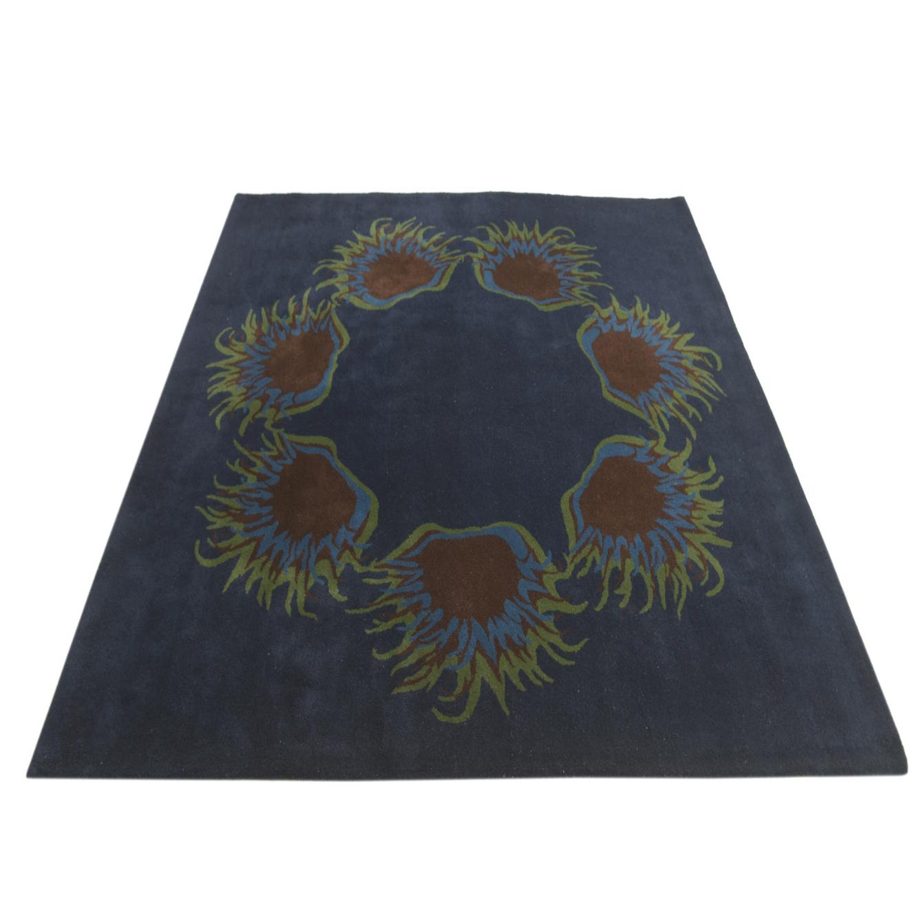 A 7' 6 x 7' 7 square navy blue wool rug featuring a circular floral pattern with brown, blue, and green botanical elements.