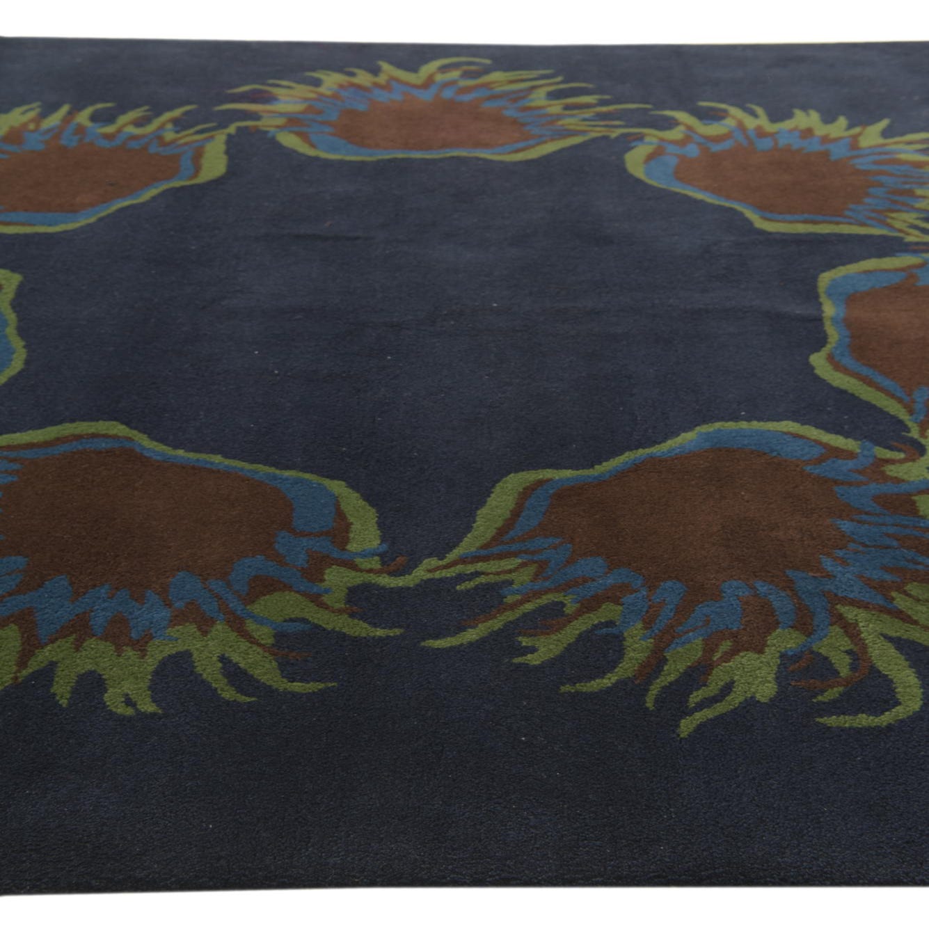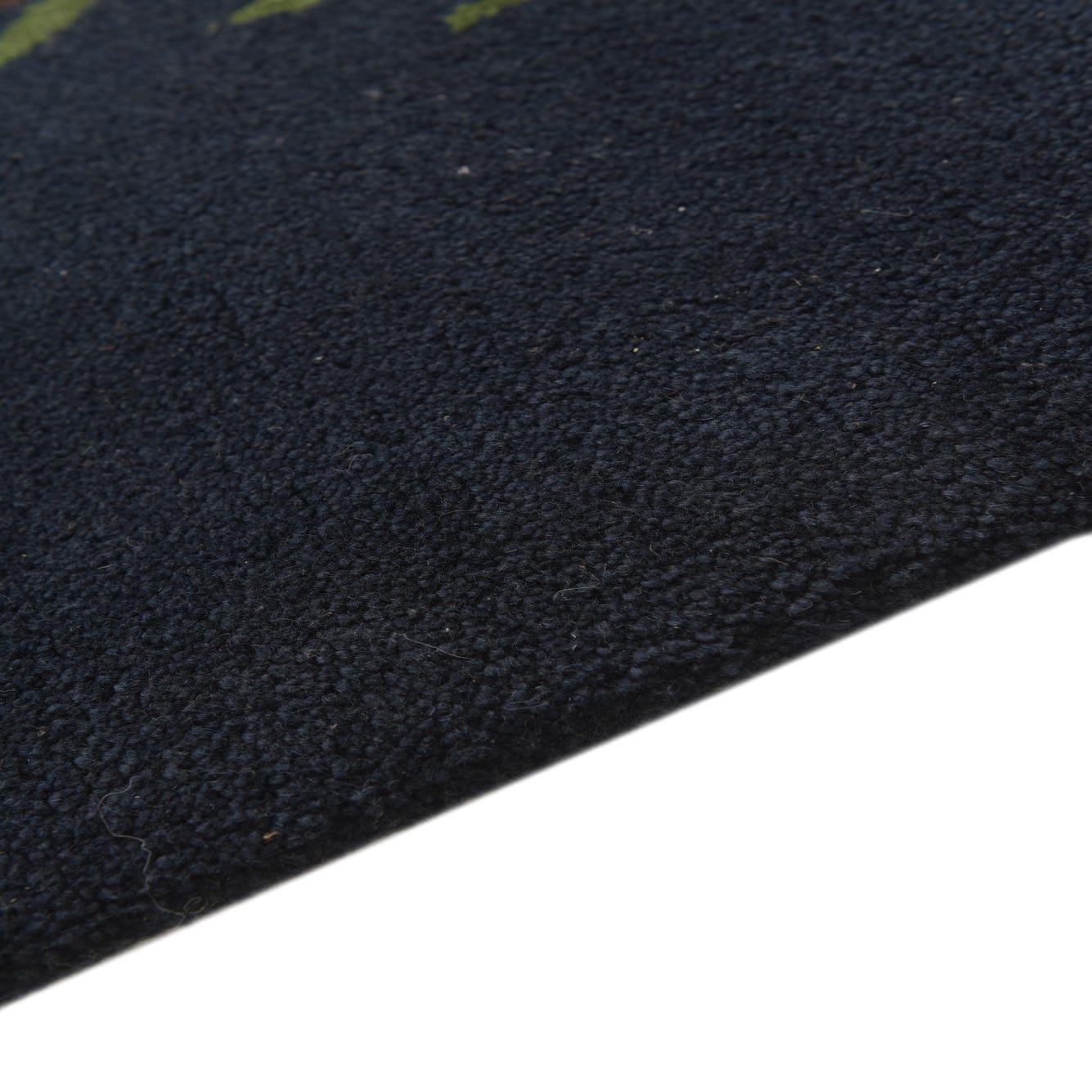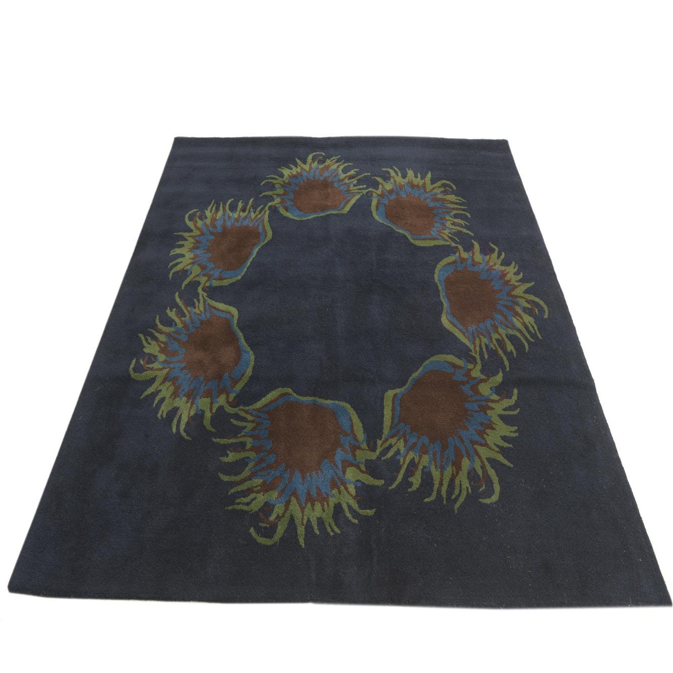 A square navy blue wool rug with a high pile, featuring a circular floral pattern of brown, blue, and green botanical shapes.