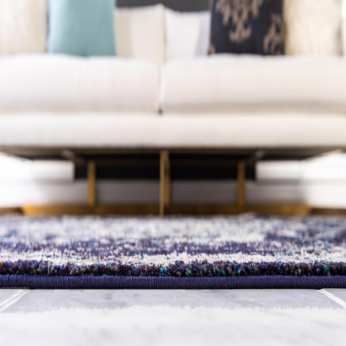 Machine-made from 100% polypropylene, the rug has a low, smooth pile with a tightly woven feel that lies flat underfoot and highlights the detailed pattern. Its balanced colorway suits a range of interiors — place it beneath a sofa to ground a living room, layer it under a dining table to introduce pattern without overwhelming, or use it in a home office or entry where a refined traditional touch is desired. The mix of navy and neutral tones pairs well with crisp whites and warm woods, or with cool grays and contemporary furnishings for a transitional look.