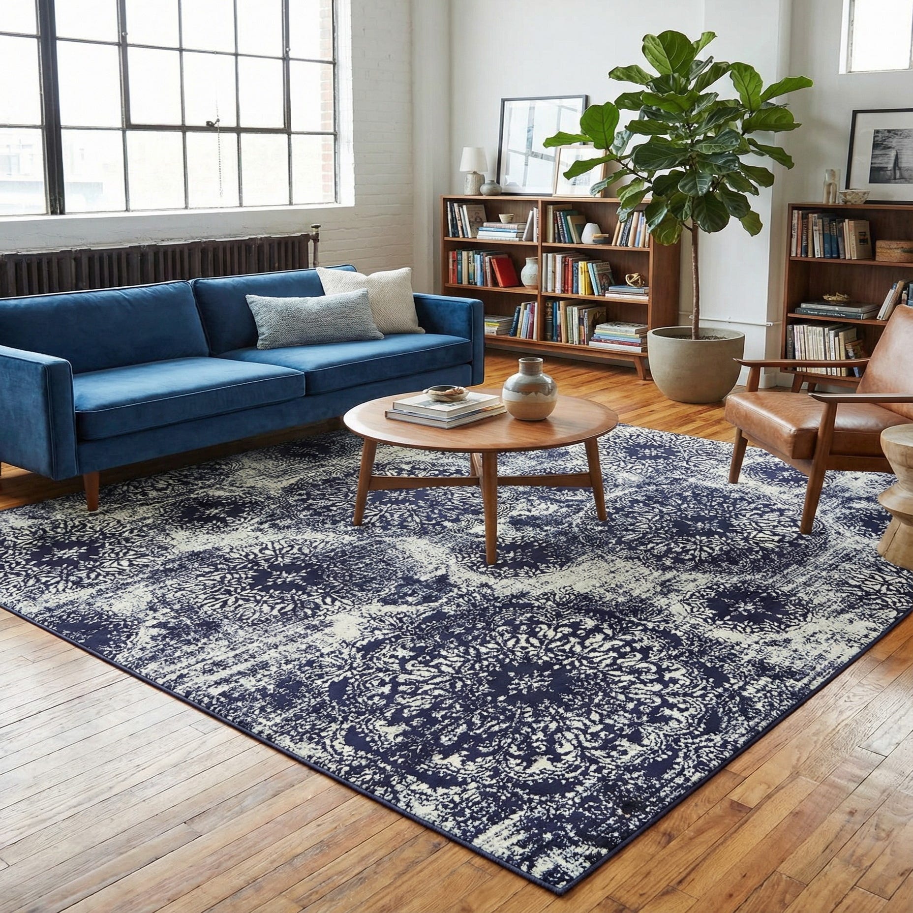 Primary color is Navy Blue. Colors in this rug include: Navy Blue, Ivory.
