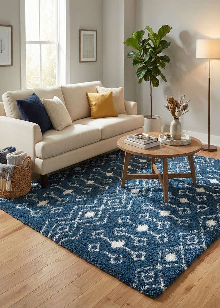 The bold navy and crisp ivory palette works well to anchor a living room seating area, soften a bedroom floor at the foot of the bed, or define a cozy reading nook. Pair it with light wood furniture and neutral upholstery for a fresh, coastal-leaning scheme, layer over warm hardwoods in a transitional space, or use it to add contrast to white or muted-toned décor in casual contemporary and eclectic interiors.