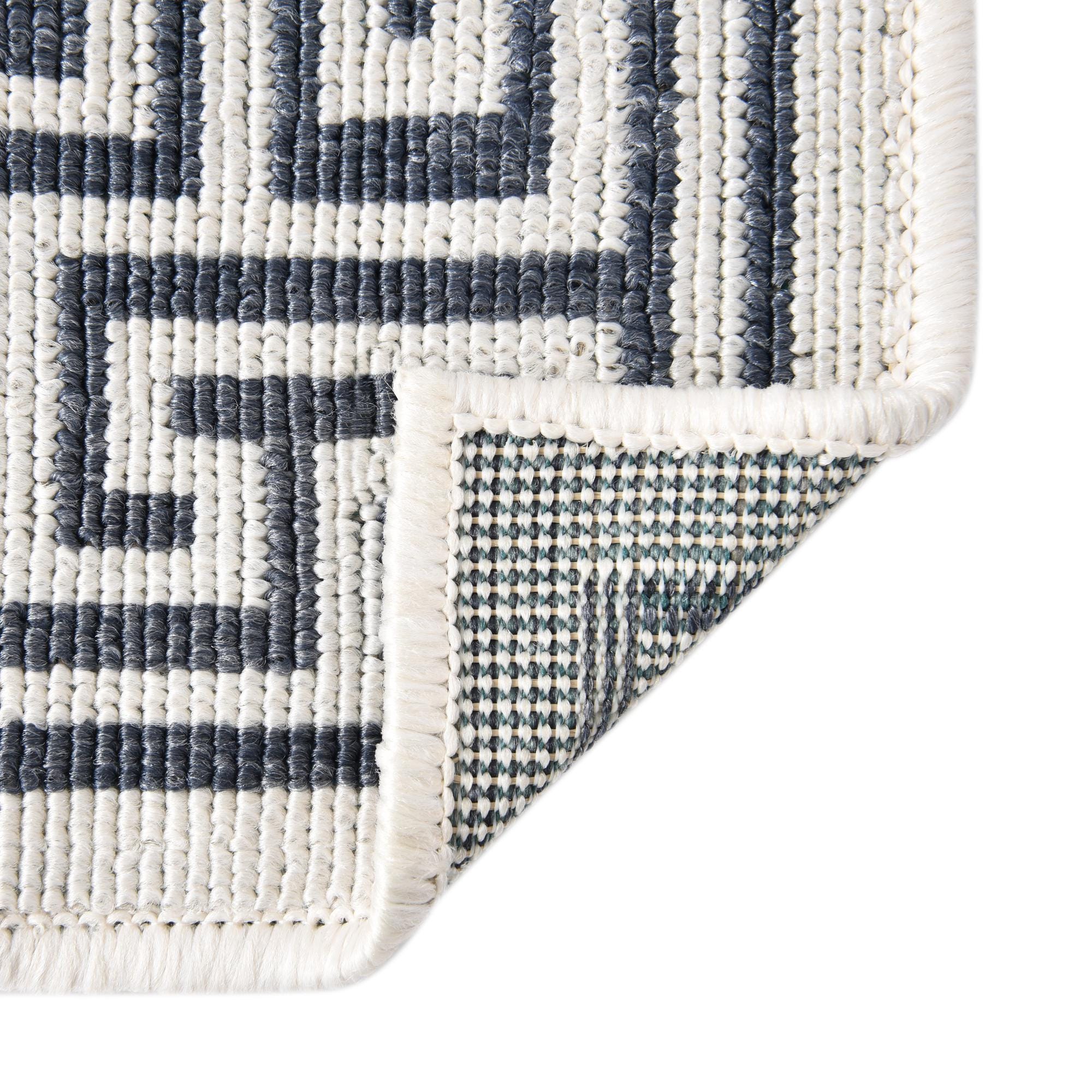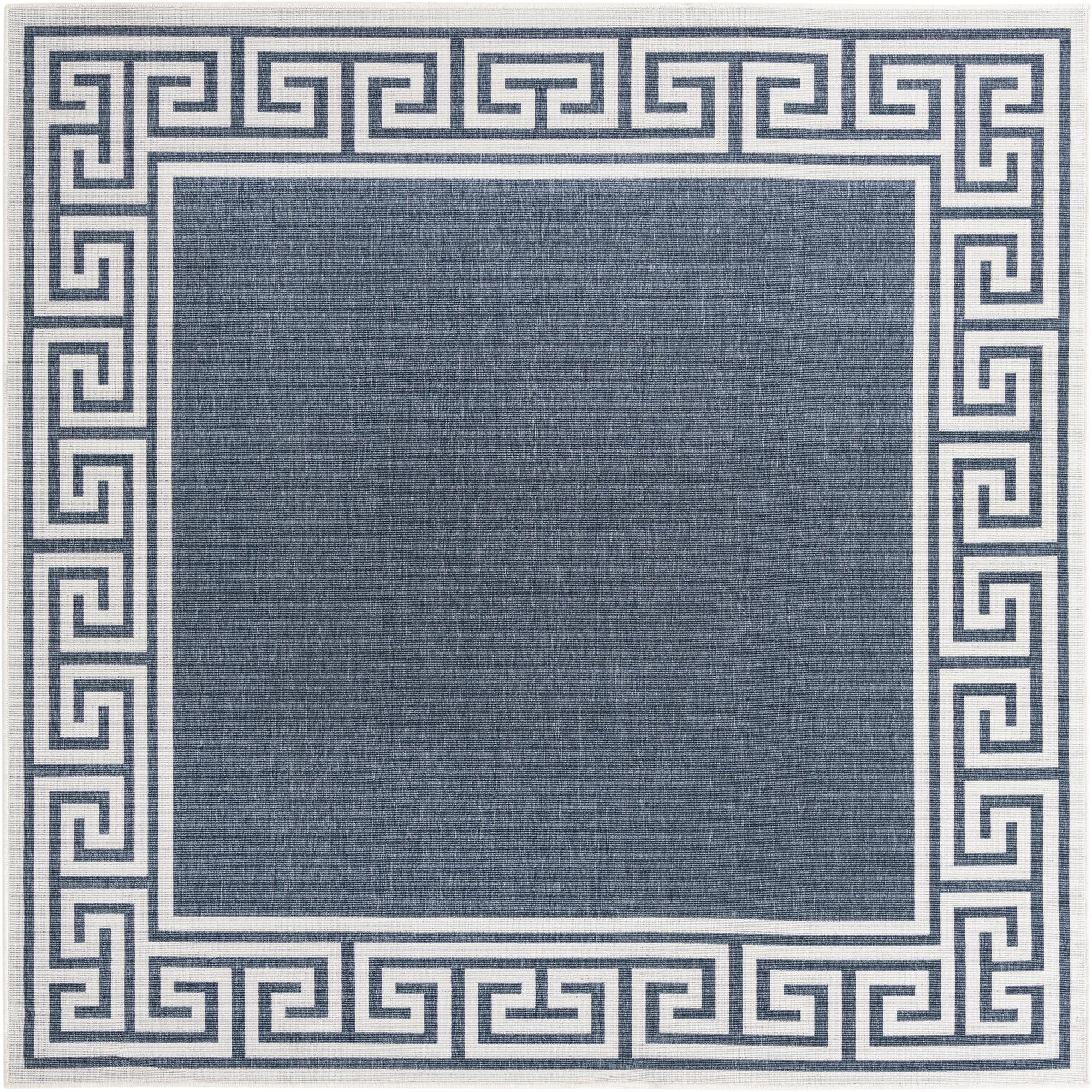 The pattern showcases an alluring Greek key design framing the edge in an ivory tone, set against a deep navy blue background that evokes a sense of coastal elegance. The simplicity of the two-color palette allows for versatile styling options. This stain-resistant rug can effortlessly complement an array of décors, from a seaside-themed patio setting to a minimalist outdoor lounge area, enhancing the space with its sophisticated geometric motif.