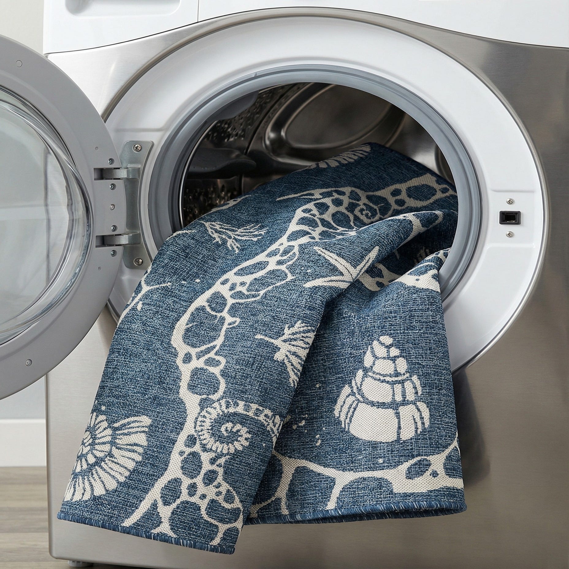 A deep navy field sets a calm, coastal tone while crisp ivory motifs—seahorses, spiral shells, starfish and delicate coral branches—form horizontal, lace-like bands across the surface. The marine illustrations have a hand-drawn quality, with open, airy coral shapes weaving between the motifs to create a layered visual effect. Underhand, the rug has a low-profile, slightly textured weave you can feel, giving the pattern gentle dimensionality without a high pile.