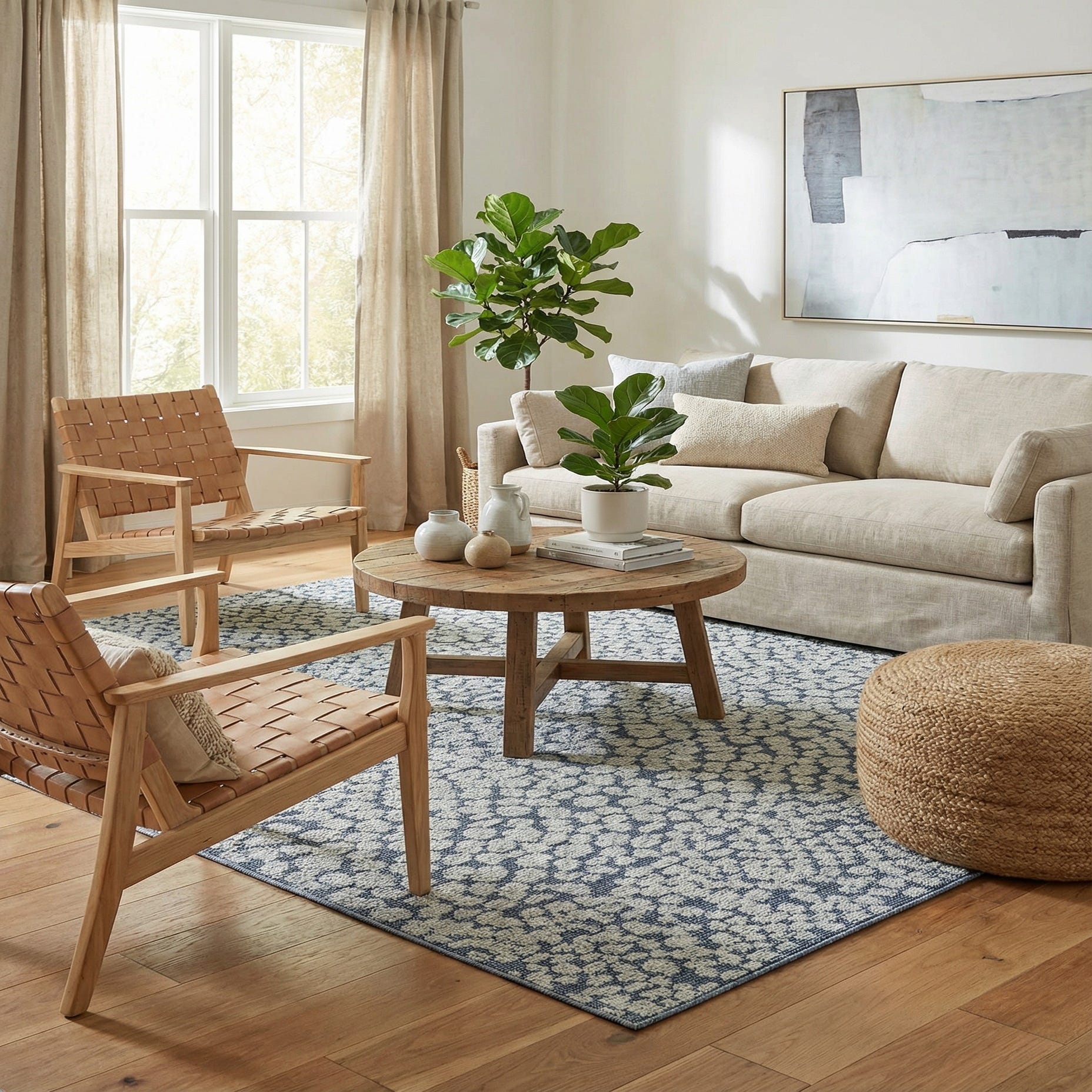A square 7' 10 x 7' 10 navy blue and light blue modern abstract rug with a pebble-like pattern, suitable for indoor or outdoor use.