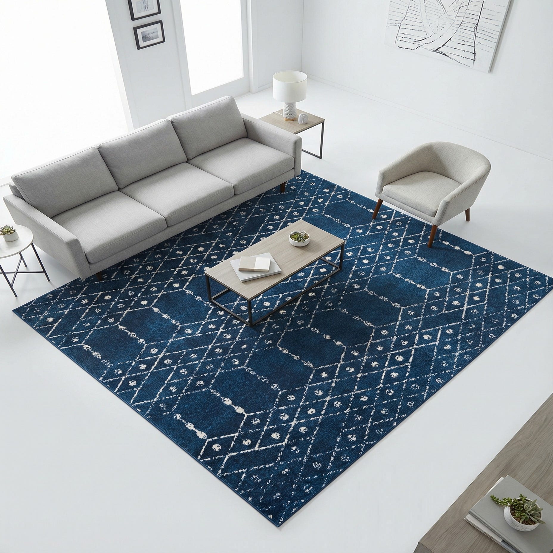 This design works well as an anchor for a seating area in a contemporary or transitional living room, bringing contrast to light upholstery and warm wood tones. It also pairs nicely with crisp white linens and nautical accents in a bedroom, or beneath a square dining table to add pattern without overwhelming the space. The navy-and-ivory palette adapts easily to coastal, modern, or mid-century inspired interiors that benefit from a clean, graphic foundation.
