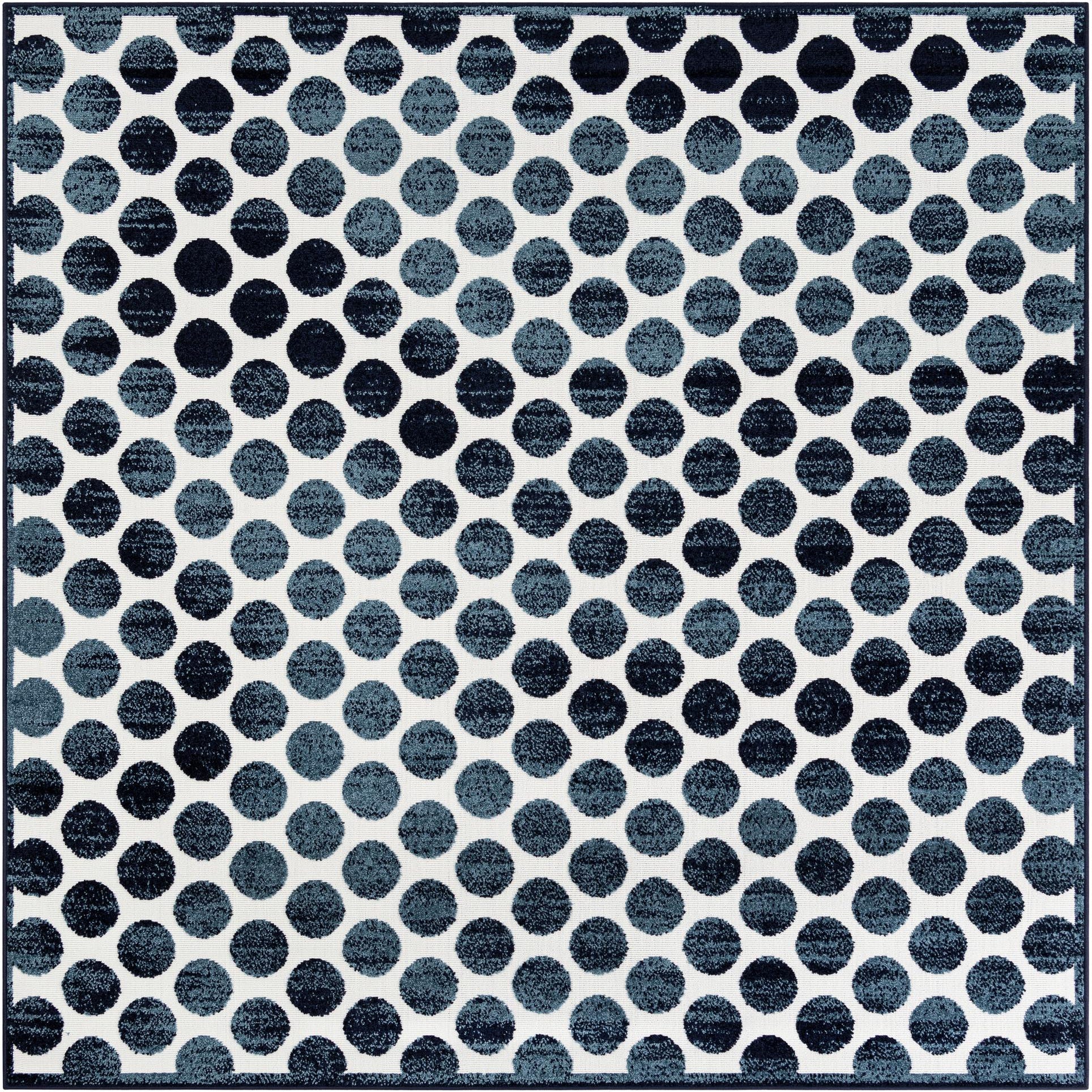 A bold polka-dot design set on a deep navy blue ground gives this rug a clean, graphic look. Ivory circles are evenly spaced across the surface, and each dot is formed by a slightly raised, textured pile that catches light and adds subtle dimension. Machine made of 100% polypropylene, the face has a low-profile, resilient feel underfoot—soft enough to walk on yet firm enough for furniture placement.