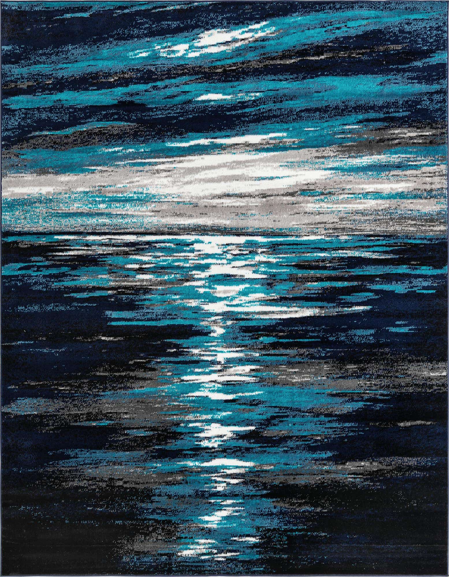 The Sydney Collection rug is a machine-woven piece made from 100% polypropylene, ensuring durability and long-lasting performance. This 8 Ft Square rug features a dynamic, abstract pattern that creates a sense of movement across the surface. The color palette is bold and modern, with a navy blue background accented by stripes and streaks in shades of beige, gray, ivory, and turquoise. The texture is smooth to the touch, providing a comfortable underfoot experience with the added convenience of being stain-resistant and shed-free.