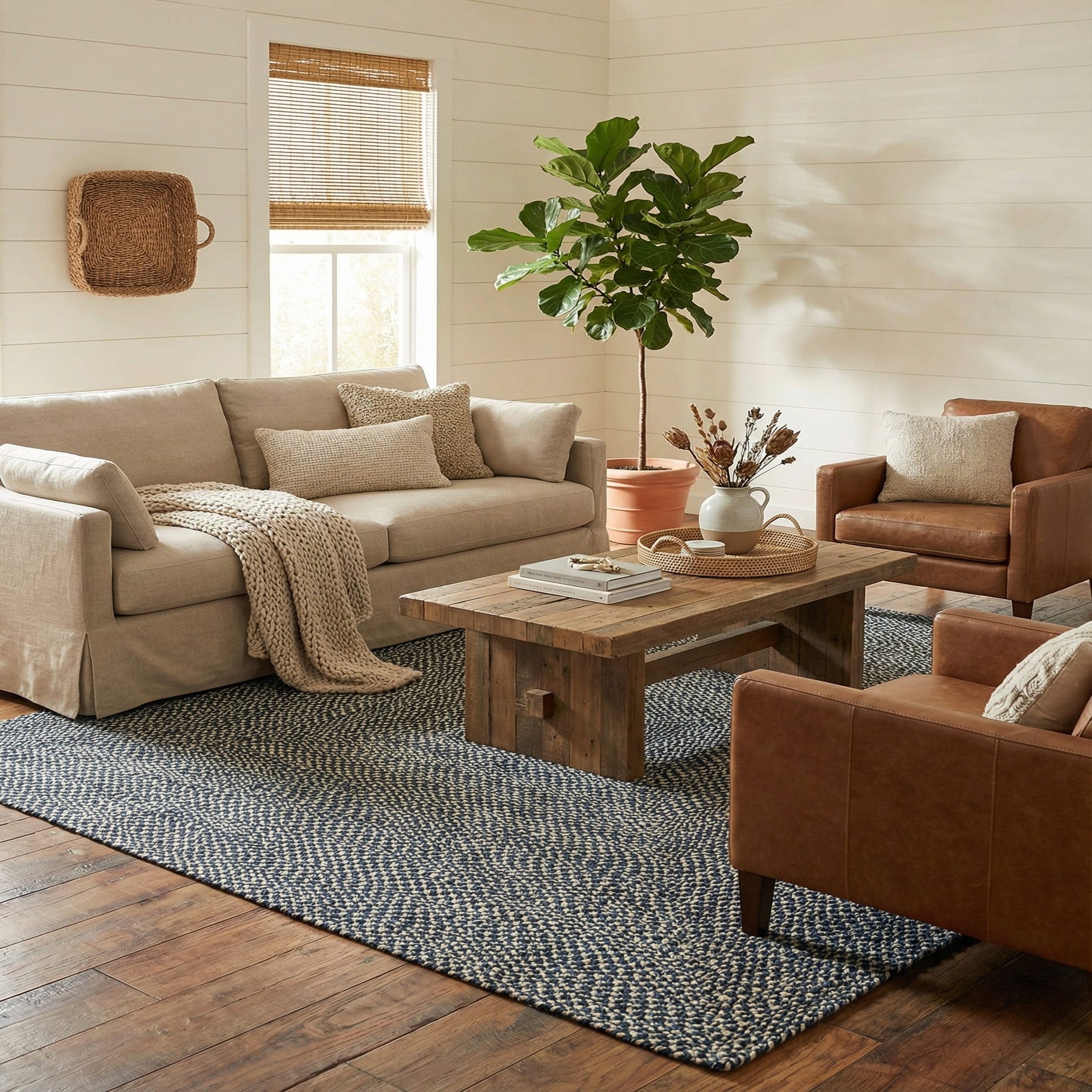 A square 7' 10 x 7' 10 modern braided jute rug in varying shades of blue, showcasing its textured weave.