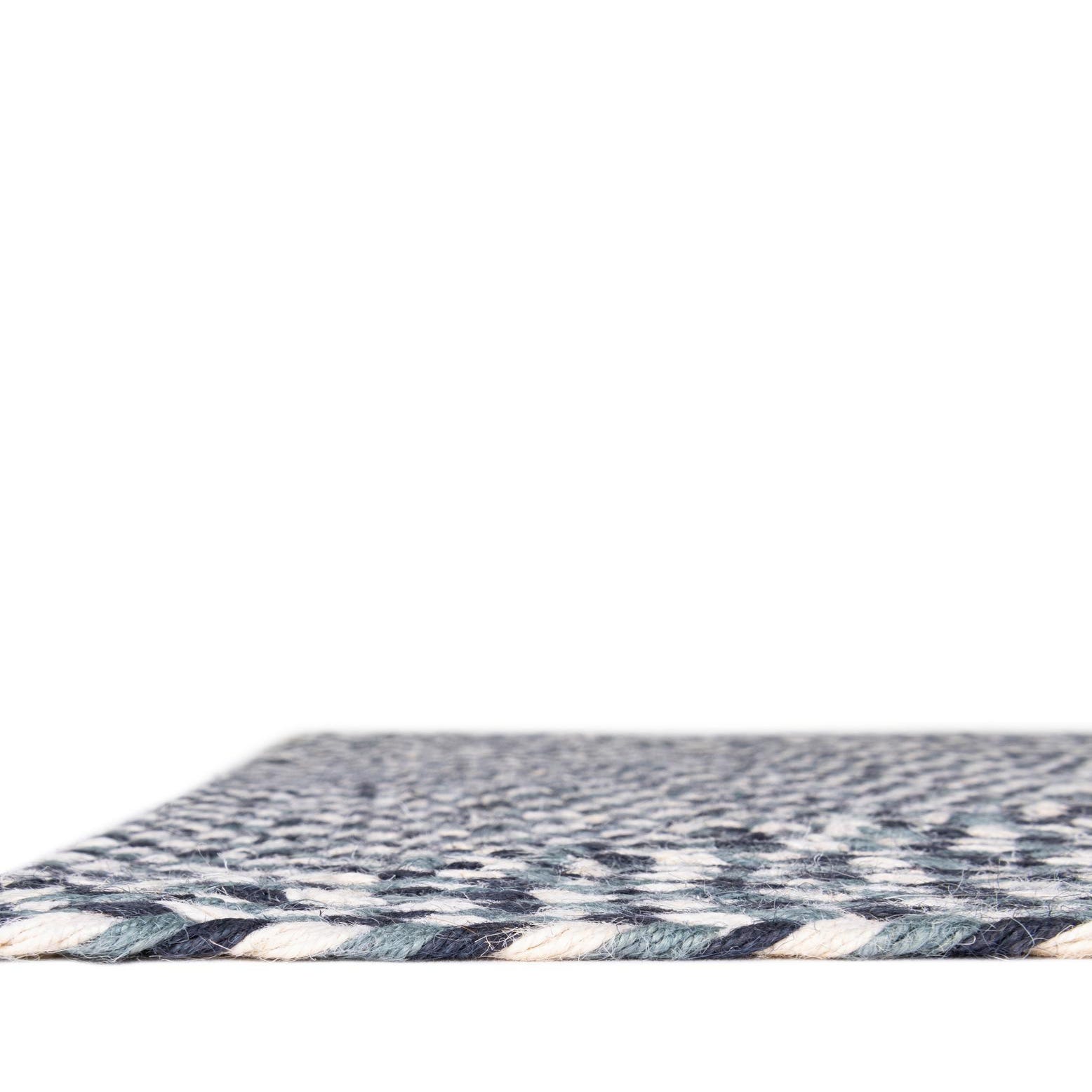 A square 7' 10 x 7' 10 modern braided jute rug in varying shades of blue, showcasing its textured weave.