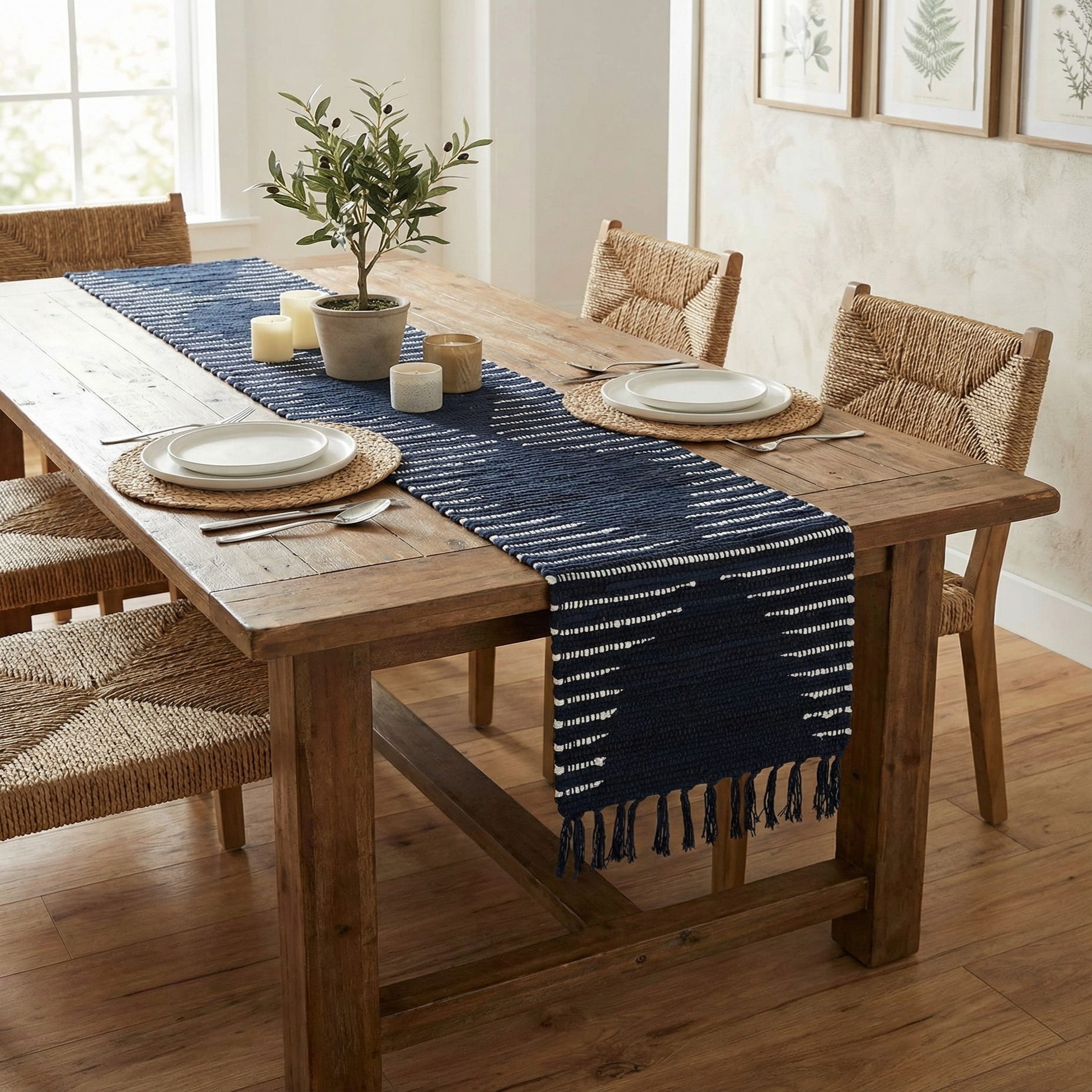 Hand-woven from 100% cotton, this table runner has a sturdy yet soft hand and a low-profile, ribbed texture created by its tight weave. The navy-blue ground forms a deep, consistent backdrop, while irregular ivory dashes and short bands run horizontally across the length, creating a rhythmic, stripe-like pattern. Short tassels finish both ends, adding a casual, handcrafted touch.
