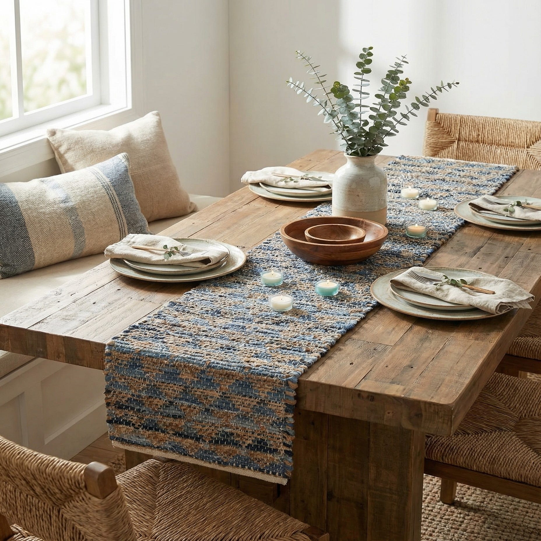This runner suits casual, coastal, and farmhouse interiors as well as modern spaces that favor natural materials. Lay it down the center of a long dining table or use it on a kitchen island or buffet to add warmth and visual interest; it also works well on a console in an entryway. Pair with warm woods, linen tableware, brass or matte black accents, and woven placemats to reinforce its organic, relaxed character.