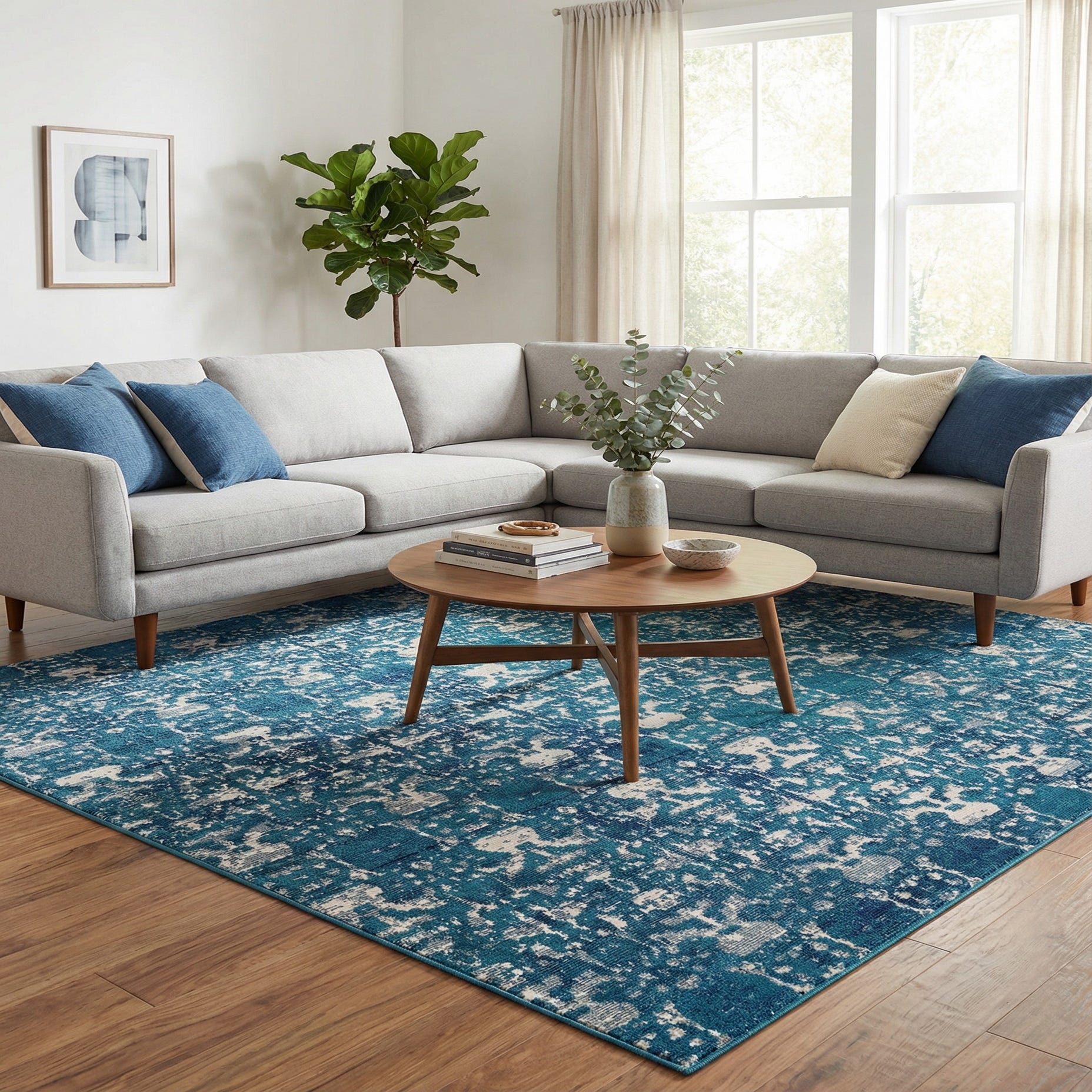 This palette and pattern work well in contemporary, coastal, or transitional interiors. Use it to ground a living room seating area, define a dining space beneath a table, or add color and contrast in a bedroom or home office. Pair with warm wood furniture and brass accents for a coastal-modern vibe, or with clean-lined neutral upholstery to let the pattern play the focal role.