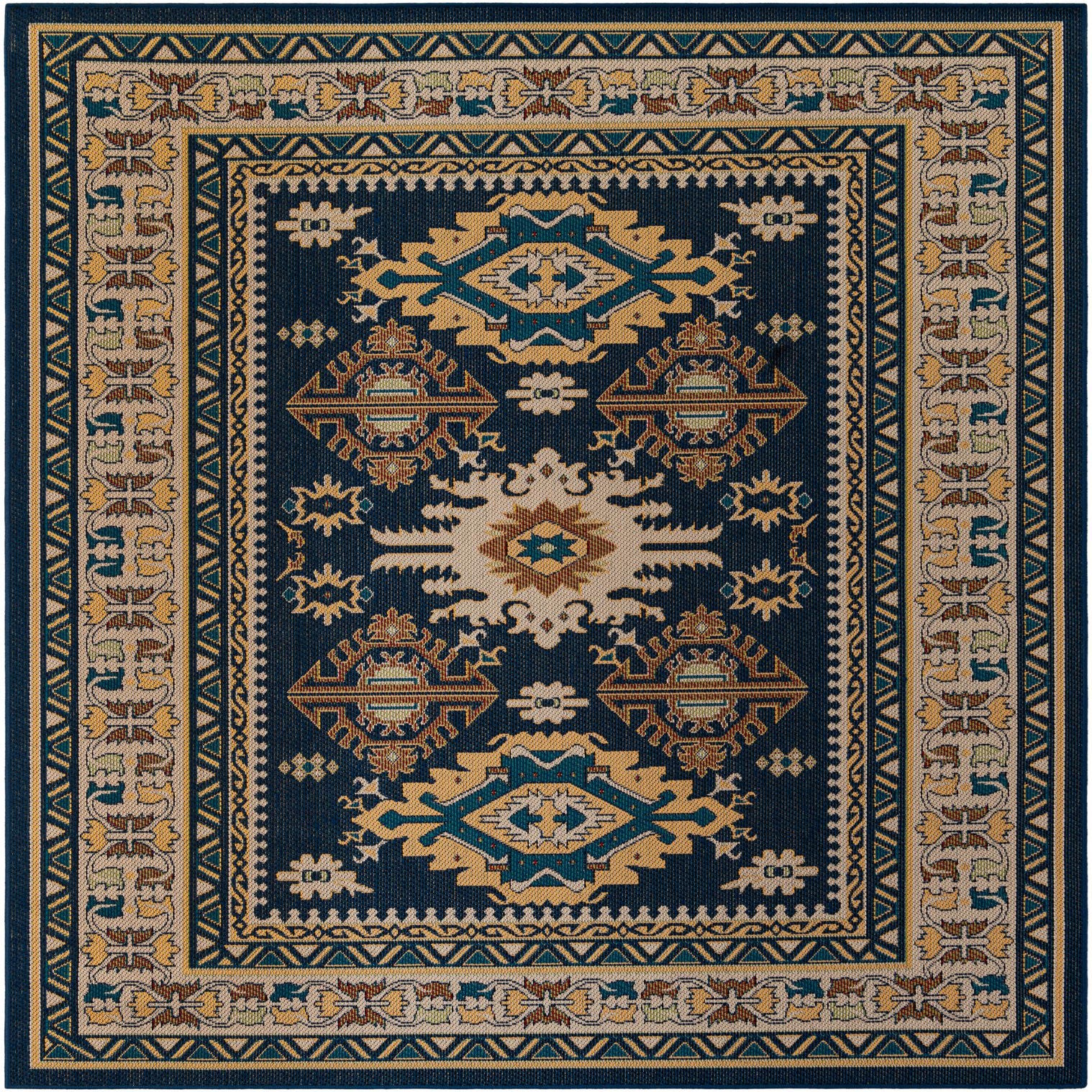 An 8x10 rectangular navy blue indoor/outdoor rug with a traditional Oriental pattern in gold, beige, and teal.