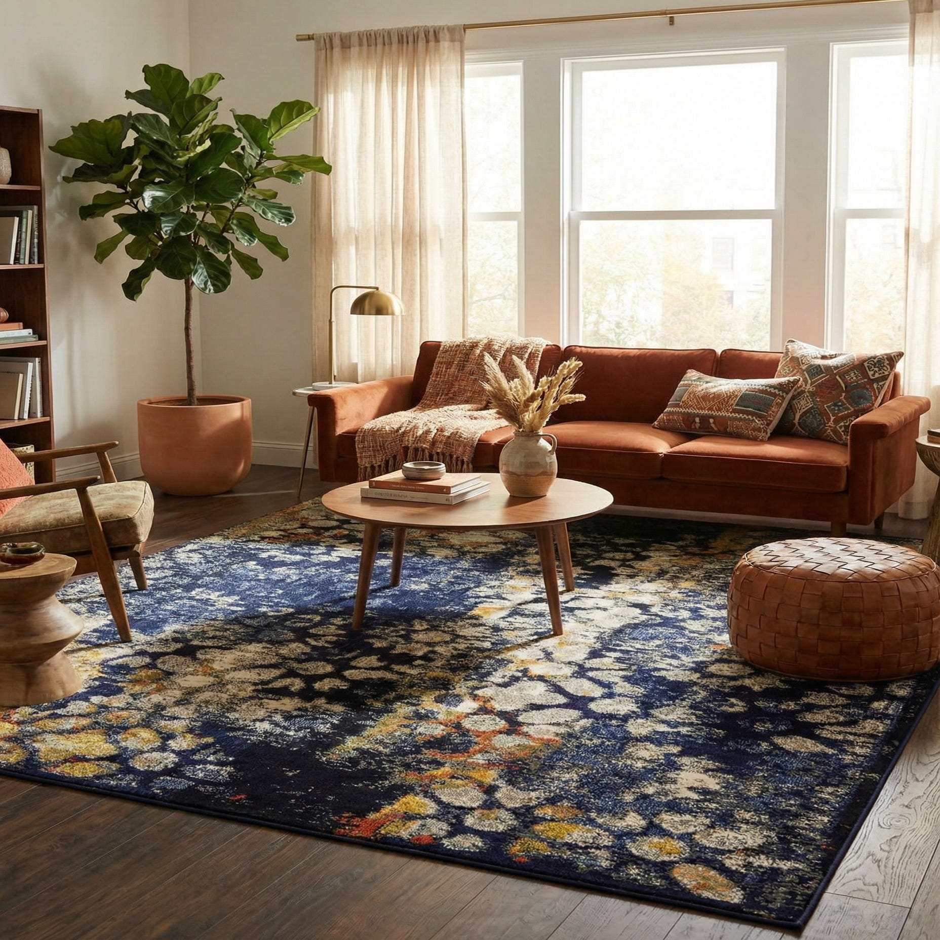 This rug pairs well with contemporary and transitional interiors—place it beneath a low-profile sofa and coffee table to ground a living room, under a dining table to introduce color without overwhelming the space, or layer it in a bedroom for added depth. It complements warm wood tones and leather, as well as cool metal and muted linens; accent with mustard or burnt-orange pillows and soft gray upholstery to bring out the rug’s highlights.