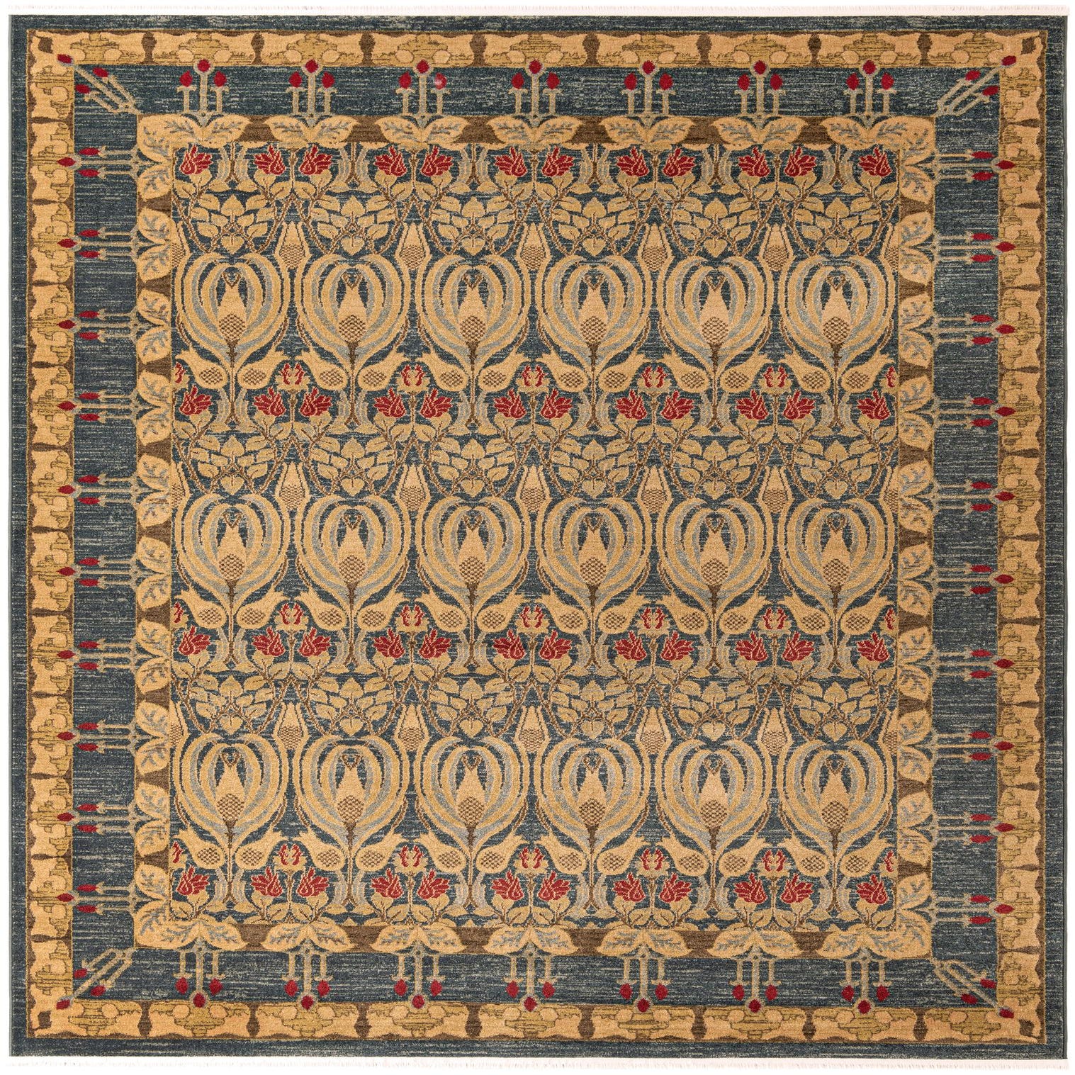 An 8x10 rectangular Chelsea rug featuring a botanical pattern in shades of blue, gold, and red, ideal for a living room.