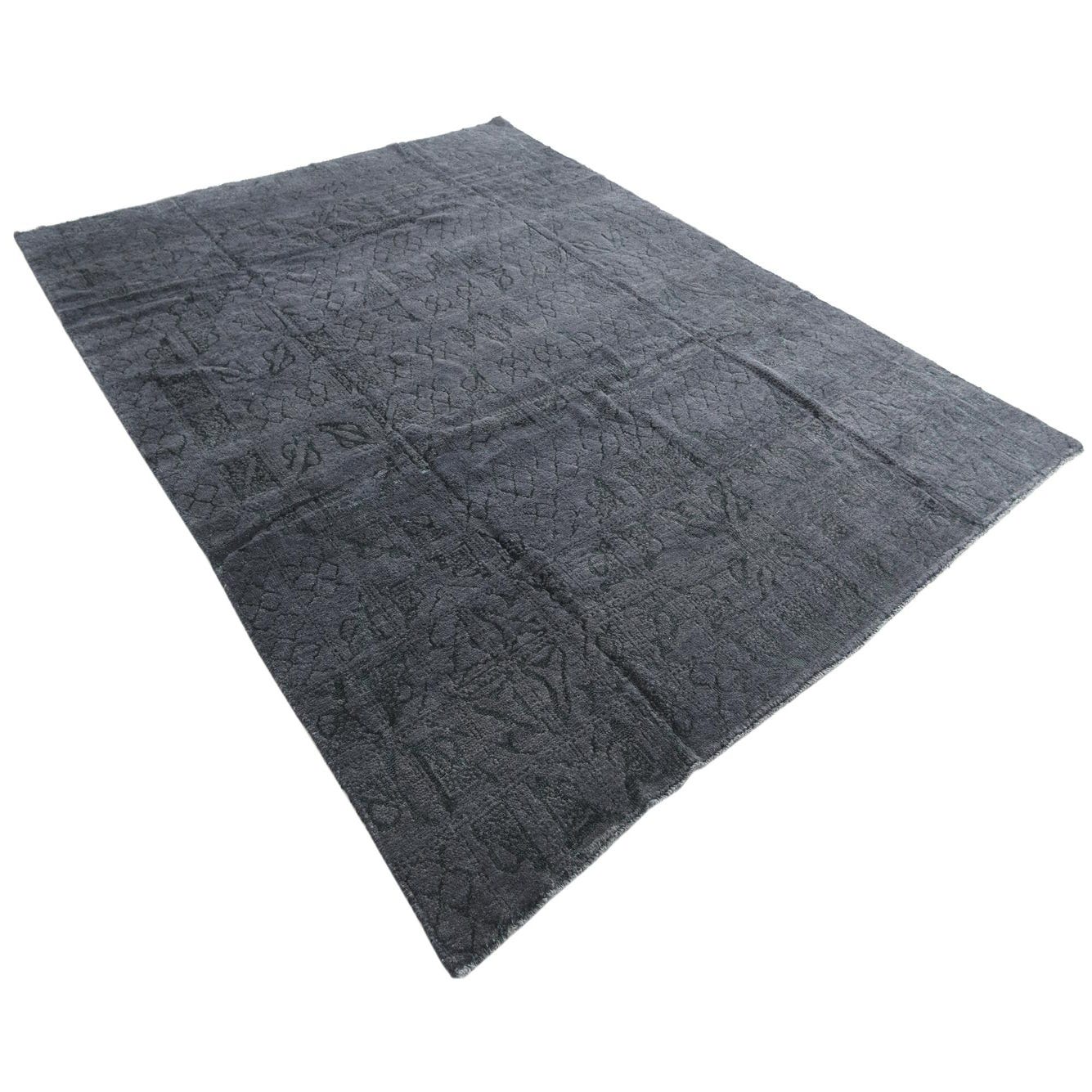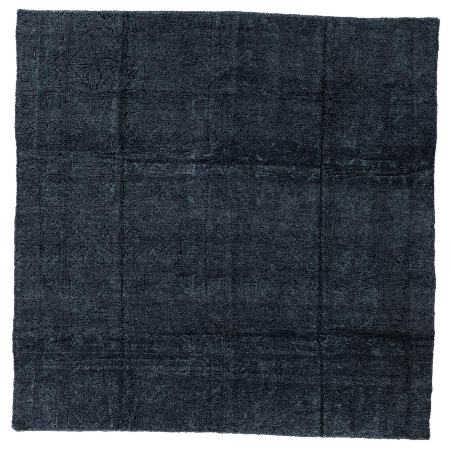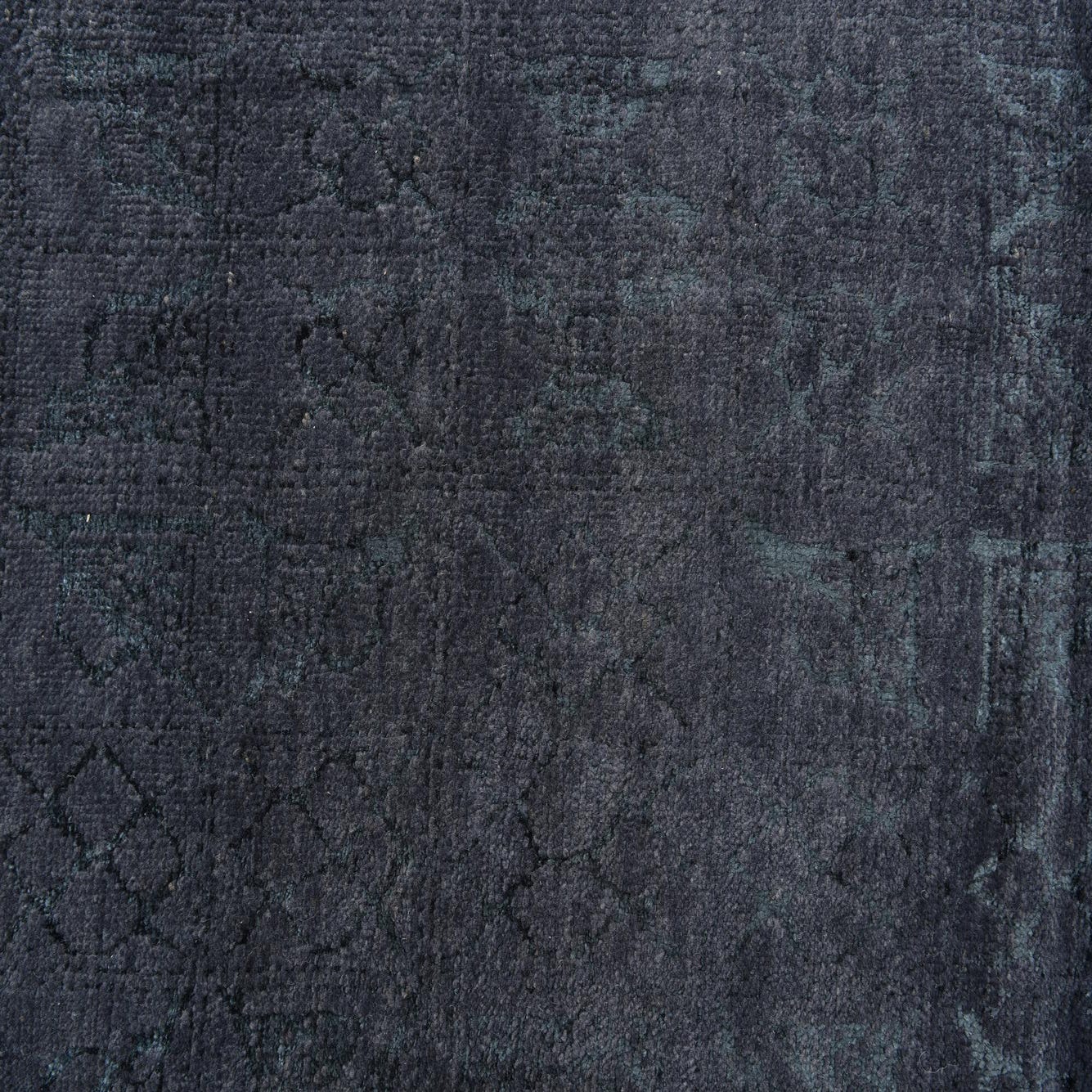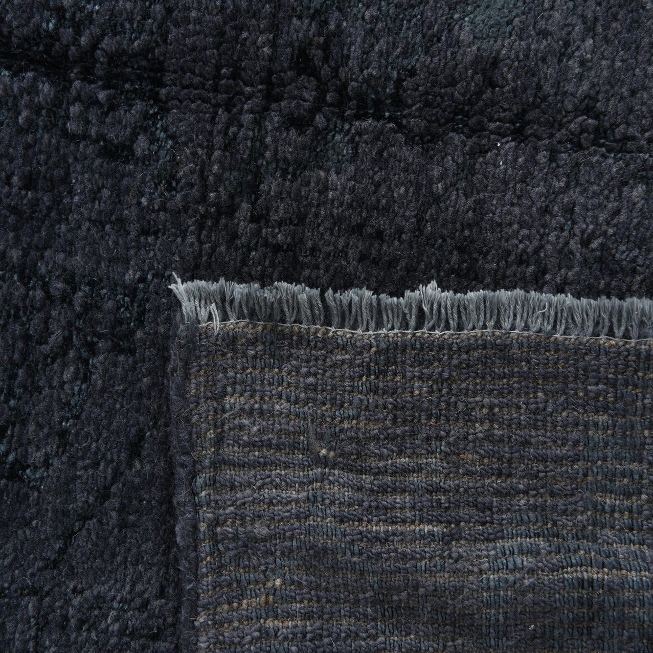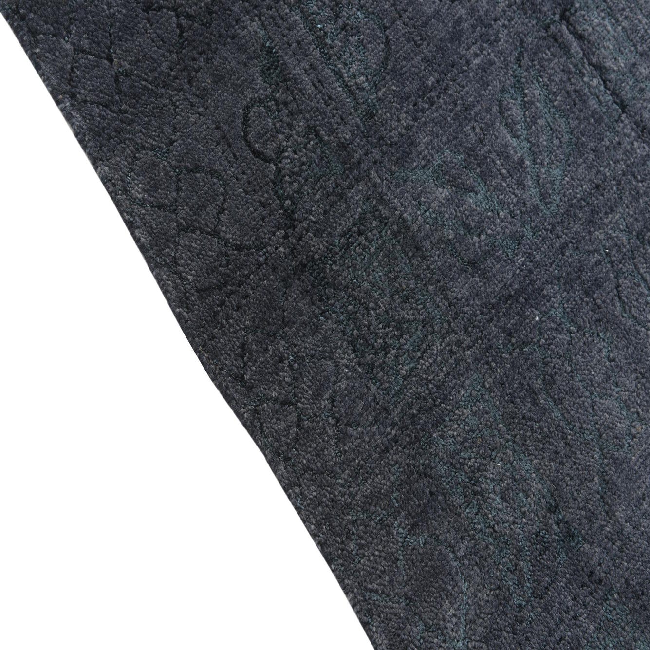 The Darya collection presents an elegant 8x10 hand-knotted rug crafted from a blend of wool and silk. The rug showcases a sophisticated navy blue background, complemented by muted green accents, offering depth and subtle contrast to its overall design. The intricate pattern displayed across the rug is gracefully subtle, revealing its details upon closer inspection, which adds a layer of visual interest without overwhelming the space.