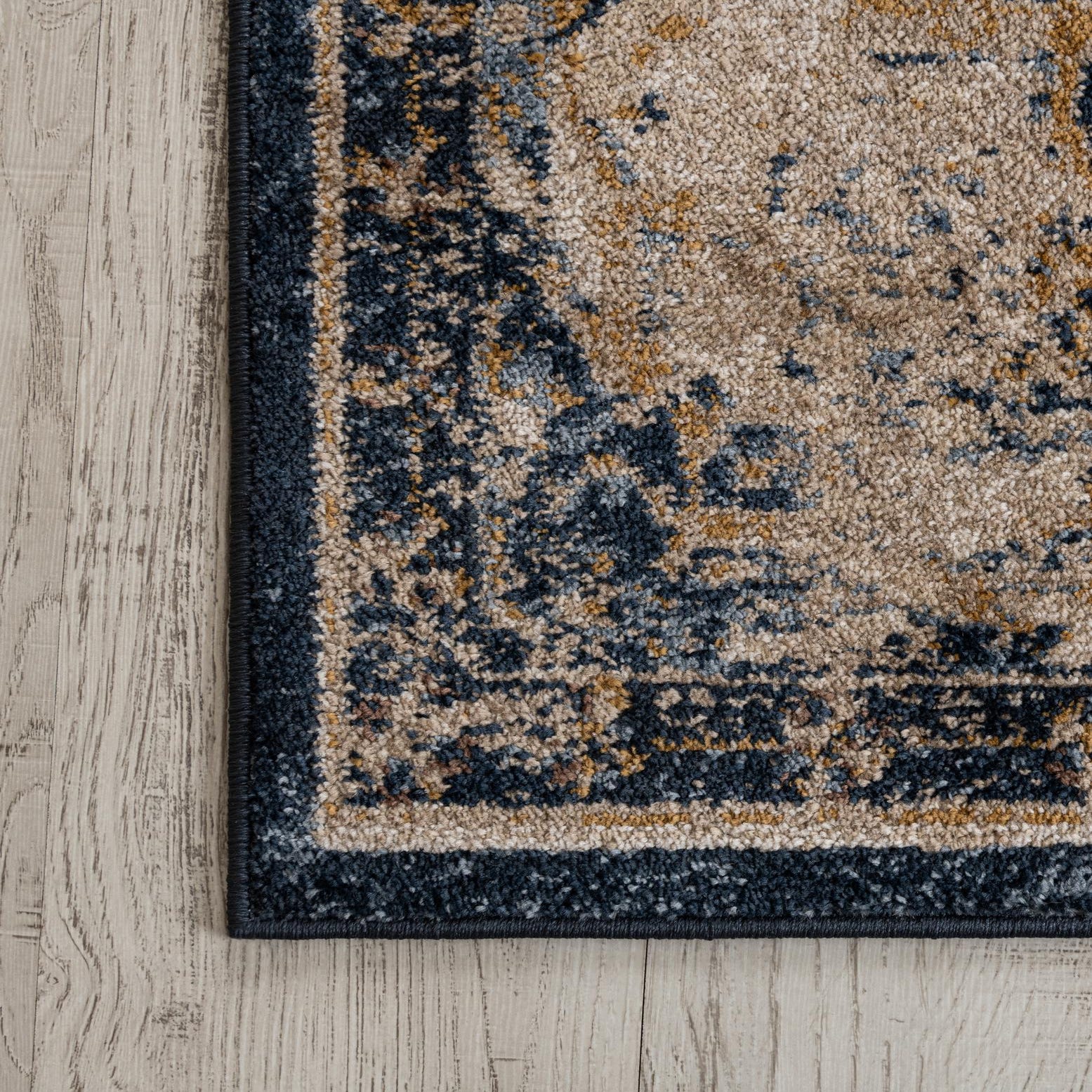 Machine-made from 100% polypropylene, the rug has a low, dense pile with a soft, slightly cushiony hand that’s pleasant underfoot. The navy ground anchors a room while the ivory and gold accents brighten the composition, making this piece a strong choice for a living room beneath a sofa and coffee table, under a dining table to tie chairs together, or layered at the foot of a bed. Pair it with warm wood tones and brass or matte-black hardware for contrast, or with light-blue and neutral textiles to emphasize the rug’s softer highlights.