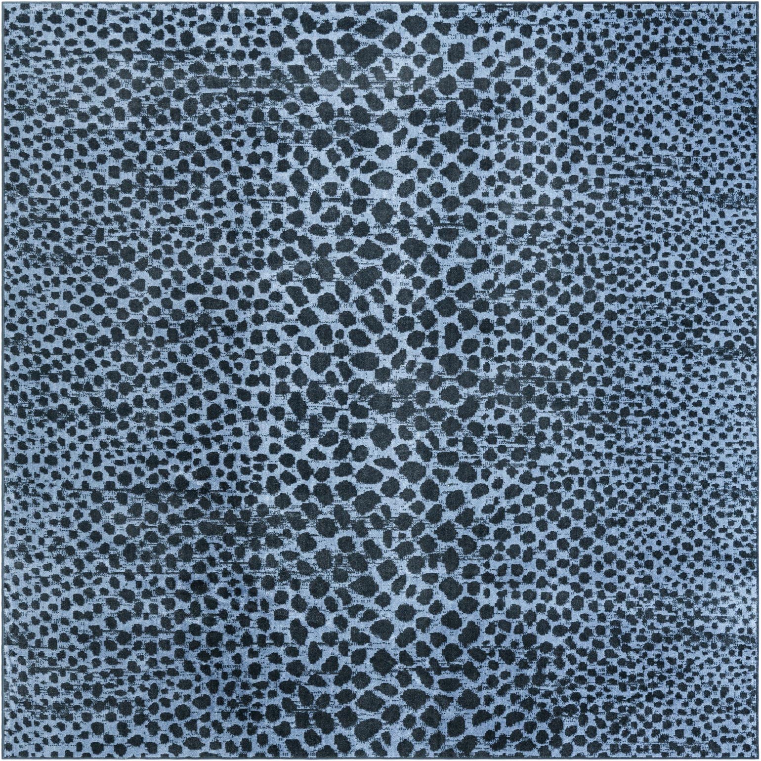A rectangular 8x10 Kamala Washable rug in varying shades of blue, featuring a modern abstract spotted pattern.