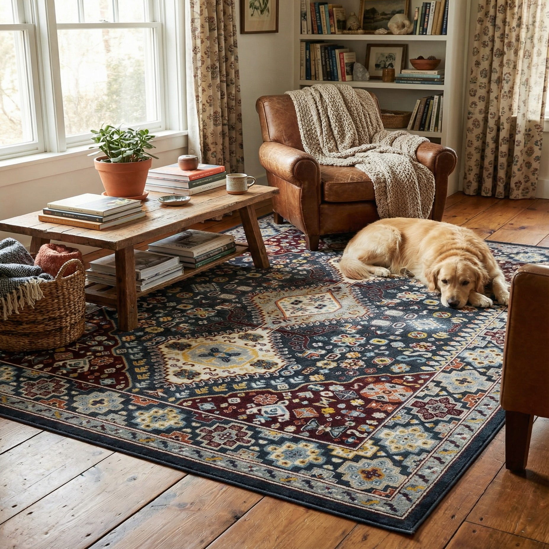Primary color is Navy Blue. Colors in this rug include: Navy Blue, Ivory, Gray, Red, Yellow.