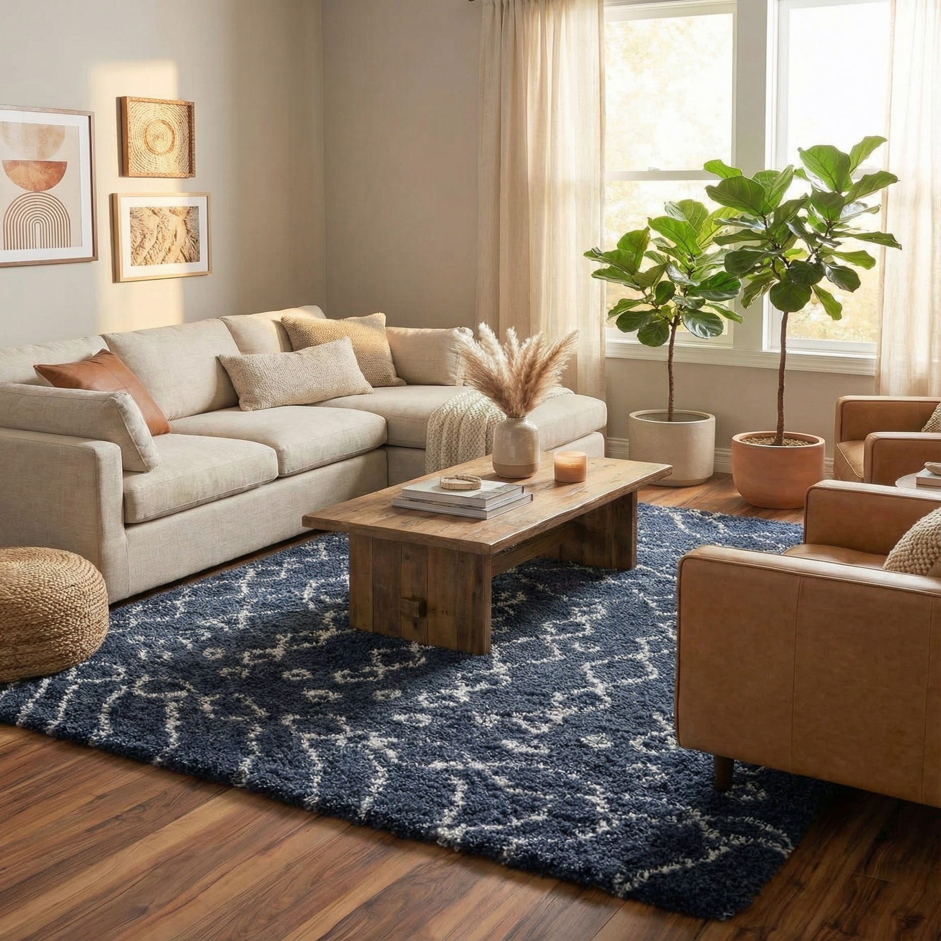 The stark contrast and vibrant hues make this rug a statement piece that would complement a variety of interior design styles. Its sumptuous shag texture aligns well with mid-century modern themes, where it could balance out sleek furniture lines, or with a bohemian decor, where it would add to the layered, eclectic look. The deep navy hue could also anchor a room with nautical influences or serve as a focal point in a minimalist setting, providing a pop of color without overwhelming the space.