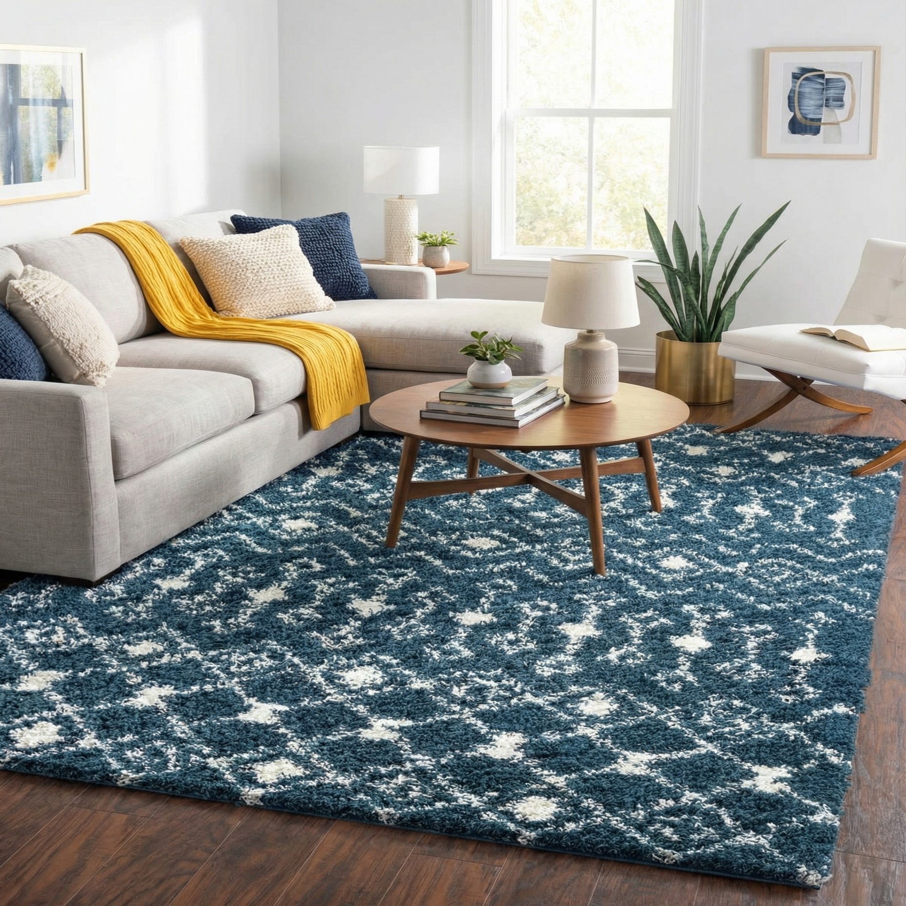 Machine-made of 100% polypropylene, the shag pile feels plush and inviting underfoot with a substantial, slightly lofty surface you can sink your toes into. Use it to anchor a living room seating arrangement, warm up a bedroom beneath the lower two-thirds of the bed, or add cozy texture to a home office. The navy-and-ivory palette pairs nicely with light wood tones, brass or matte black accents, and crisp white trim, working well in coastal, modern farmhouse, or transitional interiors.
