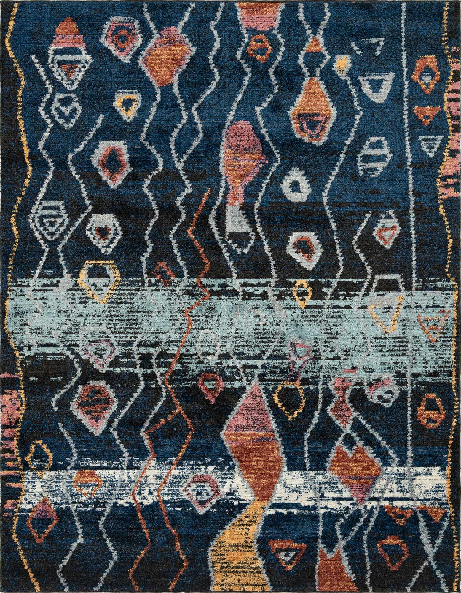Primary color is Navy Blue. Colors in this rug include: Navy Blue, Black, Gray, Ivory, Light Blue, Rust Red, Yellow, Pink.