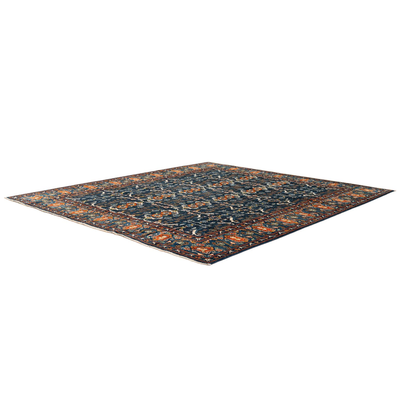 An 8x10 rectangular navy blue Oushak rug with a modern floral pattern and an ornate border.
