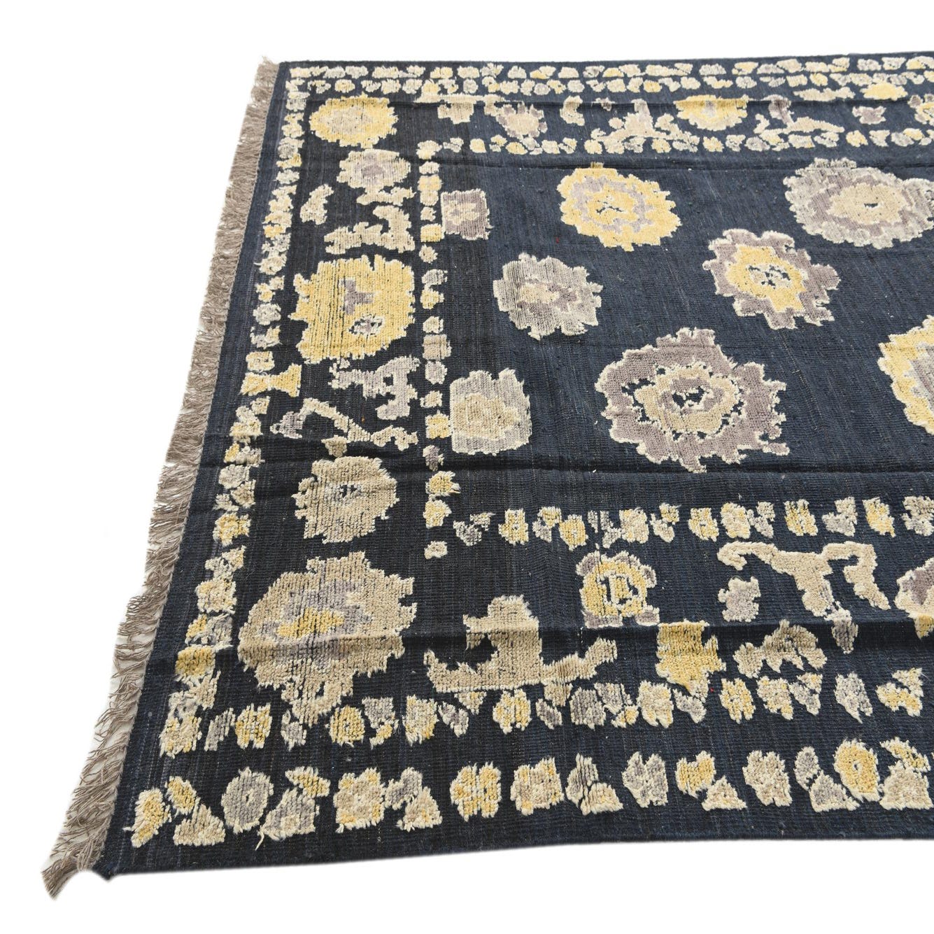 A rectangular 8x10 navy blue wool rug with a modern abstract pattern of yellow and grey floral shapes, featuring fringed edges.