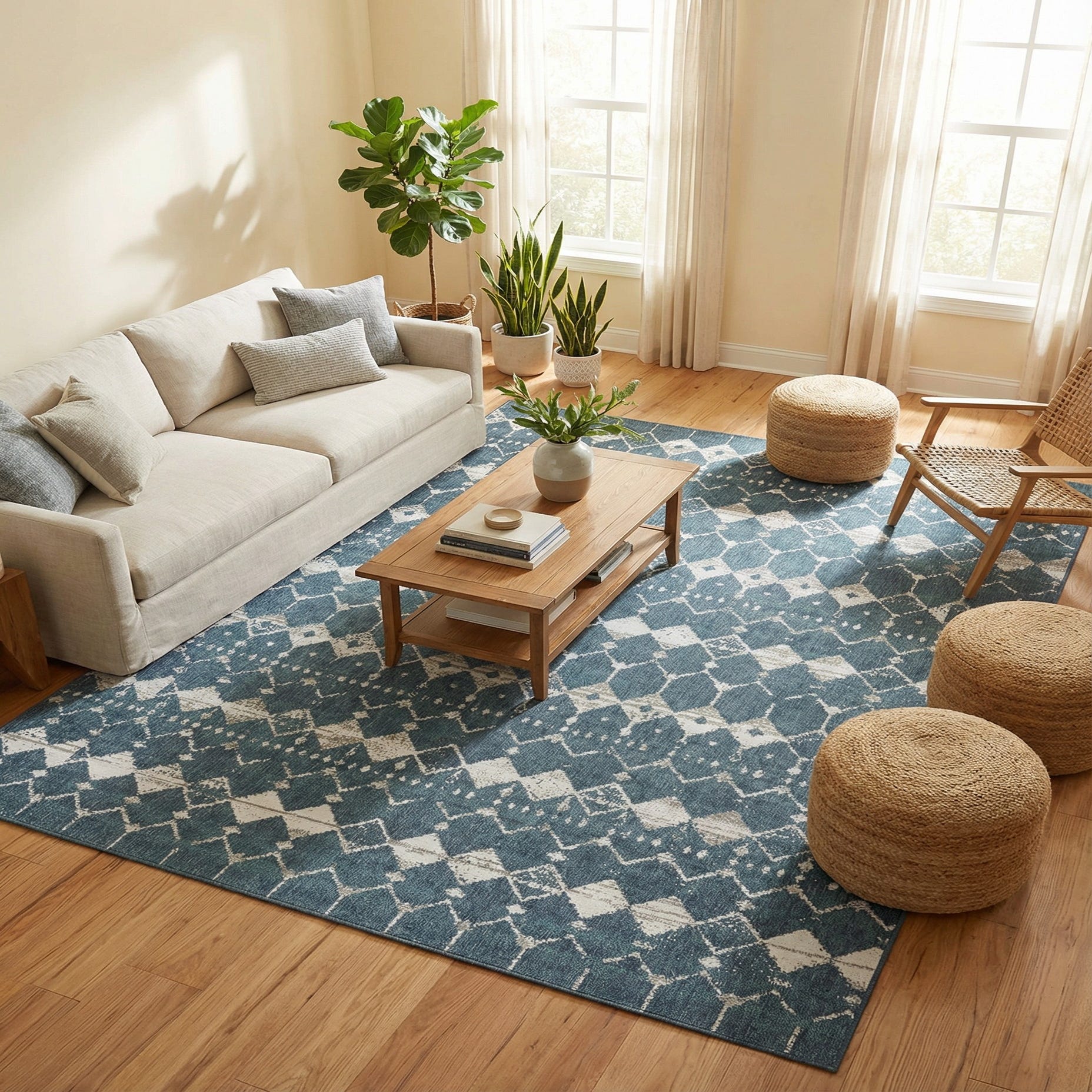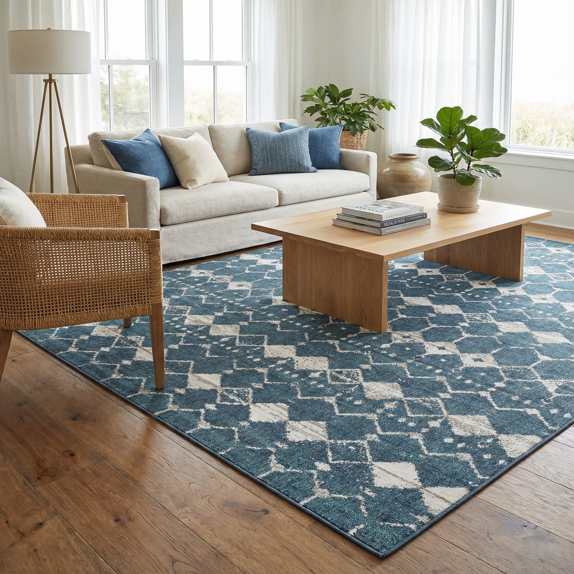 Machine-made from 100% polypropylene, the rug has a low-profile, tightly woven surface with a slight texture underfoot. It works well on a covered patio or screened porch as an anchor for outdoor seating, and it also fits easily into a casual living room, sunroom, or mudroom where pattern is welcome but a high pile is not. Pair it with rattan or painted wood furniture, linen upholstery and neutral accents for a coastal or modern-farmhouse vibe, or use it to add contrast beneath a light-colored dining set for an approachable, pulled-together look.