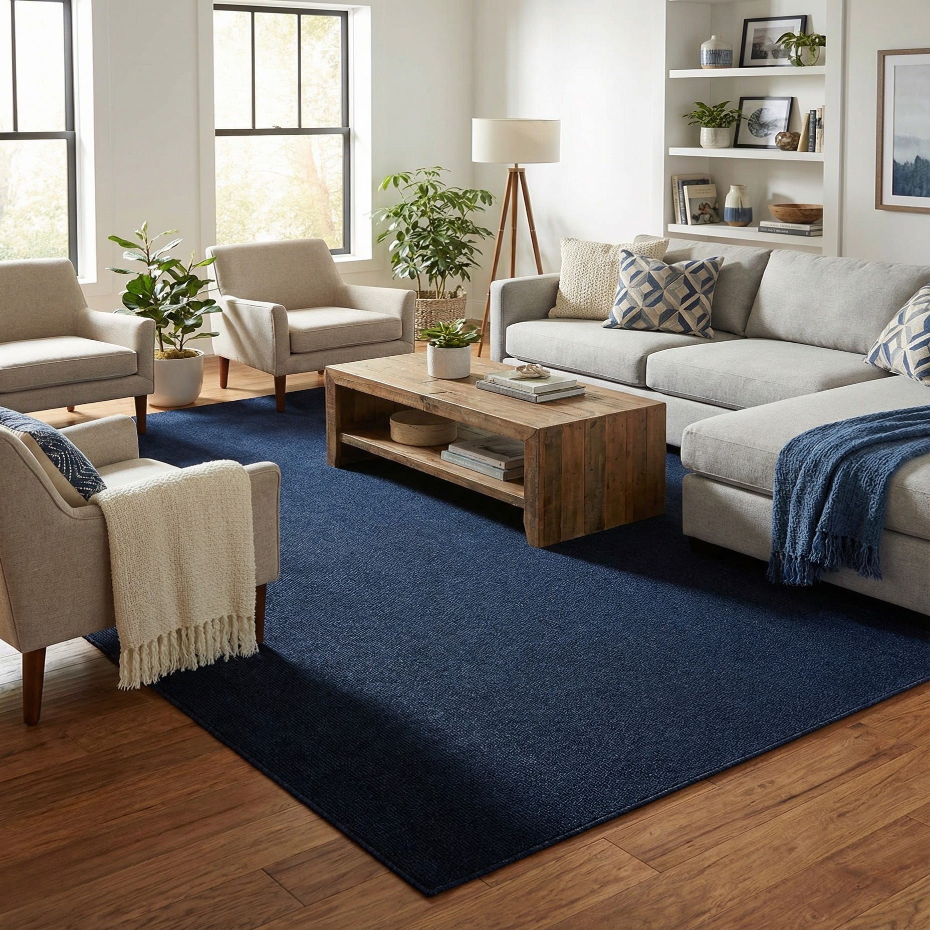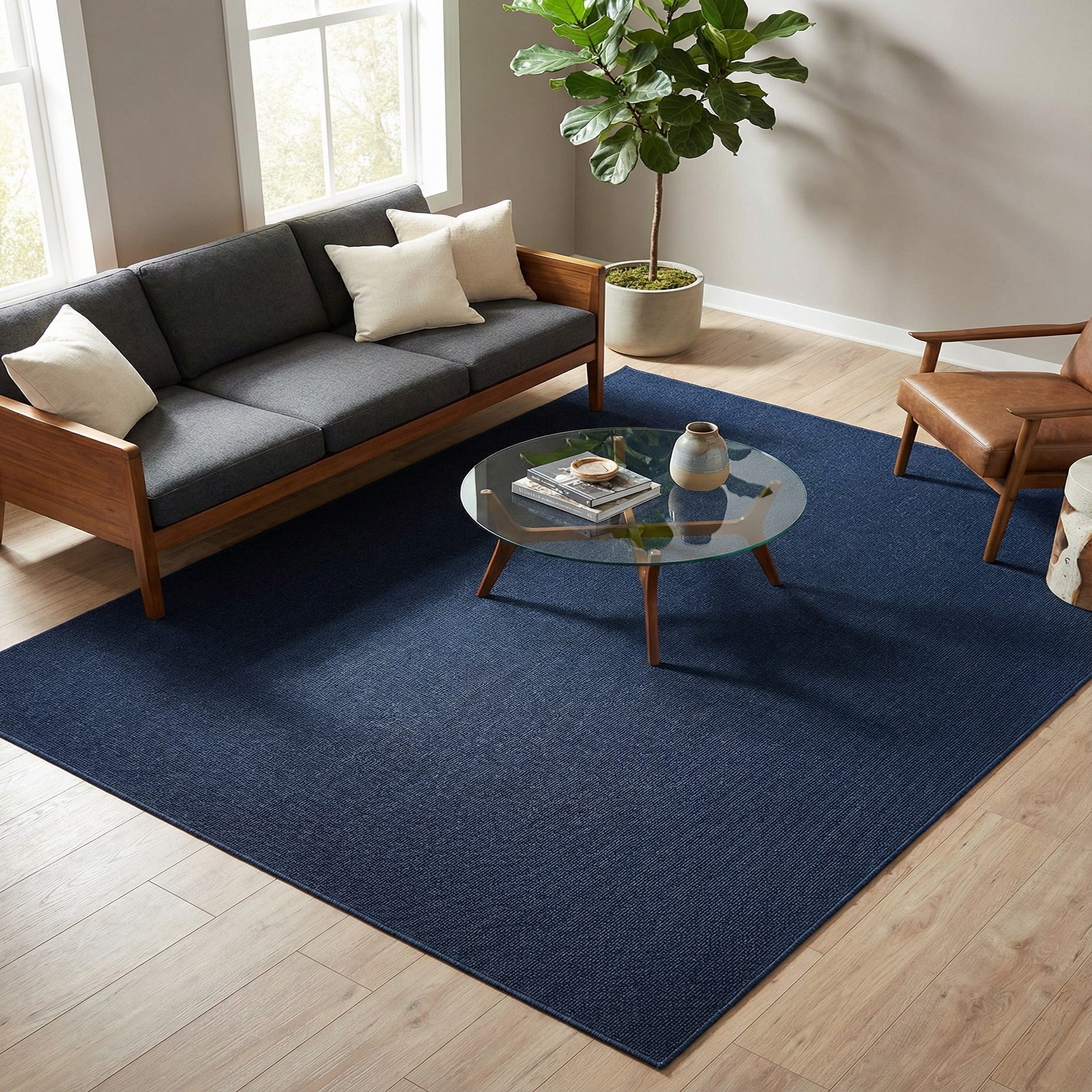A large 8x10 rectangular navy blue solid modern rug, suitable for indoor or outdoor use.